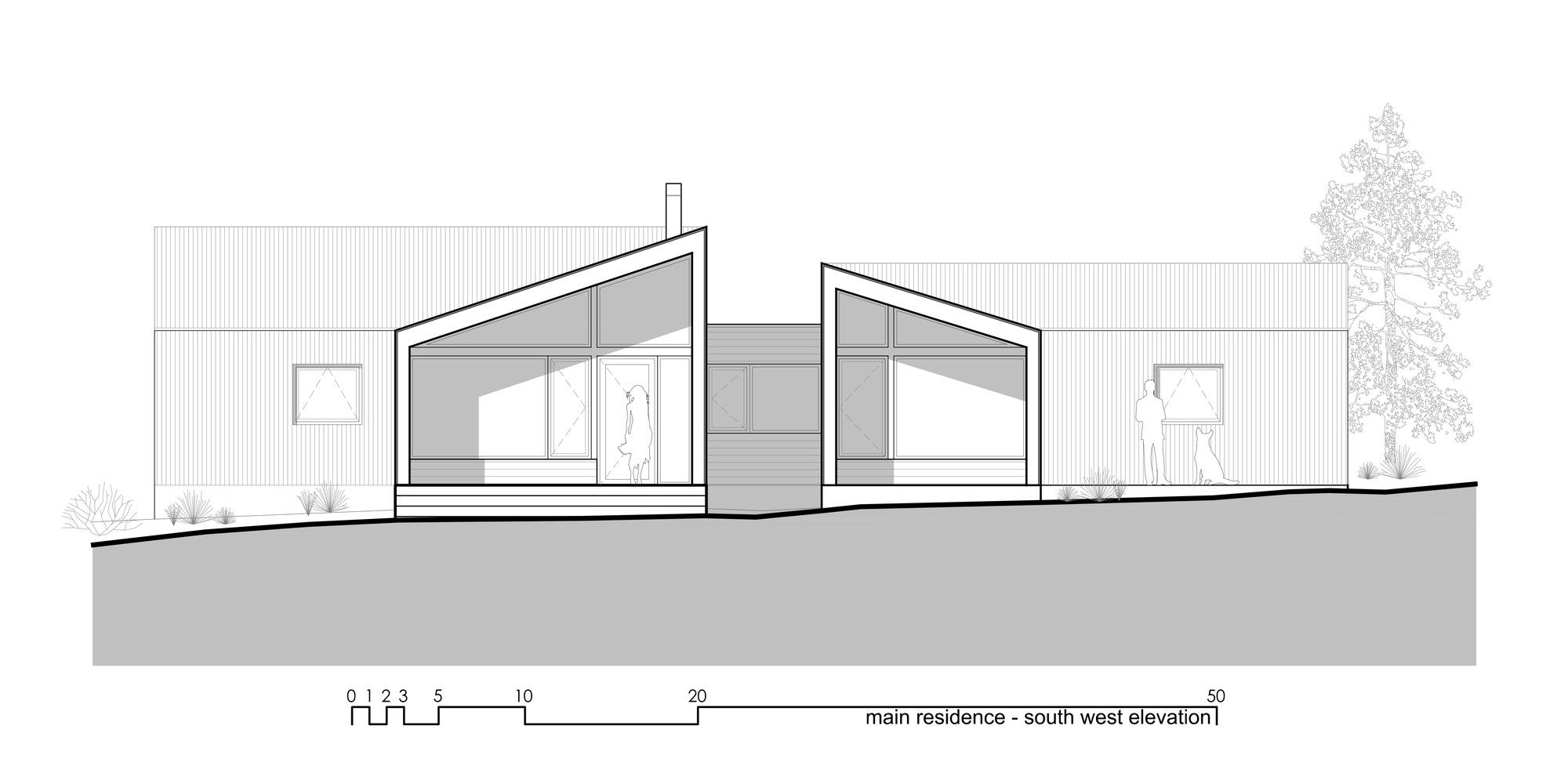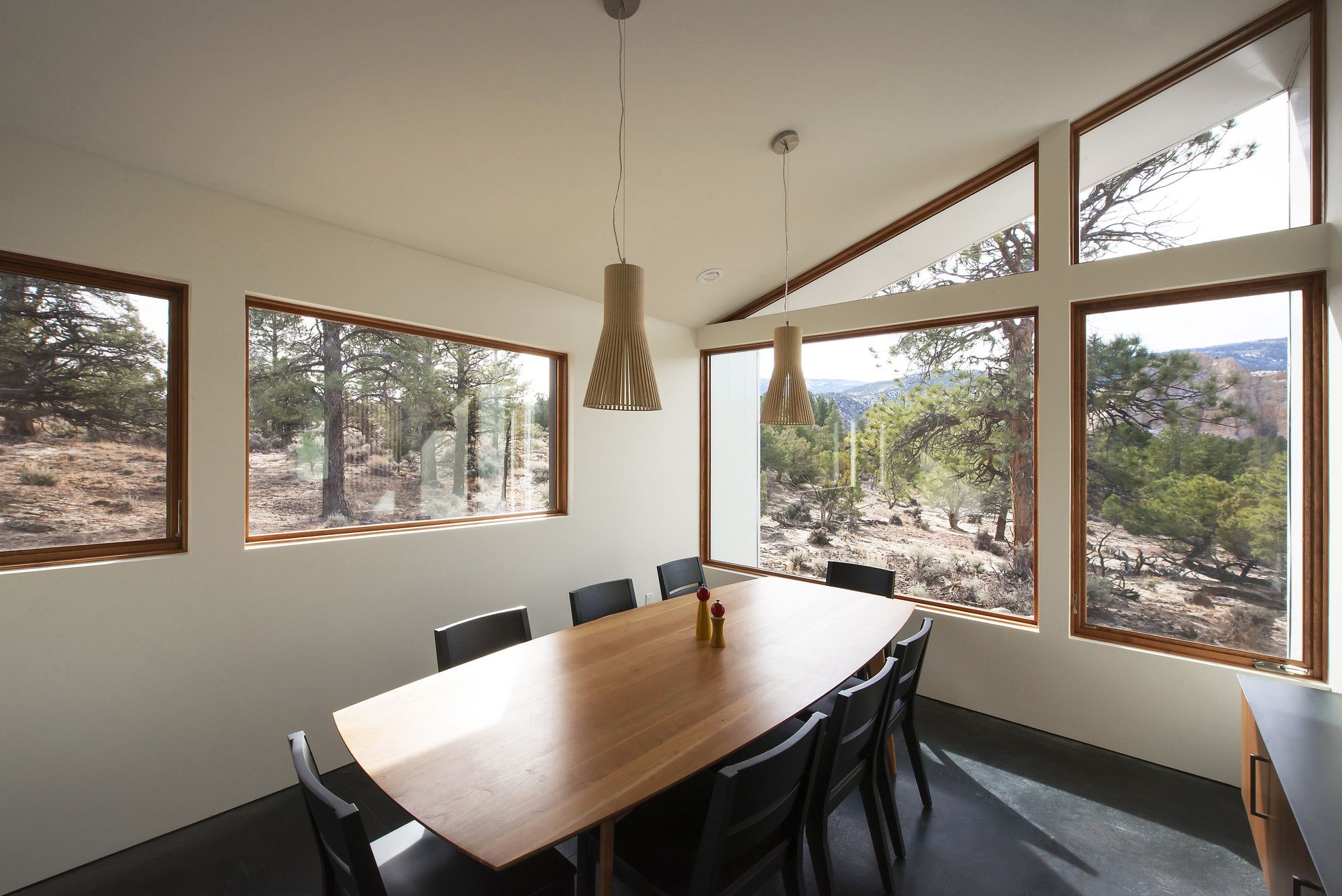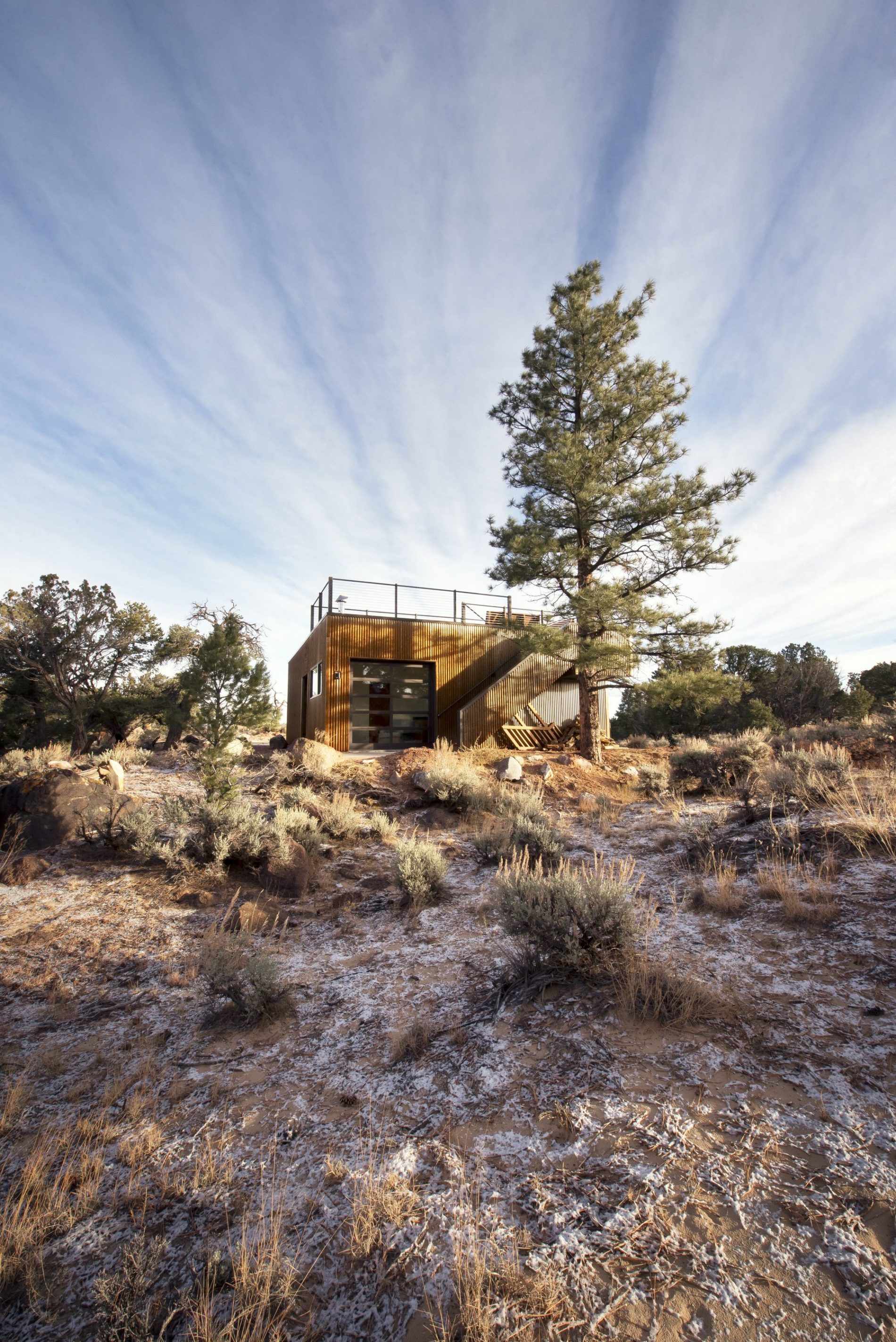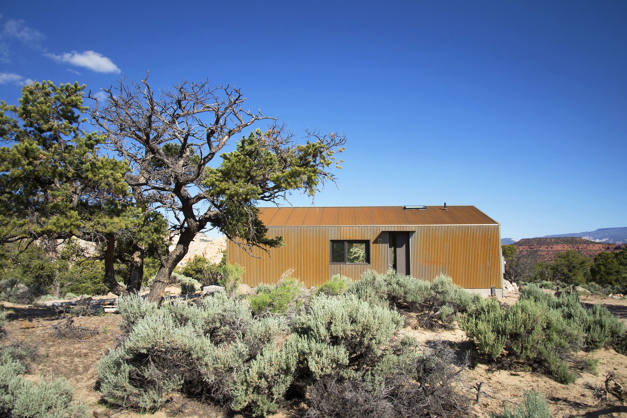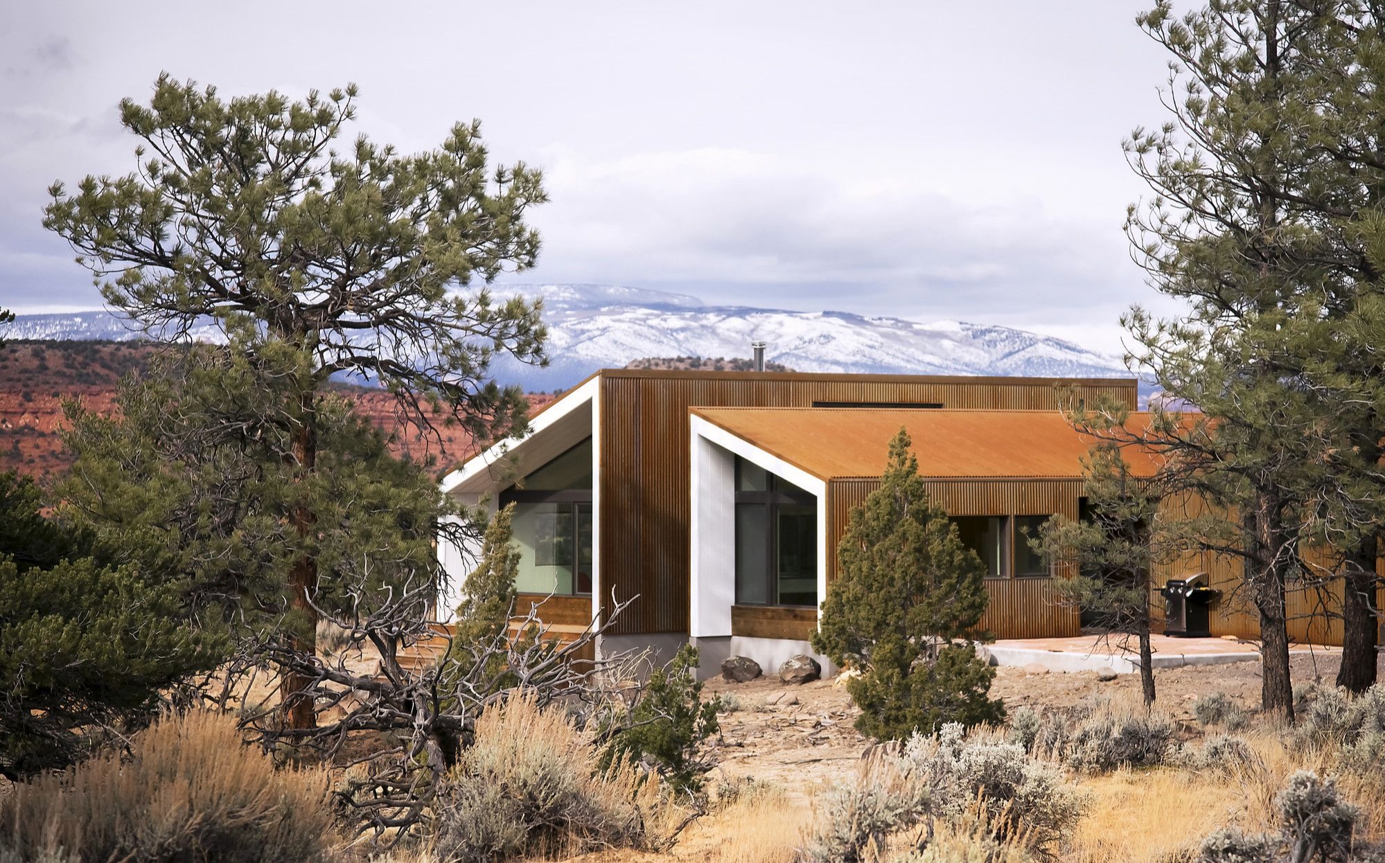 Projekt obejmuje rezydencję główną, domek dla gości, przytulne zakątki i przestronne wnętrza z ogromnymi przeszklonymi ścianami oraz poziomymi oknami. Widoki na spektakularne formacje skalne to kluczowy element designu. Budynki z paneli stalowych i cedrowych desek nawiązują do czerwonych skał, starzejąc się naturalnie pod wpływem słońca.