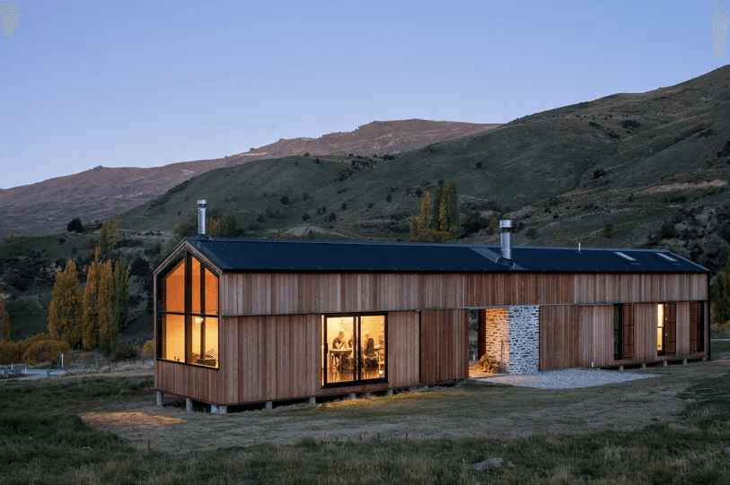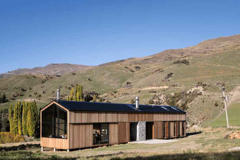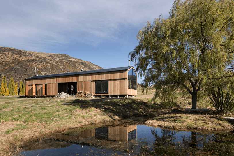 Studio RTA stworzyło wyjątkowy dom wakacyjny w kształcie stodoły w malowniczej dolinie Cardrona w Nowej Zelandii. Otoczony majestatycznym pasmem górskim Alp Południowych, ten przytulny azyl oferuje idealne warunki do wypoczynku dla pięcioosobowej rodziny i ich gości. Parterowy budynek został podzielony na dwie części – strefę dzienną i nocną – które łączy zadaszona przestrzeń zewnętrzna z masywnym kamiennym kominem. Dzięki dużym, drewnianym okiennicom można całkowicie zamknąć przestrzeń między skrzydłami budynku, zapewniając prywatność i ochronę przed warunkami pogodowymi. Dom zaprojektowano tak, by pomieścił nawet 10 osób.