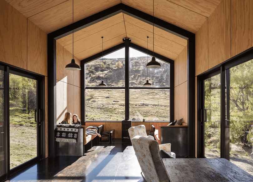 Wnętrze nowoczesnej stodoły całkowicie pozbawiono płyt gipsowo-kartonowych – wszystkie ściany i sufity wykończono sklejką, co podkreśla ciepły, naturalny charakter przestrzeni. Dzięki temu dom jest nie tylko przytulny, ale też trwały i łatwy w utrzymaniu. Chata Cardrona to doskonały przykład, jak połączyć współczesne rozwiązania architektoniczne z tradycyjną formą i naturalnymi materiałami, tworząc miejsce pełne harmonii, funkcjonalności i górskiego klimatu.