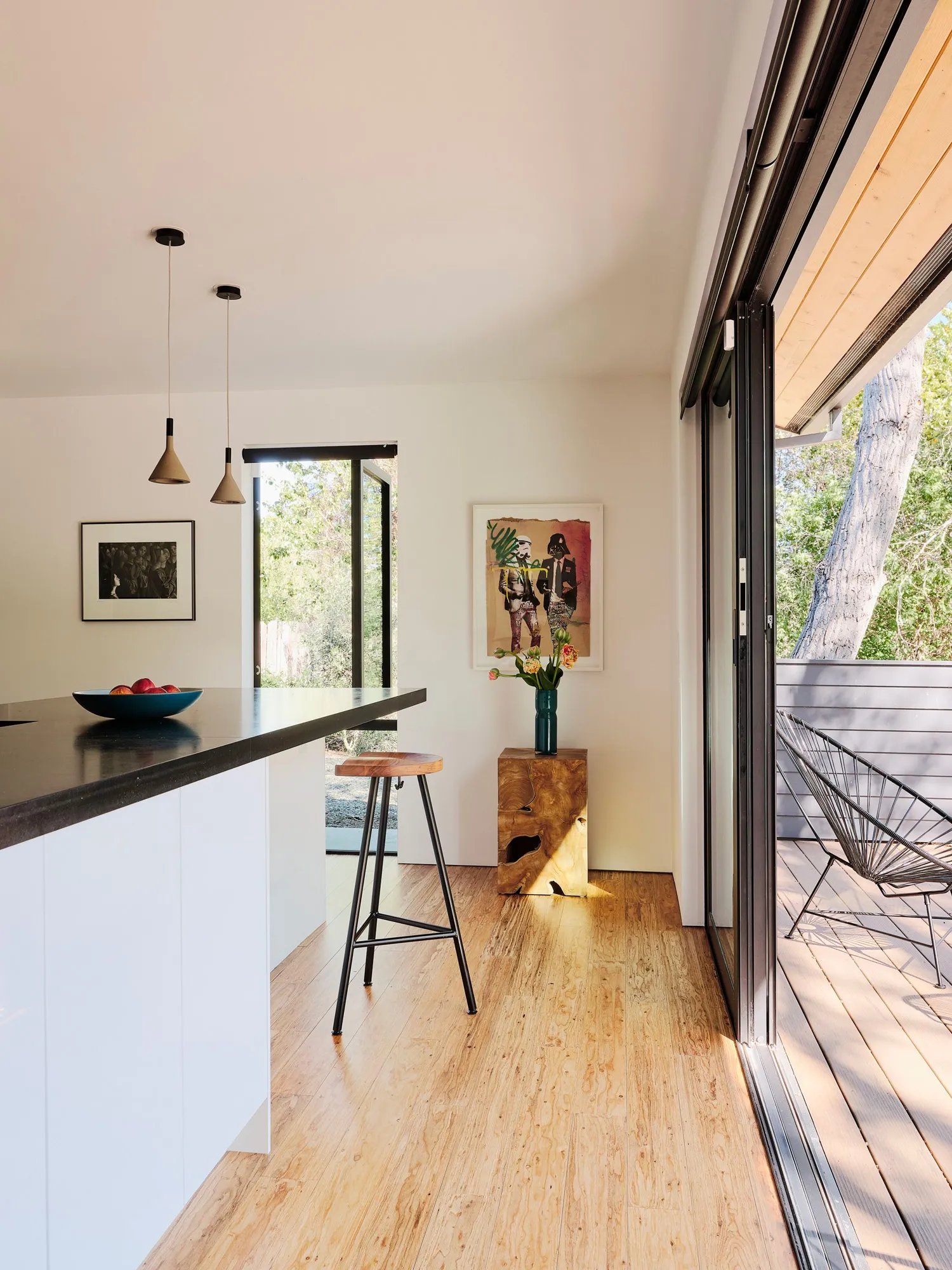 W ramach nowego układu architekci zaprojektowali szeroki, otwarty taras oraz okna sięgające od podłogi do sufitu, które dosłownie wciągają zieleń do wnętrz. Naturalne światło wypełnia dom, a wcześniej ciemna, zamknięta przestrzeń nabrała nowego życia. Dzięki temu przestrzeń stała się nie tylko bardziej funkcjonalna, ale też emocjonalnie związana z otoczeniem – tak ważnym dla właścicieli, którzy zawodowo wspierają organizacje charytatywne chroniące dziką przyrodę.