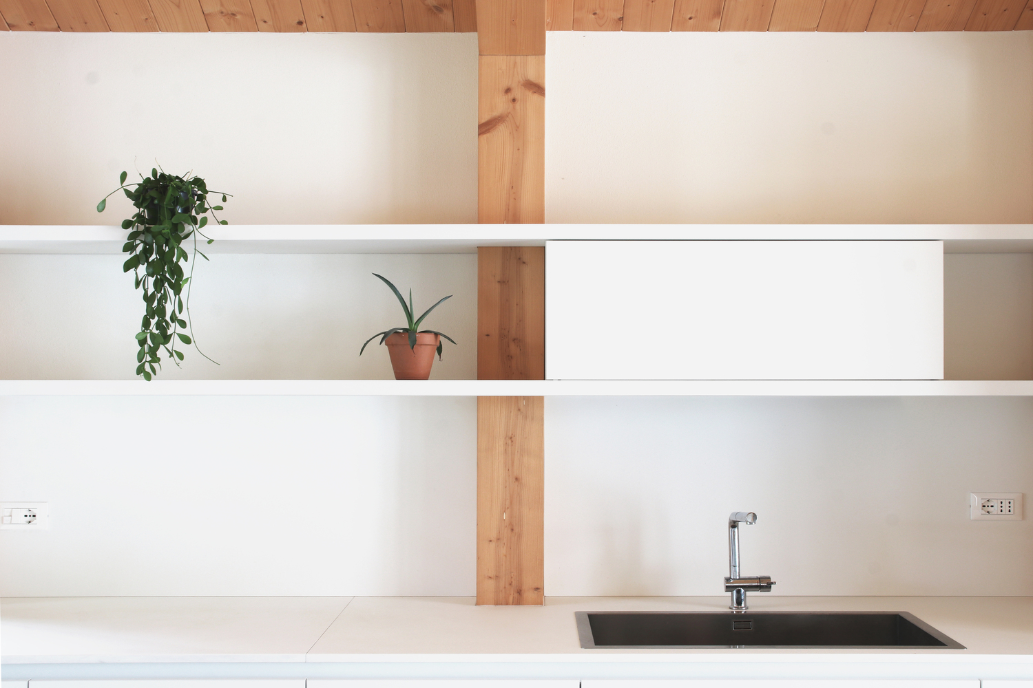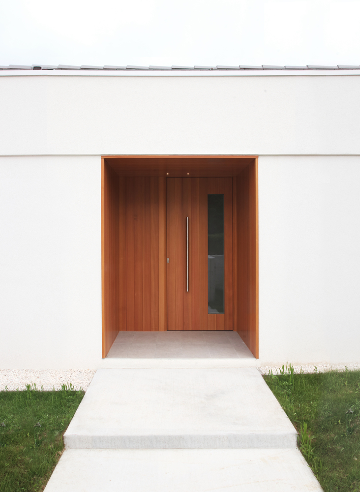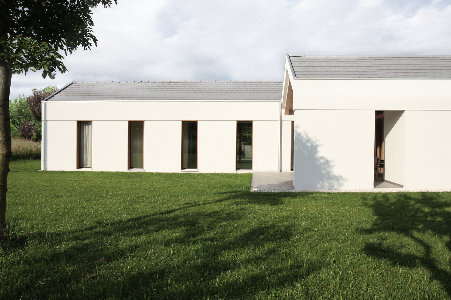 Projekt charakteryzuje się prostą kompozycją – wejście znajduje się na przecięciu dwóch brył, zapewniając dostęp do przestrzeni dziennej oraz sypialnej. Regularne otwory okienne oraz modrzewiowe ramy nadają rytm fasadom. Białe wnętrza z drewnianymi stropami i elementami konstrukcyjnymi, takimi jak drewniane portale, wprowadzają ciepło i harmonizują z naturą.