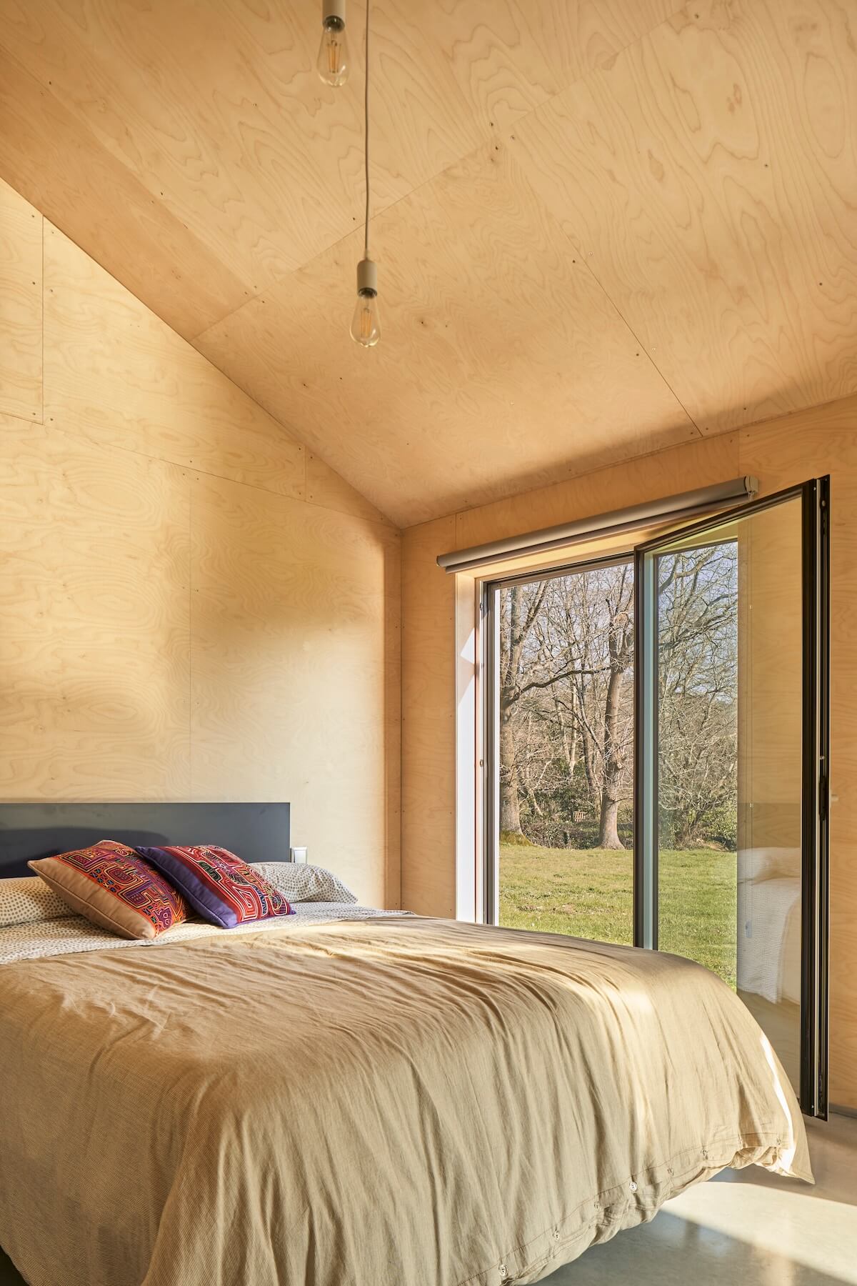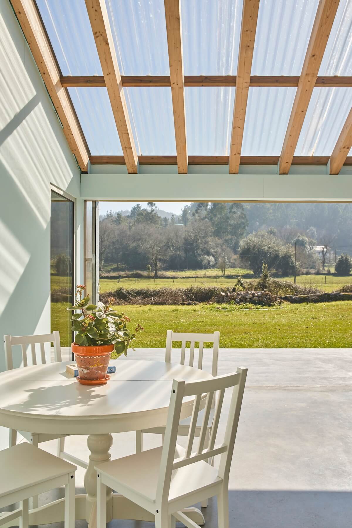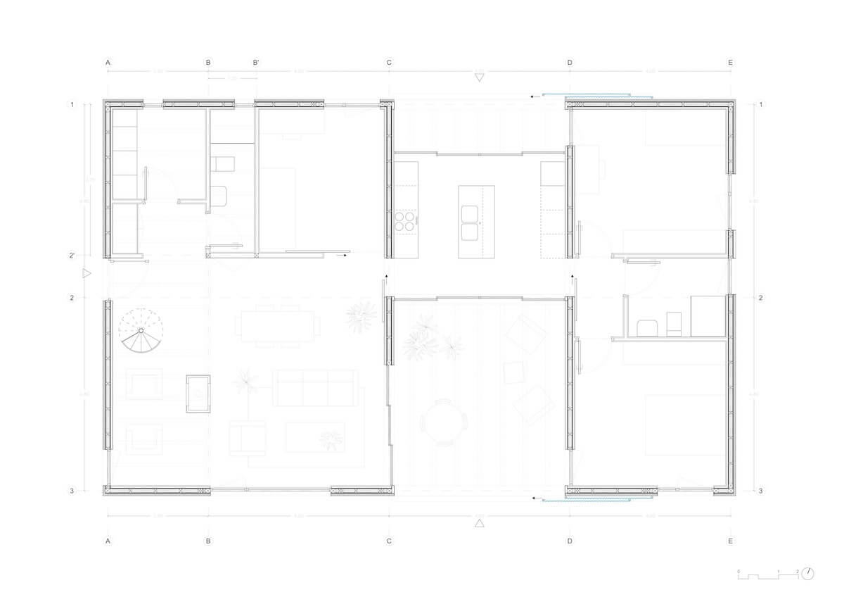 Zastosowanie uprzemysłowionych systemów budowlanych pozwoliło na znaczną redukcję czasu budowy, śladu węglowego oraz zapotrzebowania na energię. Konstrukcję z laminowanych ram drewnianych wykonano w warsztacie, a elementy zostały przetransportowane na miejsce, gdzie zmontowano je w zaledwie tydzień. Drobne prace wykończeniowe i detale zostały wykonane przez właścicieli. Dzięki tym innowacyjnym rozwiązaniom, ten dom osiąga niemal zerowe zużycie energii, a jego konstrukcja doskonale wpisuje się w ideę sustainability i nowoczesnej architektury wiejskiej. To przykład domu bioklimatycznego, który łączy estetykę, funkcjonalność i ekologiczne podejście do budownictwa.