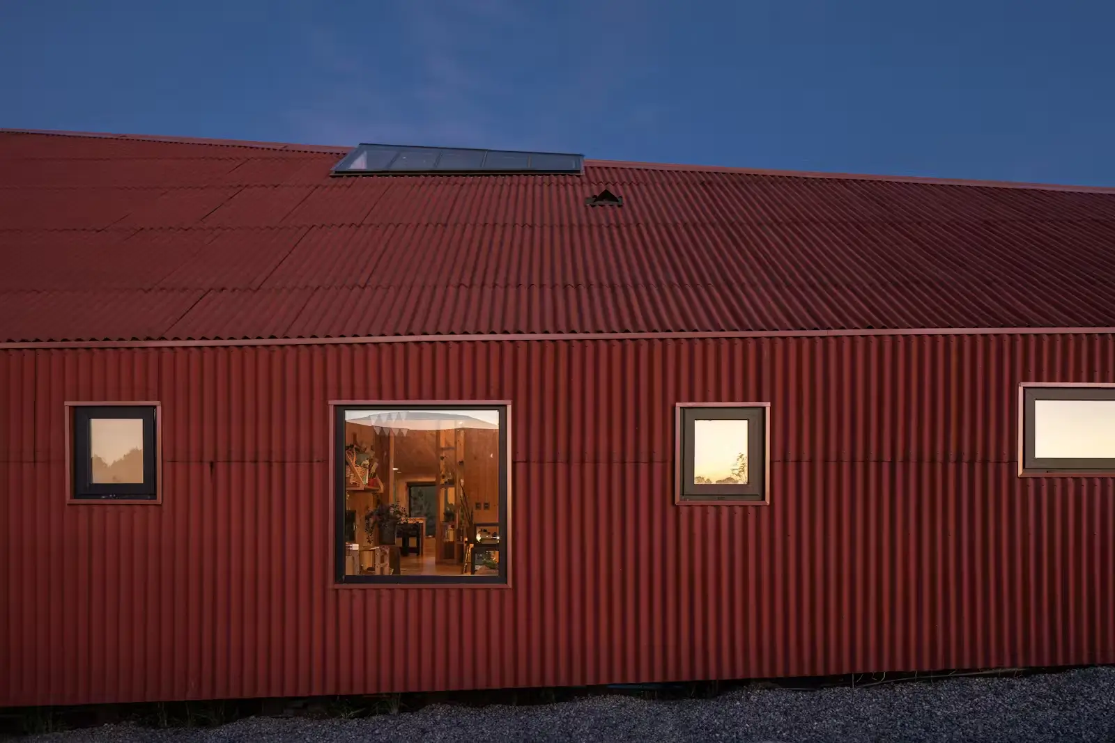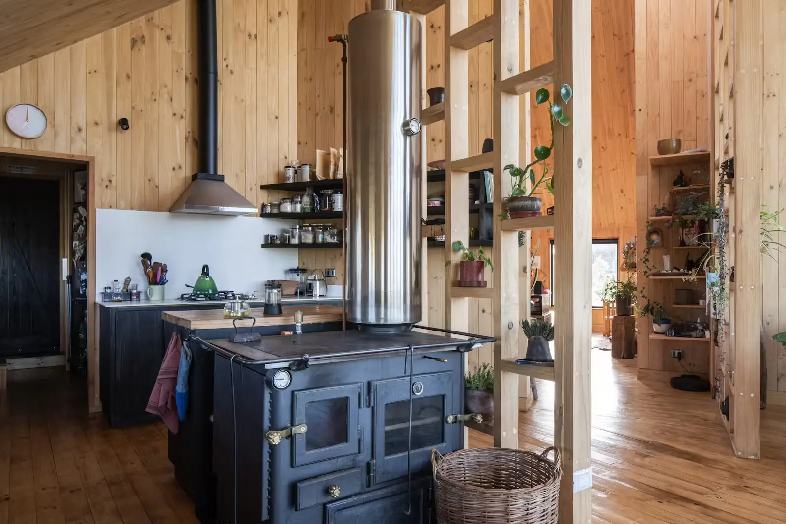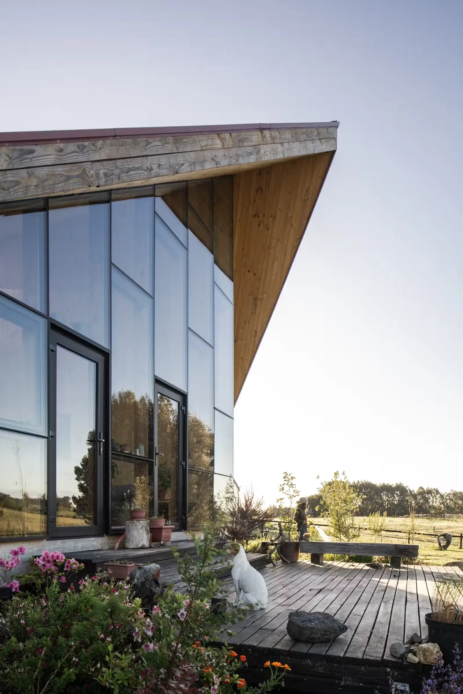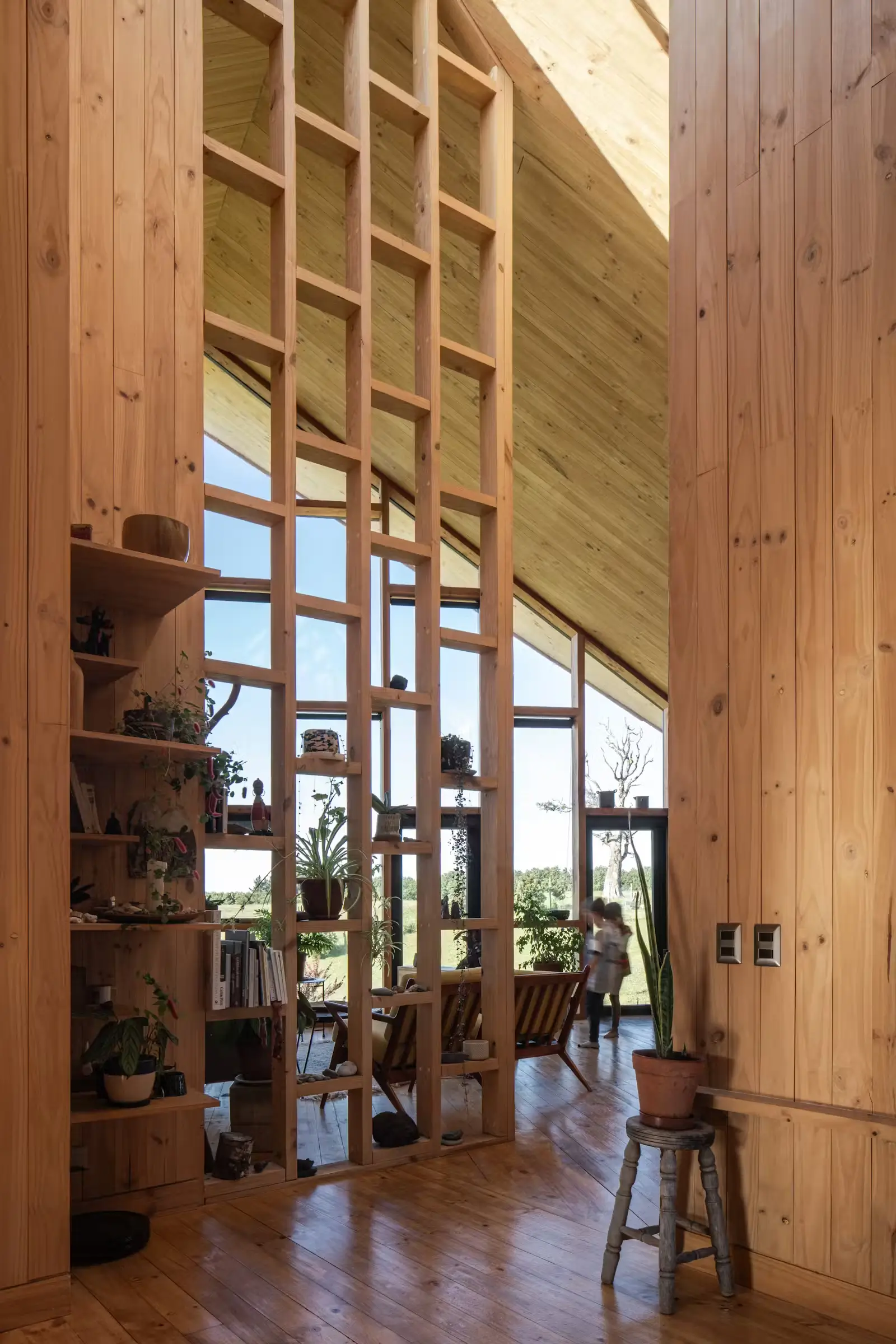 Spadzisty dach, który wznosi się na 6 metrów, nadaje salonowi wygląd przypominający katedrę. Patchworkowe regały sięgające od podłogi do sufitu nadają otwartej przestrzeni wspólnej pewną strukturę – a wszystko to bez umniejszania światło. „Z tyłu dom wygląda jak bunkier” zauważa Matías „więc cała ta jasność zaskakuje ludzi, którzy wchodzą do nich po raz pierwszy”. Mówi, że ludzie są również zdumieni przytulnością tego miejsca dzięki piecowi opalanemu drewnem. „To naprawdę serce domu” . Nie tylko ogrzewa całe miejsce. Podgrzewa także wodę do dwóch łazienek i gotuje posiłki dla całej rodziny. Większość tych ostatnich pochodzi z ogrodu i szklarni na tyłach domu. Tymczasem energia elektryczna pochodzi z 14 paneli słonecznych umieszczonych na szczycie pobliskiego kątowego garażu pary.