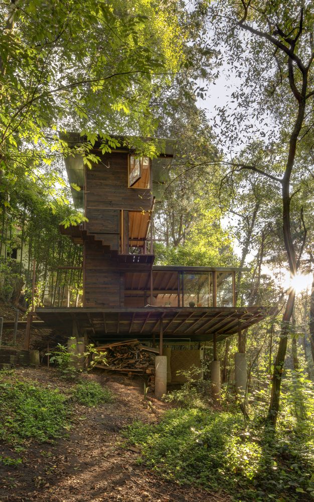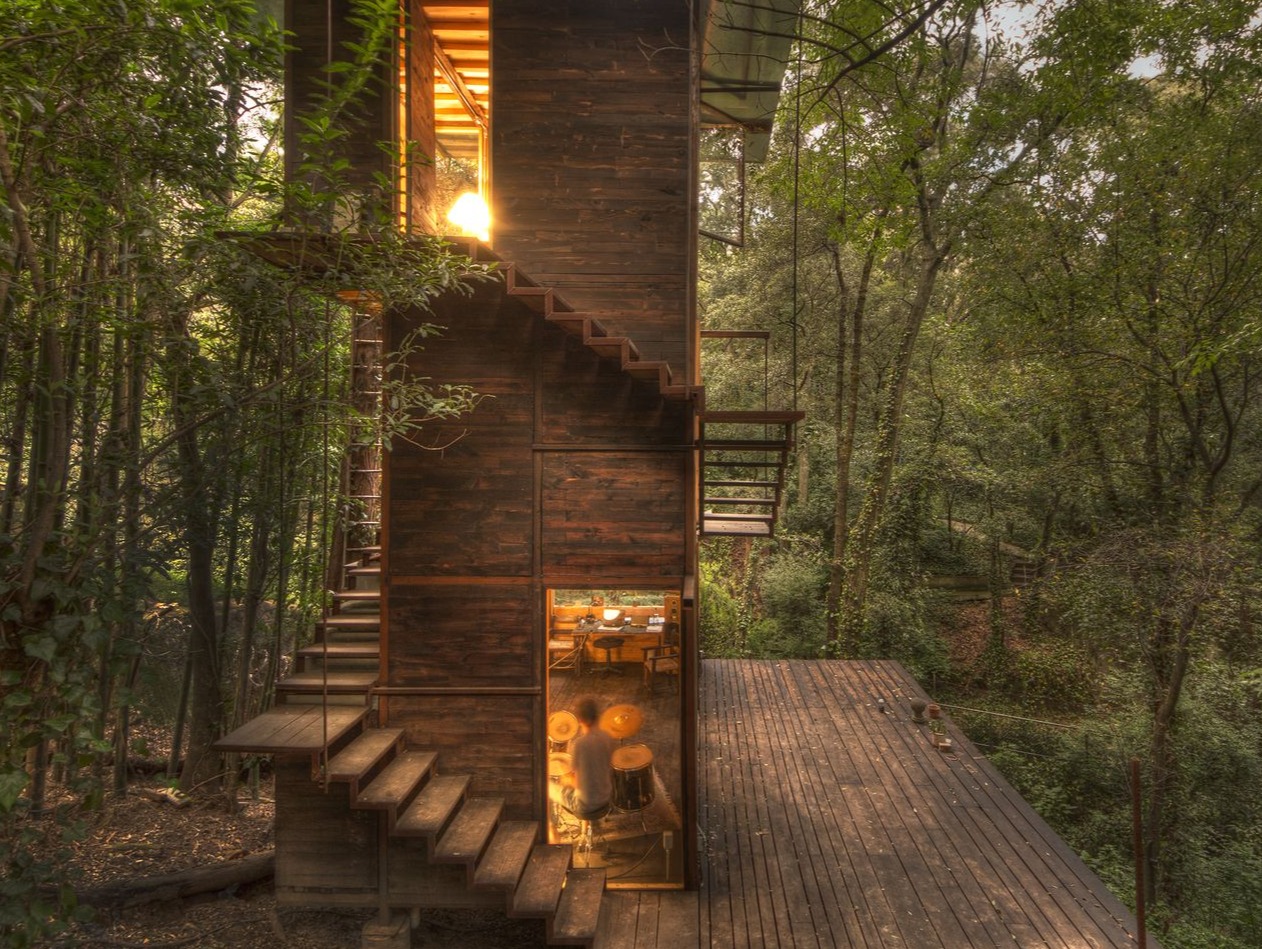 Casa Flotante, znana jako „Latający dom”, to niezwykły przykład architektury zintegrowanej z krajobrazem, w której granica między wnętrzem a naturą niemal całkowicie zanika. Projekt autorstwa meksykańskiego studia Talleresque powstał na stromym zboczu w pobliżu miasta Meksyk i ma powierzchnię 87 m². Pionowa, spiralna forma budynku unosi się na dziewięciu masywnych belkach pełniących funkcję symbolicznych „korzeni”, dzięki czemu konstrukcja osiąga wysokość otaczających ją drzew. Transparentny dom, pochłonięty przez roślinność, nie dominuje nad otoczeniem, lecz odbija je niczym lustro, tworząc nowoczesną interpretację idei, którą coraz częściej reprezentuje także nowoczesna stodoła — budynek prosty w formie, ale głęboko zakorzeniony w miejscu.