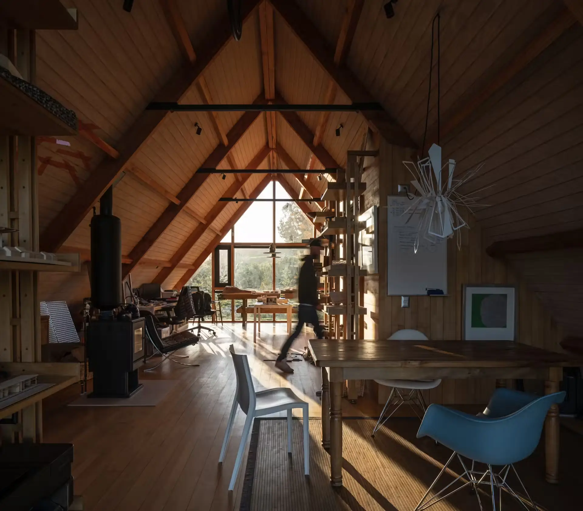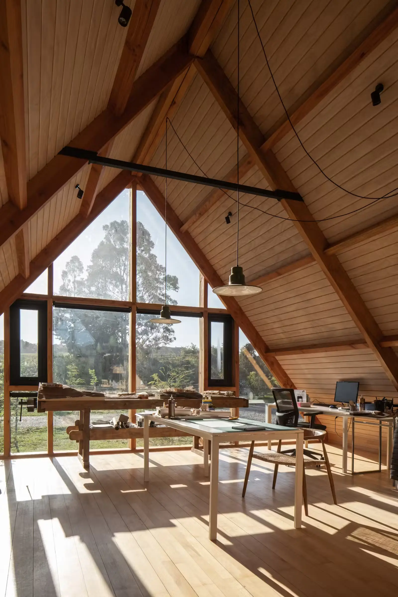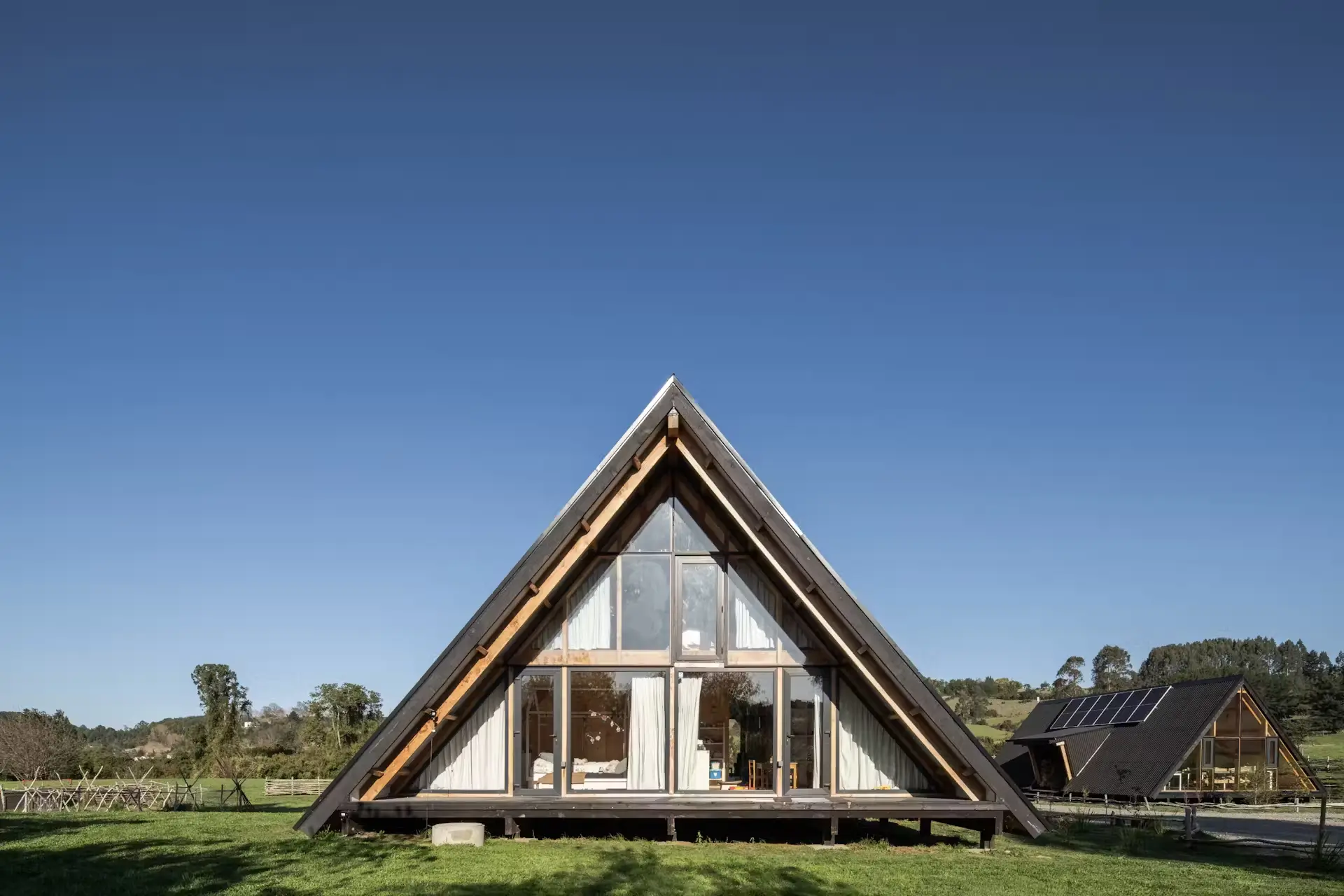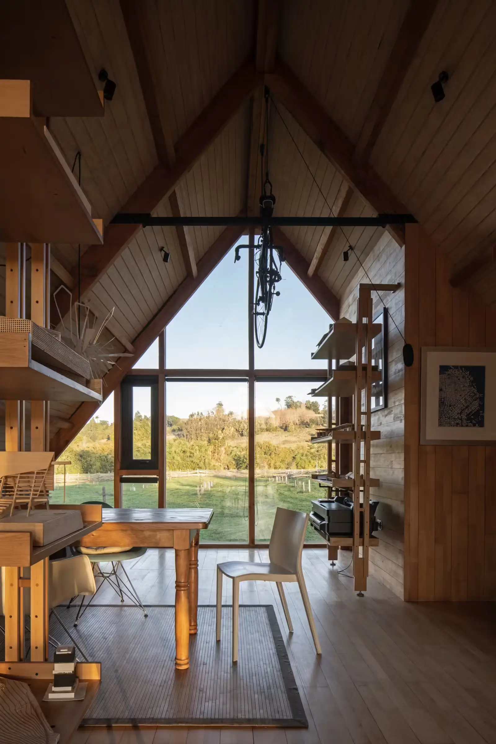 W Chile pogoda zmienia się gwałtownie w ciągu dnia. Nic więc dziwnego, że koncepcja refugio – domu jako schronienia – była na pierwszym planie. Zarówno Maximiliano, jak i Alejandra dorastali na nartach, więc przytulny, inspirowany alpejskim stylem A-frame wydawał się idealną formą do osiągnięcia tego uczucia ukrycia się przed światem. Trójkątny kształt można skutecznie ogrzać, a także tworzy przyjemną dwoistość: wysokie sufity i poczucie kojącego zamknięcia.