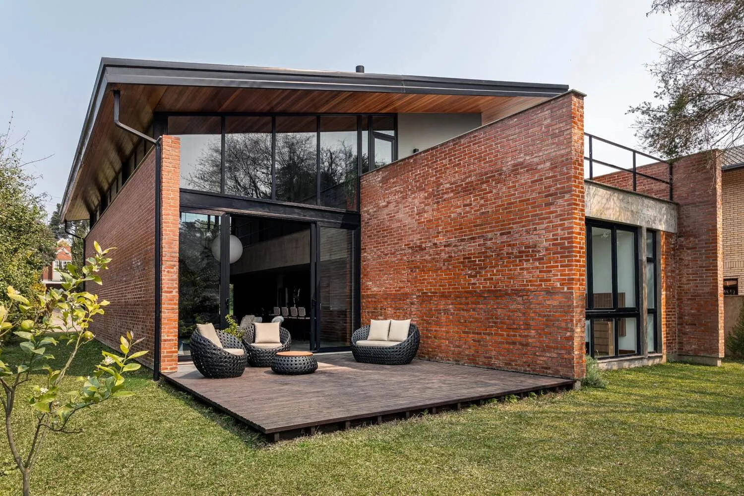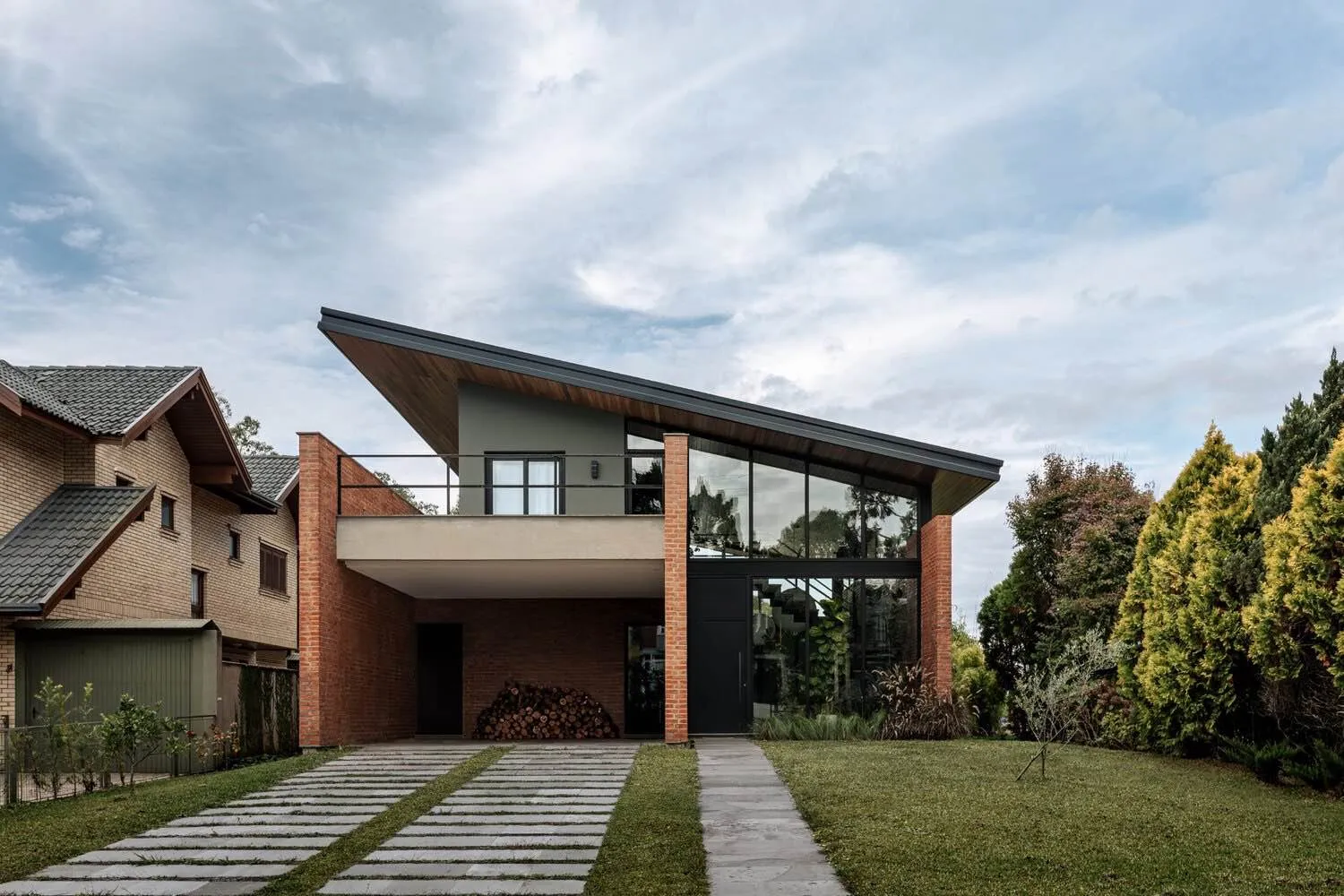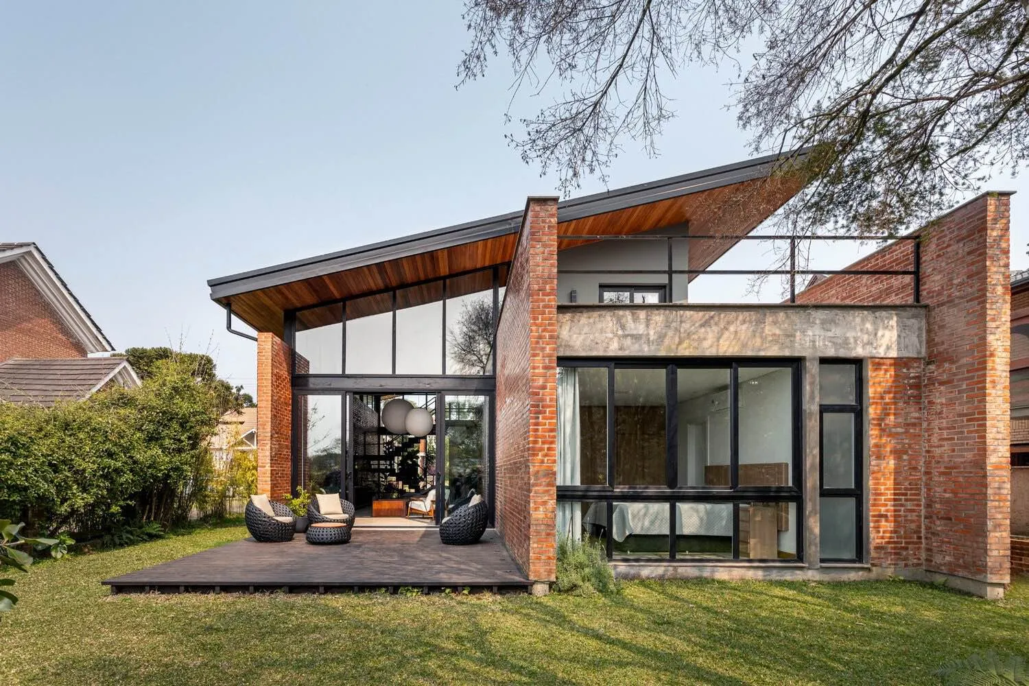 Projekt autorstwa OSPA Arquitetura e Urbanismo opiera się na czytelnym układzie przestrzennym, który równoważy otwartość z poczuciem prywatności. Trzy podłużne, pionowe płaszczyzny z surowej cegły zostały rozmieszczone równolegle, dzieląc dom na dwie strefy. Jedna z nich mieści bardziej zamknięte funkcje pomocnicze, druga otwiera się szeroko na ogrody dzięki transparentnym zakończeniom bryły. Taki układ pozwala na stały kontakt z zielenią, bez rezygnacji z intymności.