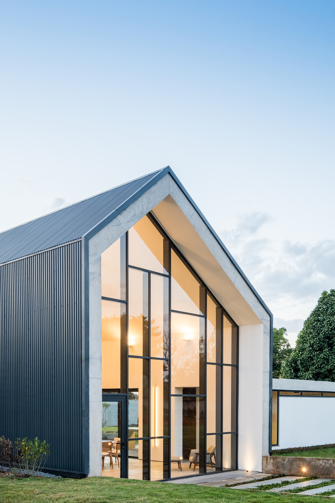 Dach z podłużnymi belkami i pochylonymi płytami zaprojektowano tak, aby zapewnić izolację termiczno-akustyczną, uzupełnioną stalowymi gontami elewacyjnymi. Podczas gdy główny blok wyróżnia się odważną formą i brakiem konwencjonalizmu, drugi pawilon powstał jako rygorystyczny, prosty element architektoniczny. Razem tworzą spójną kompozycję – nowoczesną interpretację domu w stylu nowoczesna stodoła, w której architektura przenika się z krajobrazem.
