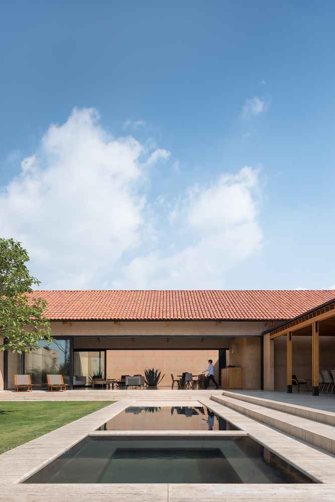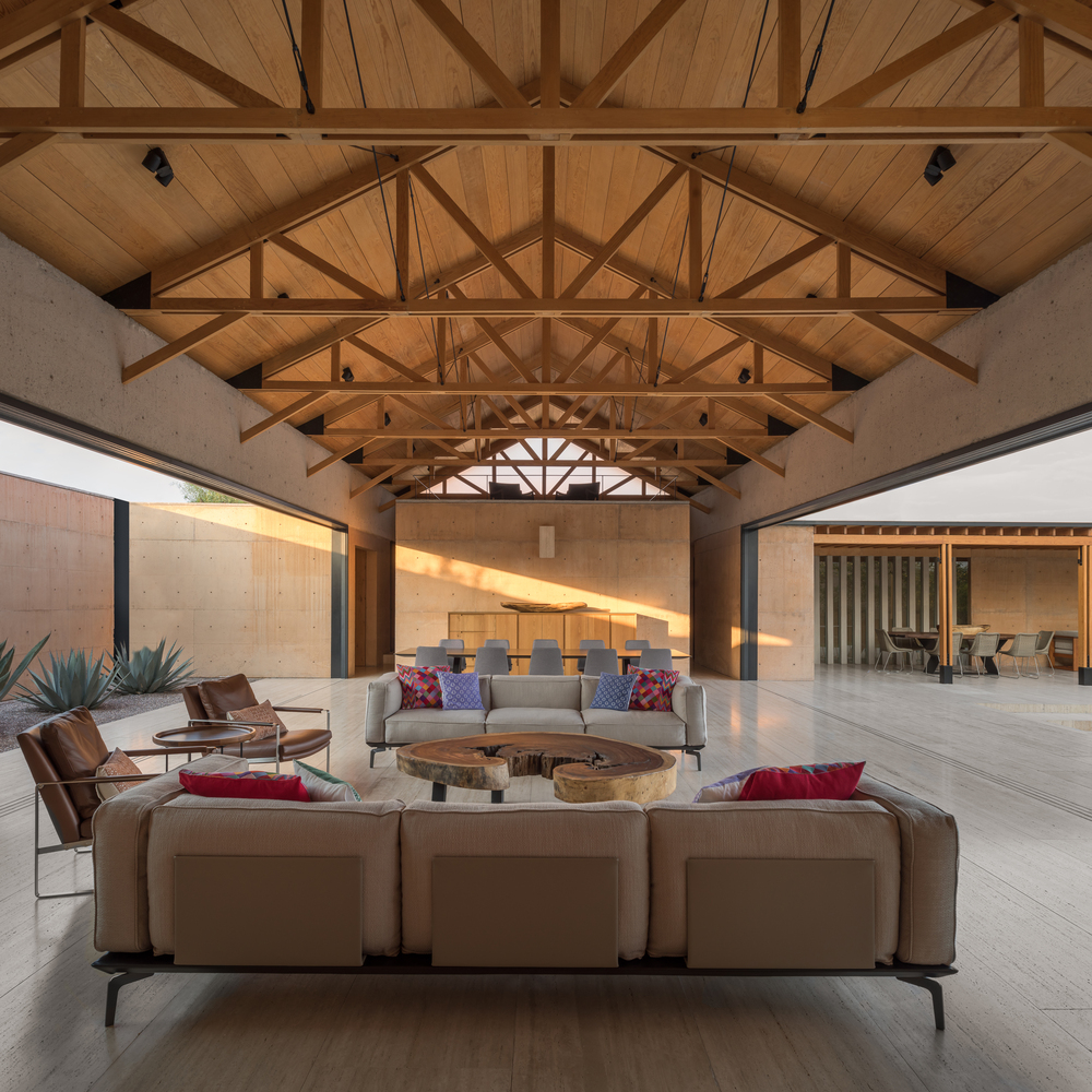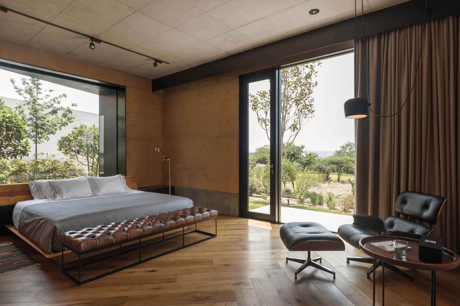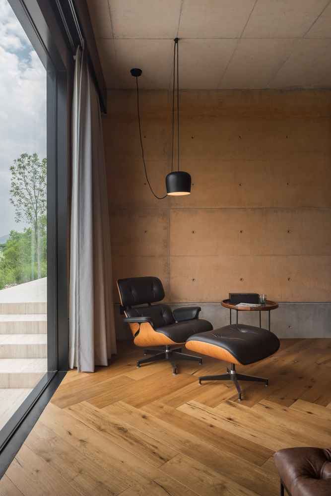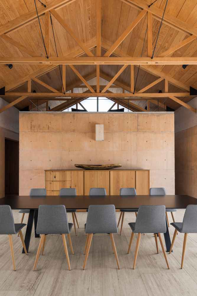 Główne przestrzenie dzienne otwierają się na otoczenie dzięki wielkoformatowym przeszkleniom i przesuwnym drzwiom, zacierając granicę pomiędzy wnętrzem a zewnętrzem. W efekcie wnętrze domu może funkcjonować jak ogromny, zadaszony taras, oferując panoramiczne widoki na krajobraz i pole golfowe. Połączenie surowego betonu, kamienia i odsłoniętej drewnianej konstrukcji dachu nadaje budynkowi ponadczasowy charakter i podkreśla jego minimalistyczną, rzeźbiarską architekturę.
