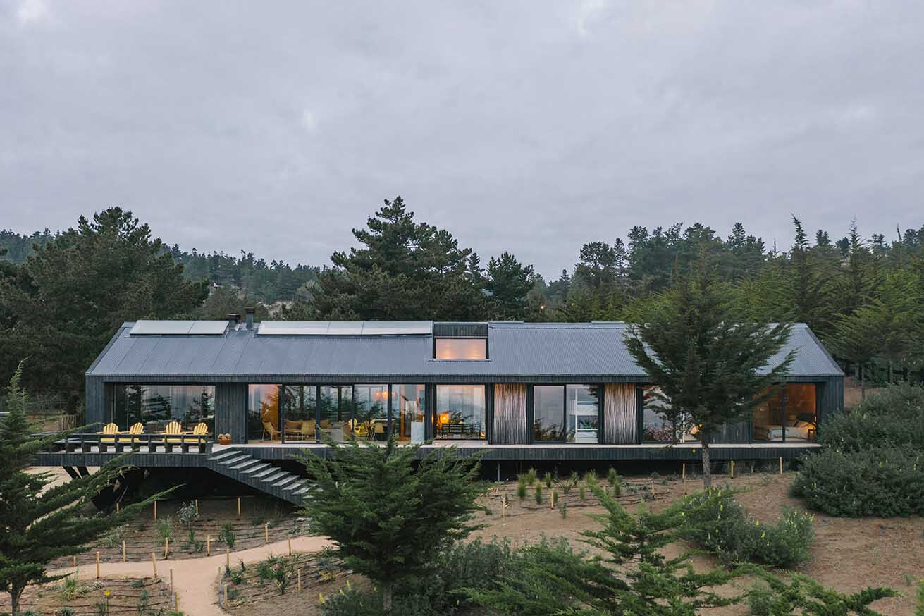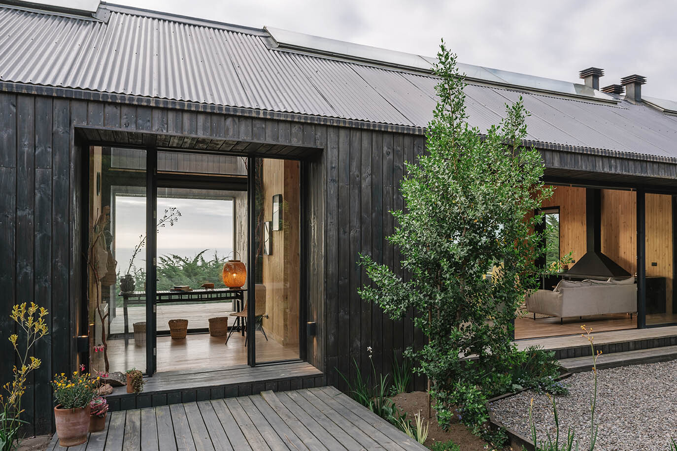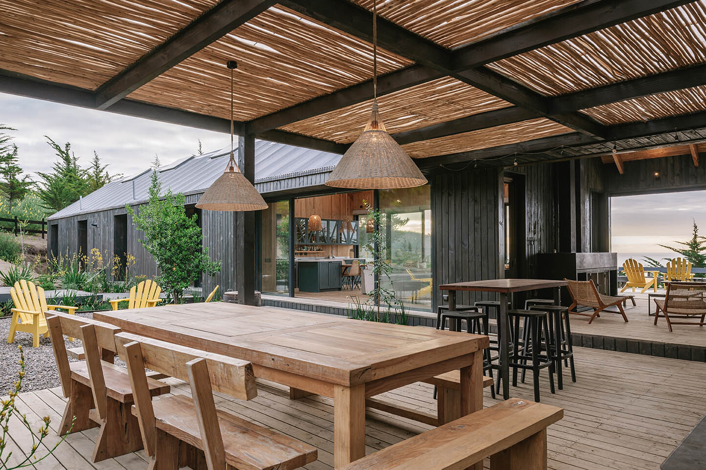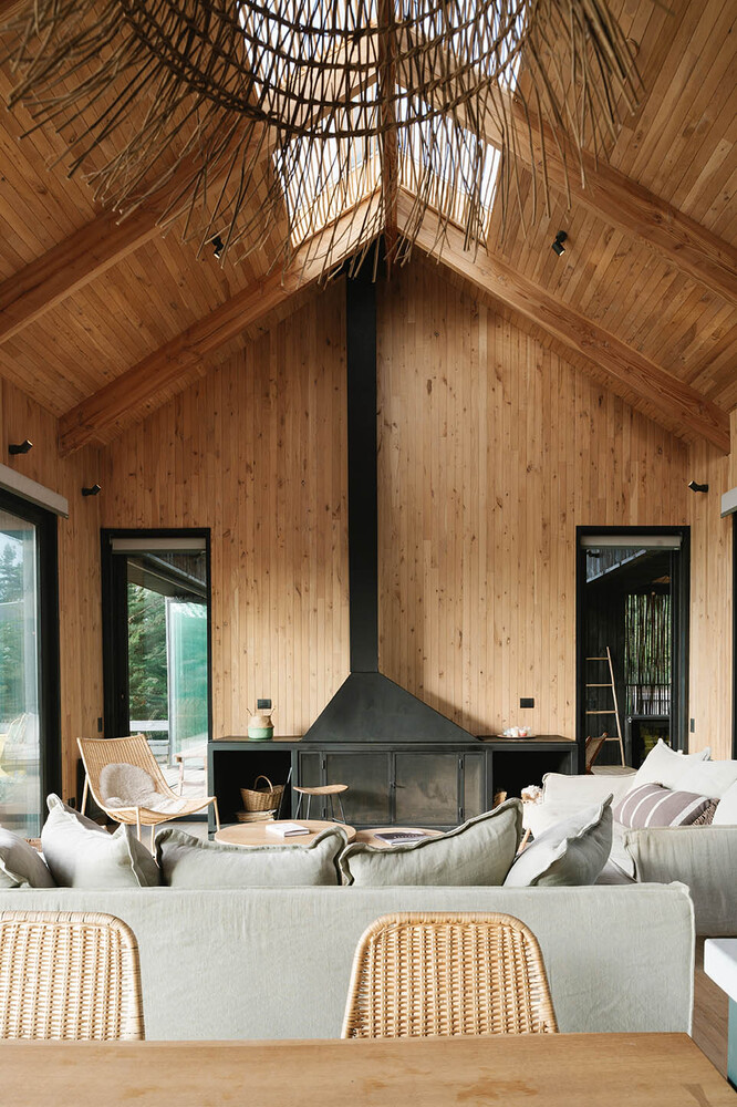 Cała konstrukcja osadzona jest na palach, aby unieść ją ponad koronami drzew i zapewnić niezakłócony widok na ocean. Naturalne materiały odgrywają kluczową rolę – elewacja z ciemnych desek sosnowych wtapia dom w otoczenie, podczas gdy jasne drewno lenga rozjaśnia wnętrze. Eukaliptusowe kratownice pełnią funkcje estetyczne i praktyczne: osłaniają tarasy, łazienki i dachowy świetlik, a także chronią przed wiatrem. Tarasy stanowią serce życia w Casa Puertecillo. Główny taras – zadaszony, z kominkiem i przeszkloną ścianą – to przedłużenie wnętrza, które można użytkować przez cały rok. Taras frontowy oferuje najlepszy widok na morze, natomiast tylny ogród z grillem i piecem to miejsce spotkań chronione od wiatru.