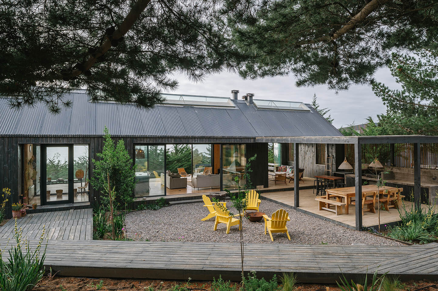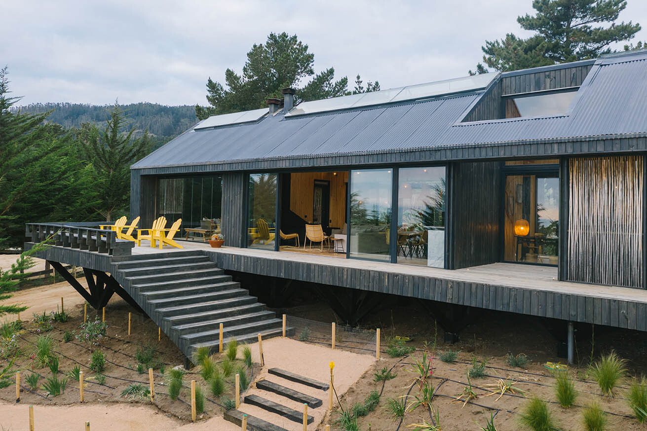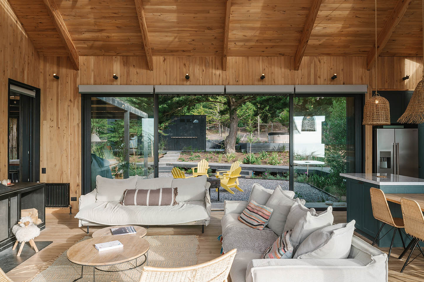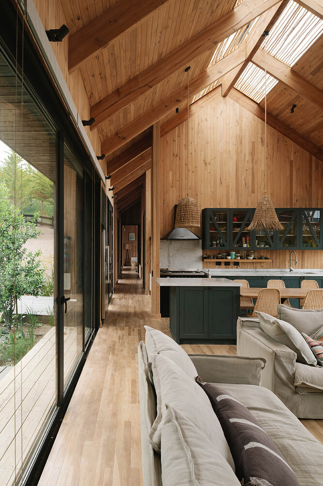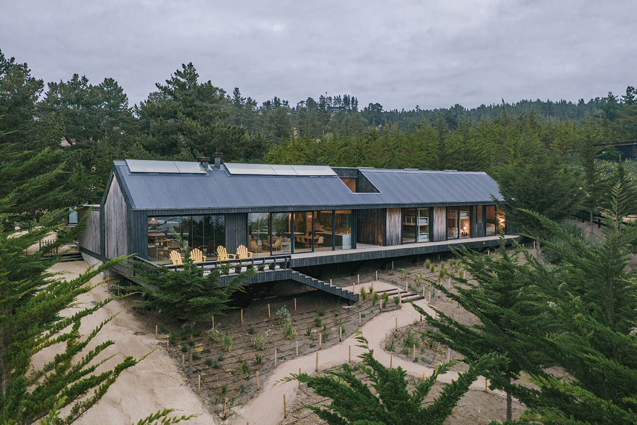 Cała konstrukcja osadzona jest na palach, aby unieść ją ponad koronami drzew i zapewnić niezakłócony widok na ocean. Naturalne materiały odgrywają kluczową rolę – elewacja z ciemnych desek sosnowych wtapia dom w otoczenie, podczas gdy jasne drewno lenga rozjaśnia wnętrze. Eukaliptusowe kratownice pełnią funkcje estetyczne i praktyczne: osłaniają tarasy, łazienki i dachowy świetlik, a także chronią przed wiatrem. Tarasy stanowią serce życia w Casa Puertecillo. Główny taras – zadaszony, z kominkiem i przeszkloną ścianą – to przedłużenie wnętrza, które można użytkować przez cały rok. Taras frontowy oferuje najlepszy widok na morze, natomiast tylny ogród z grillem i piecem to miejsce spotkań chronione od wiatru.