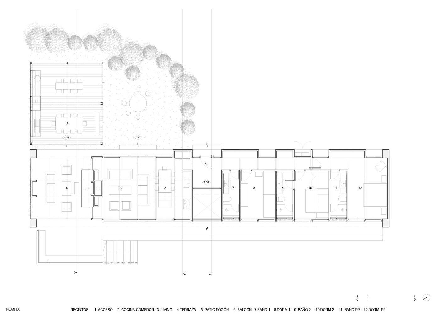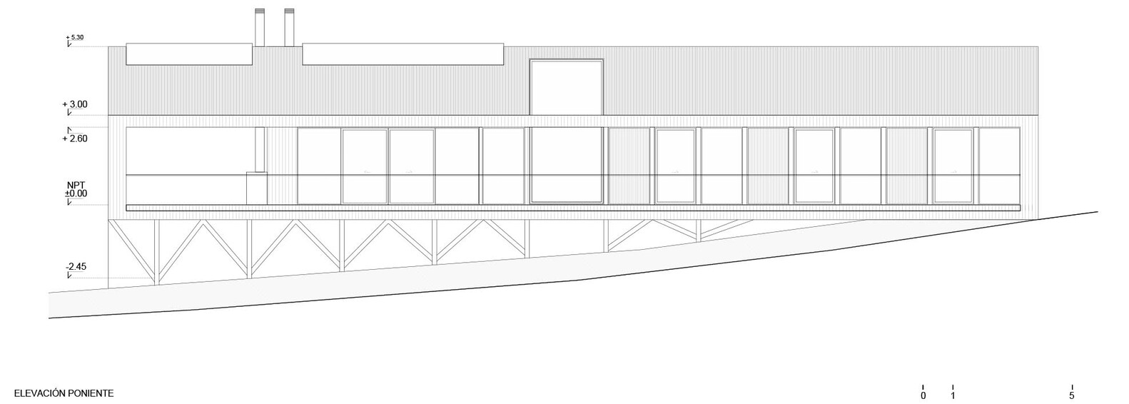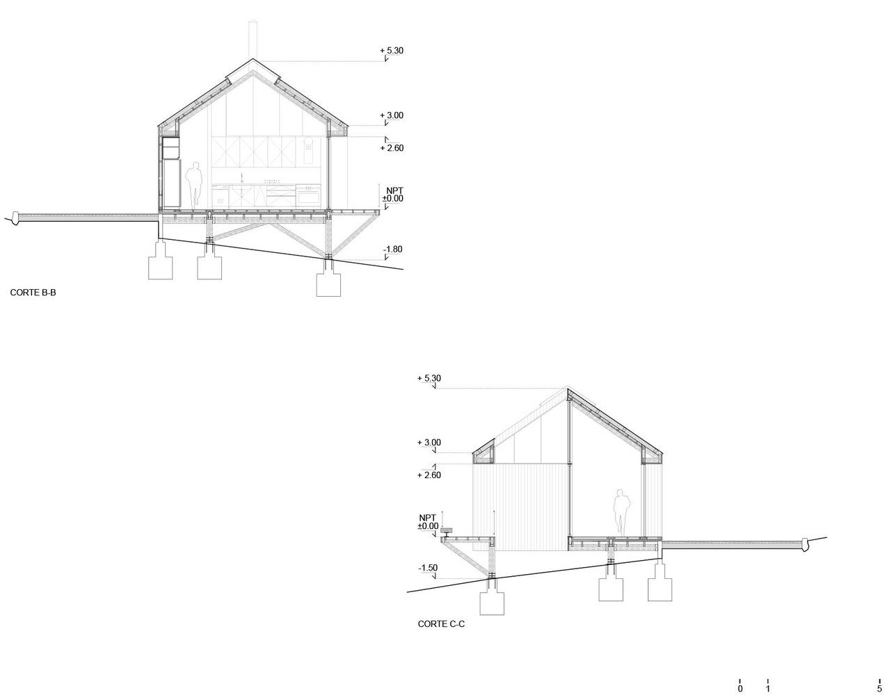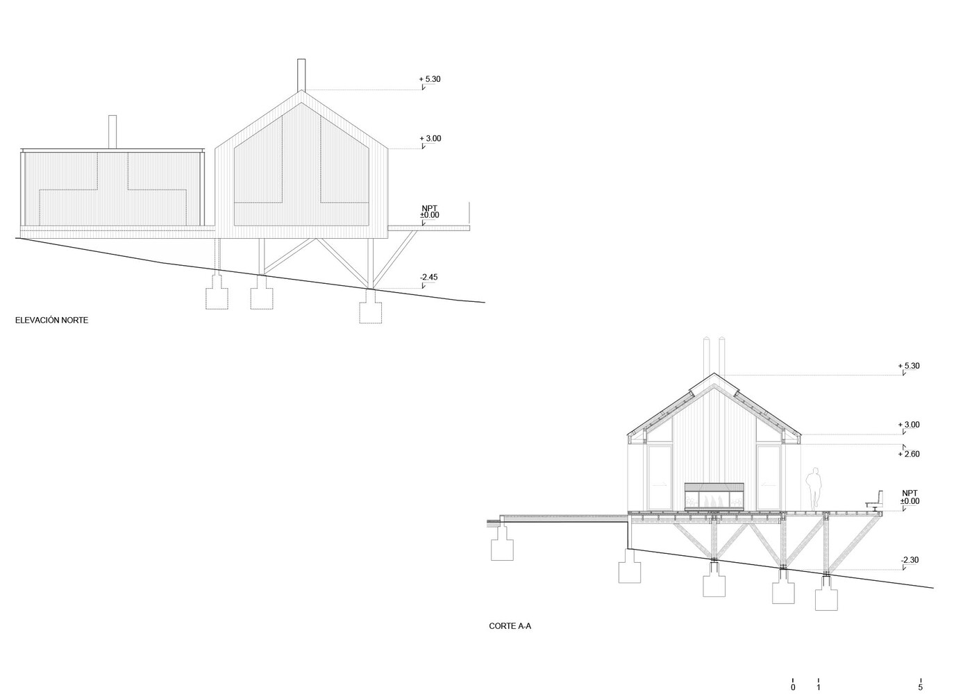 Cała konstrukcja osadzona jest na palach, aby unieść ją ponad koronami drzew i zapewnić niezakłócony widok na ocean. Naturalne materiały odgrywają kluczową rolę – elewacja z ciemnych desek sosnowych wtapia dom w otoczenie, podczas gdy jasne drewno lenga rozjaśnia wnętrze. Eukaliptusowe kratownice pełnią funkcje estetyczne i praktyczne: osłaniają tarasy, łazienki i dachowy świetlik, a także chronią przed wiatrem. Tarasy stanowią serce życia w Casa Puertecillo. Główny taras – zadaszony, z kominkiem i przeszkloną ścianą – to przedłużenie wnętrza, które można użytkować przez cały rok. Taras frontowy oferuje najlepszy widok na morze, natomiast tylny ogród z grillem i piecem to miejsce spotkań chronione od wiatru.