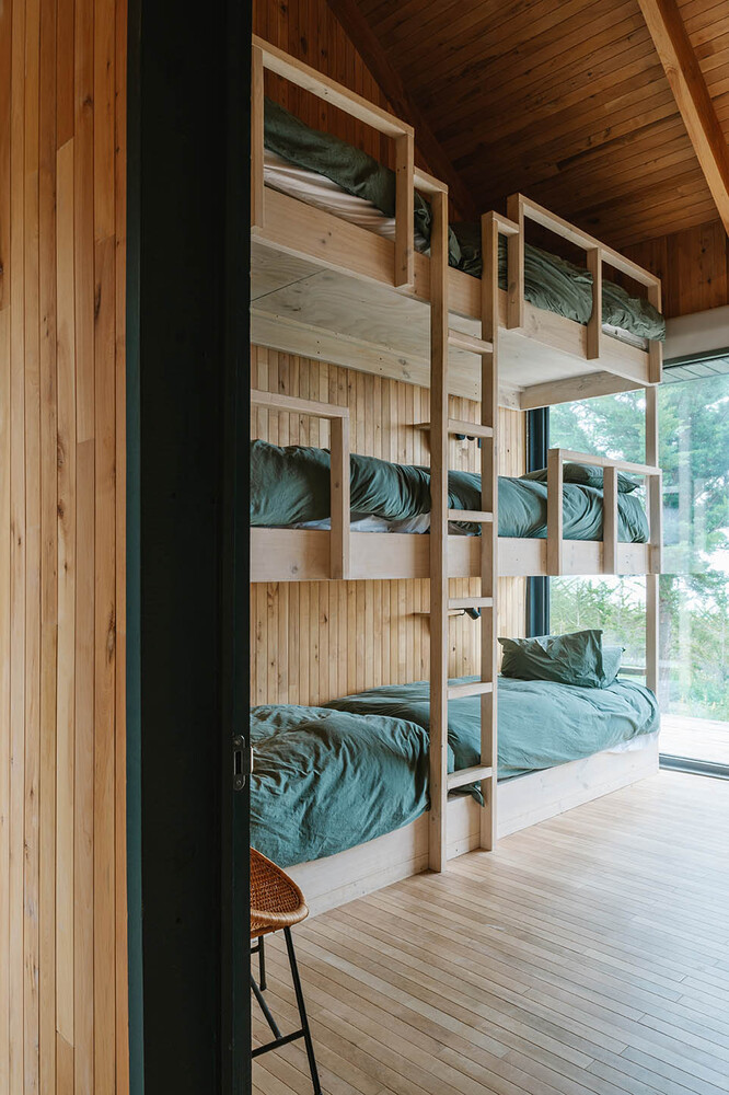 Dom ma formę wydłużonego trójkątnego graniastosłupa, podzielonego na trzy części: środkowy moduł wejściowy, przeszkloną strefę wspólną oraz zamkniętą strefę prywatną. Część wspólna – salon, jadalnia i kuchnia – została otwarta na otoczenie za pomocą przeszkleń po obu stronach, co zapewnia spektakularne widoki na morze i integrację z tarasami oraz ogrodem. Strefa sypialna, ulokowana w części nieprzezroczystej, została zaprojektowana z myślą o prywatności i izolacji akustycznej. Trzypoziomowe łóżka piętrowe w pokojach dziecięcych pozwalają na maksymalne wykorzystanie przestrzeni, natomiast sypialnia główna znajduje się w najbardziej oddalonym, najcichszym punkcie domu.