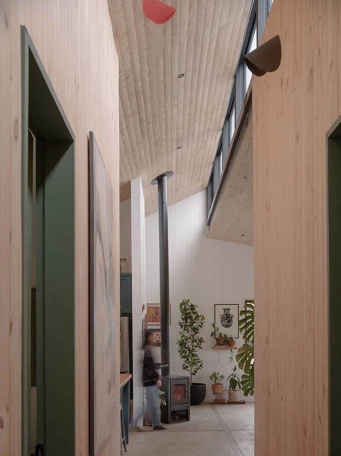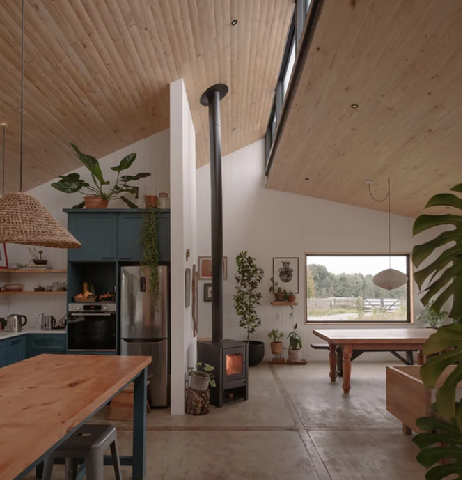 Dom został zaprojektowany jako modułowa konstrukcja uniesiona nad ziemią, wsparta na stalowych słupach, co pozwala lepiej zintegrować się z otaczającą przyrodą i zminimalizować wpływ na teren. Użycie surowego drewna sosnowego oraz drewna konstrukcyjnego wewnątrz tworzy ciepłe, przyjazne wnętrze w pełni zgodne z ideą zrównoważonej architektury. Projekt wykorzystuje elementy charakterystyczne dla stylu nowoczesnej stodoły, jak dwuspadowy dach, duże przeszklenia oraz funkcjonalny, prosty układ przestrzenny.