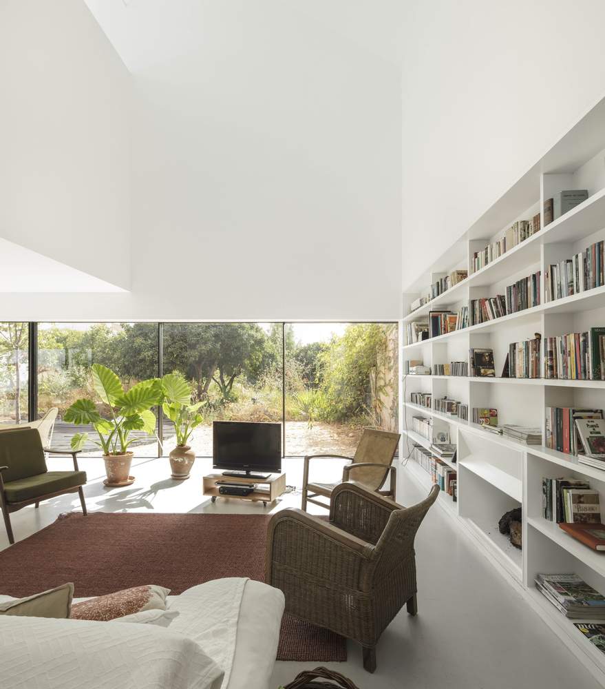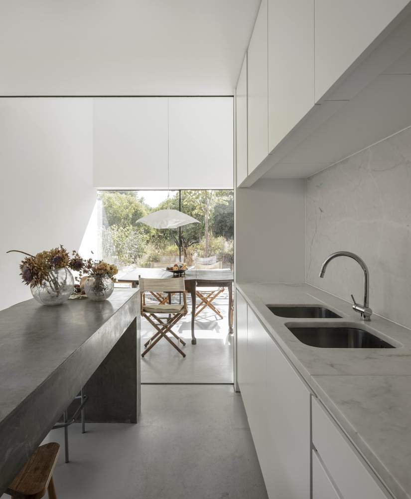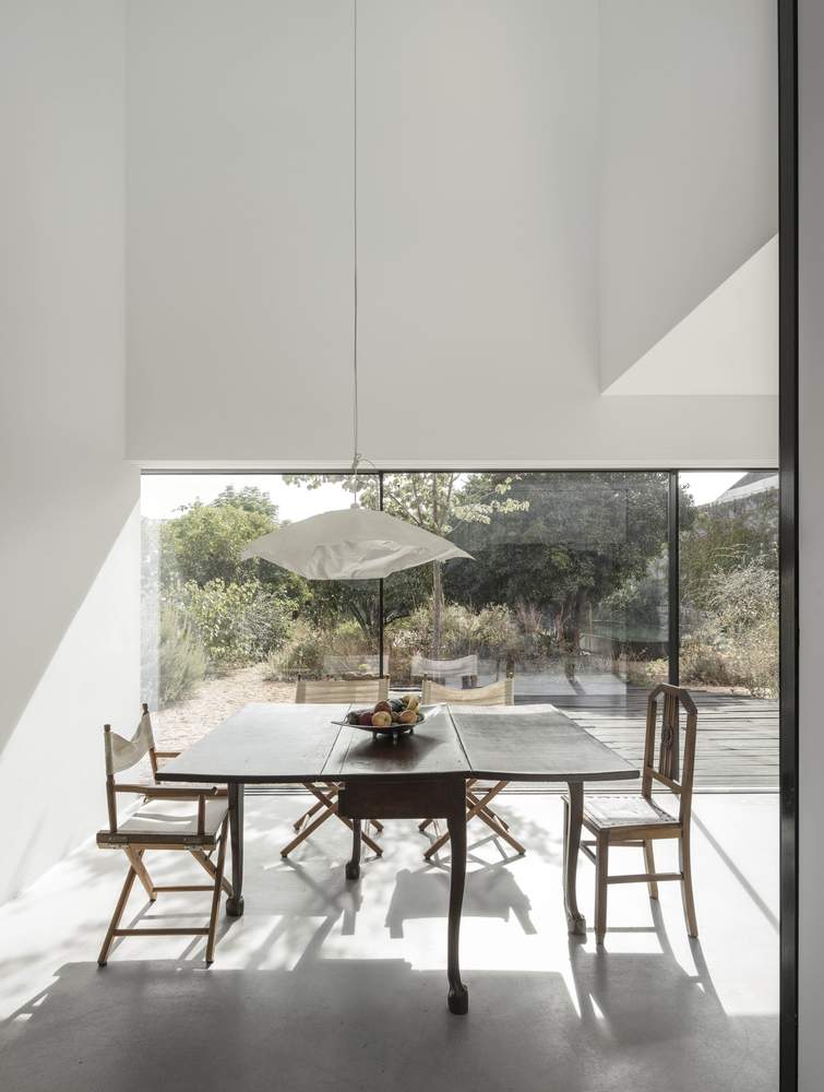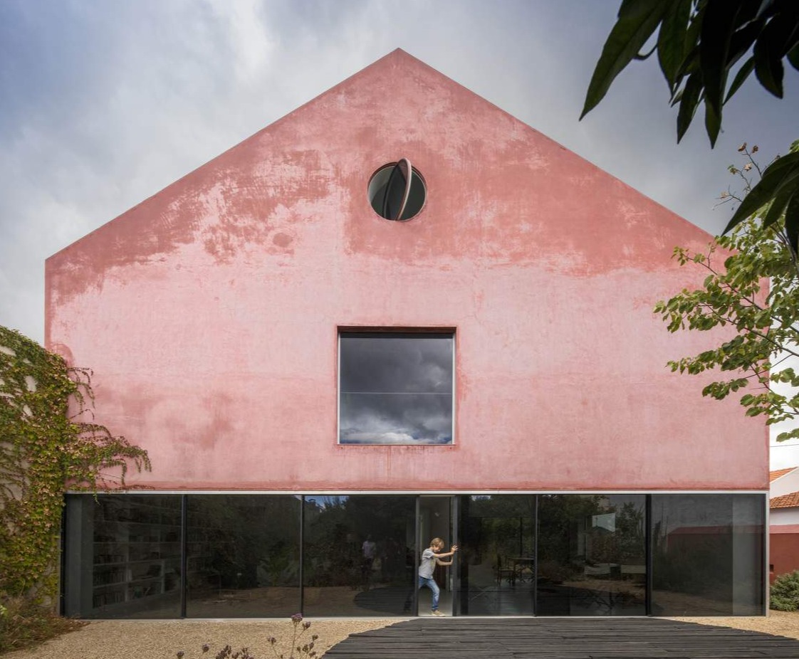 Recykling materiałów budowlanych i użycie lokalnych technik budowlanych stanowi fundament nowoczesnej stodoły w Azeitão. Zachowanie istniejących murów zmusiło do wykorzystania pierwotnych materiałów – dachówki, kamienie, a także drewnianą konstrukcję dachu, którą przekształcono w taras zewnętrzny. Dzięki zastosowaniu pigmentowanego tynku wapiennego, opracowanego przez lokalną firmę, dom może starzeć się w naturalny sposób. Dodanie naturalnego czerwonego pigmentu pozwala na stopniową zmianę koloru, który zależy od wilgotności powietrza – w deszczu dom przyjmuje niemal czarny odcień.