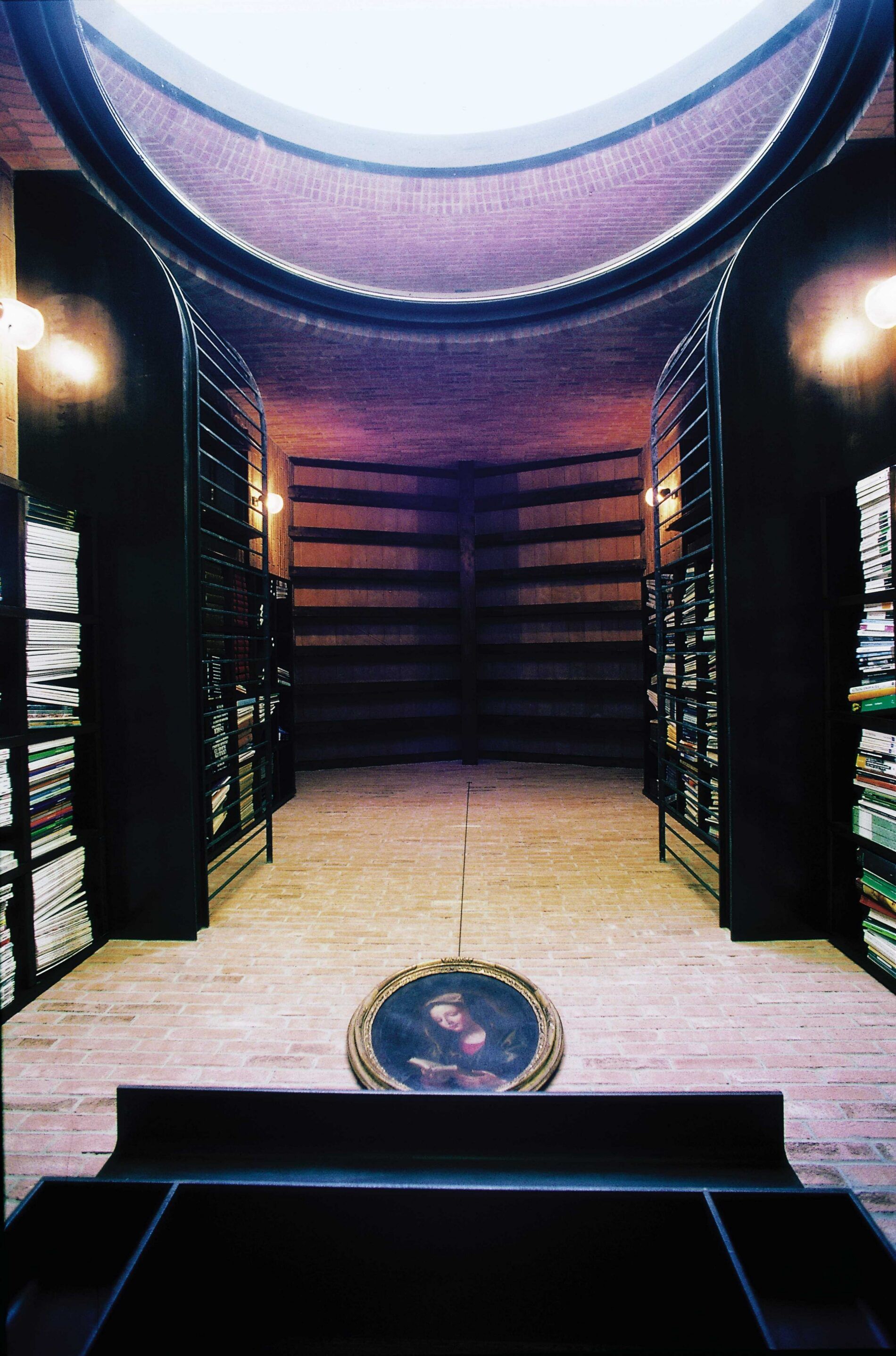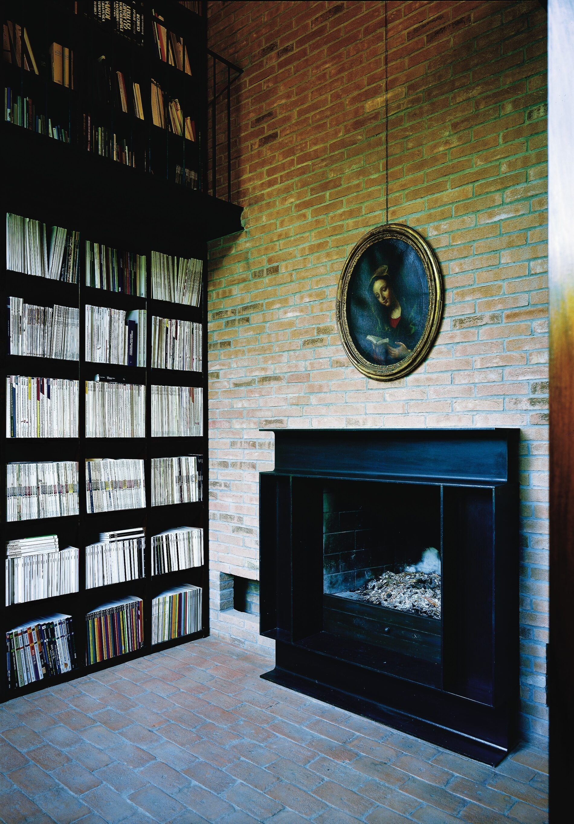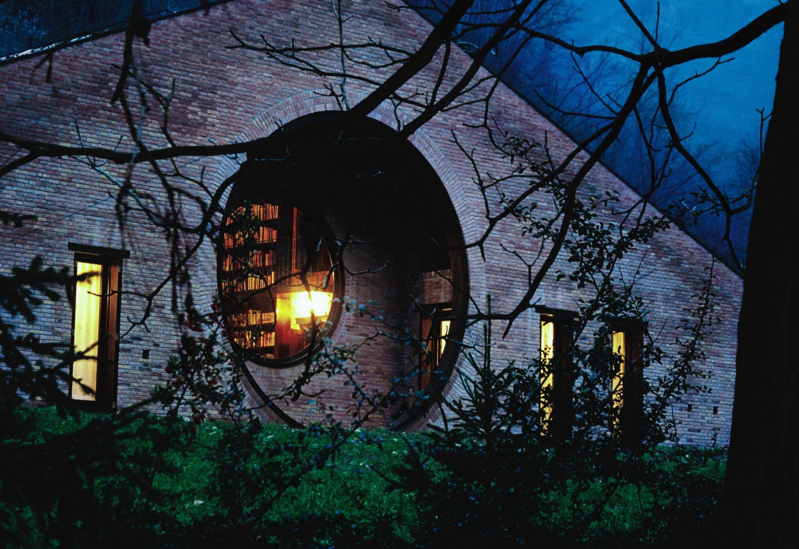 Centralnym elementem konstrukcyjnym i przestrzennym domu jest dwukondygnacyjna biblioteka, pełniąca rolę fundamentu całej kompozycji. To właśnie ona stanowi „serce” budynku, z charakterystycznym okrągłym oknem – „okiem domu” – które obserwuje, absorbuje i odbija otaczający krajobraz. Wnętrze biblioteki wykończono odsłoniętą cegłą, widoczną również na elewacjach, co nadaje przestrzeni półpubliczny, niemal teatralny charakter. Książki stają się tu elementem architektonicznym, poszerzając przestrzeń w sensie fizycznym i symbolicznym, a jedynym kontrapunktem dla nich jest masywny kominek umieszczony naprzeciwko okna. Ta surowa, wyrazista forma bywa porównywana do archetypu, jakim jest nowoczesna stodoła, przefiltrowana przez język ceglanej architektury i współczesnej narracji przestrzennej.