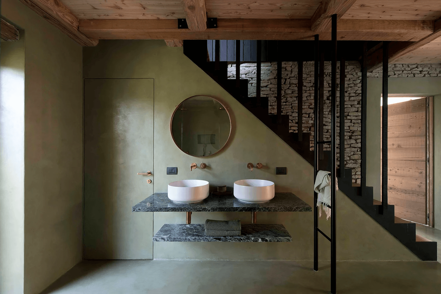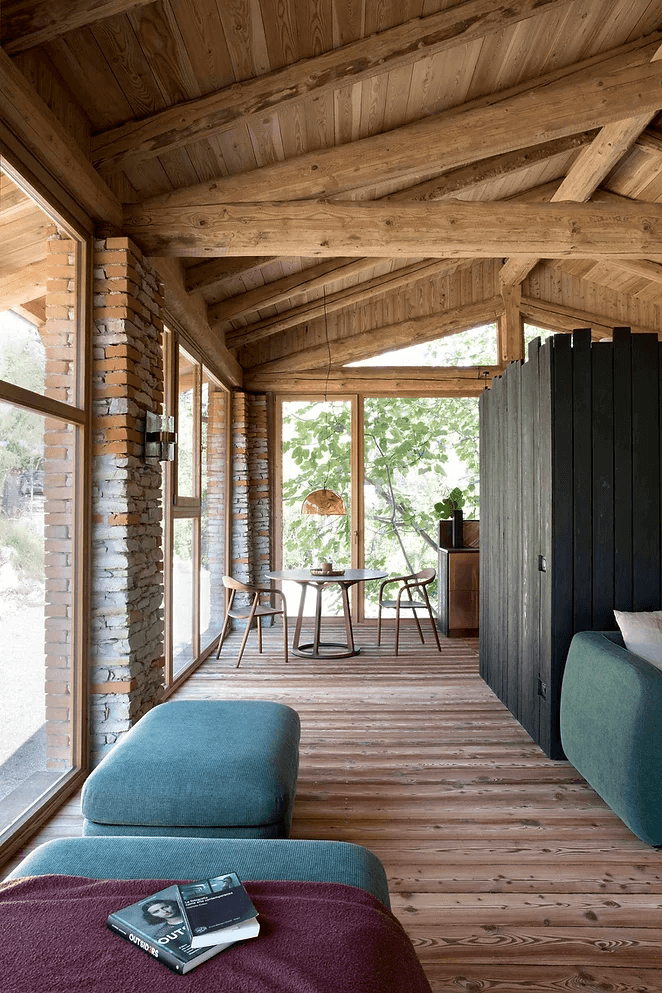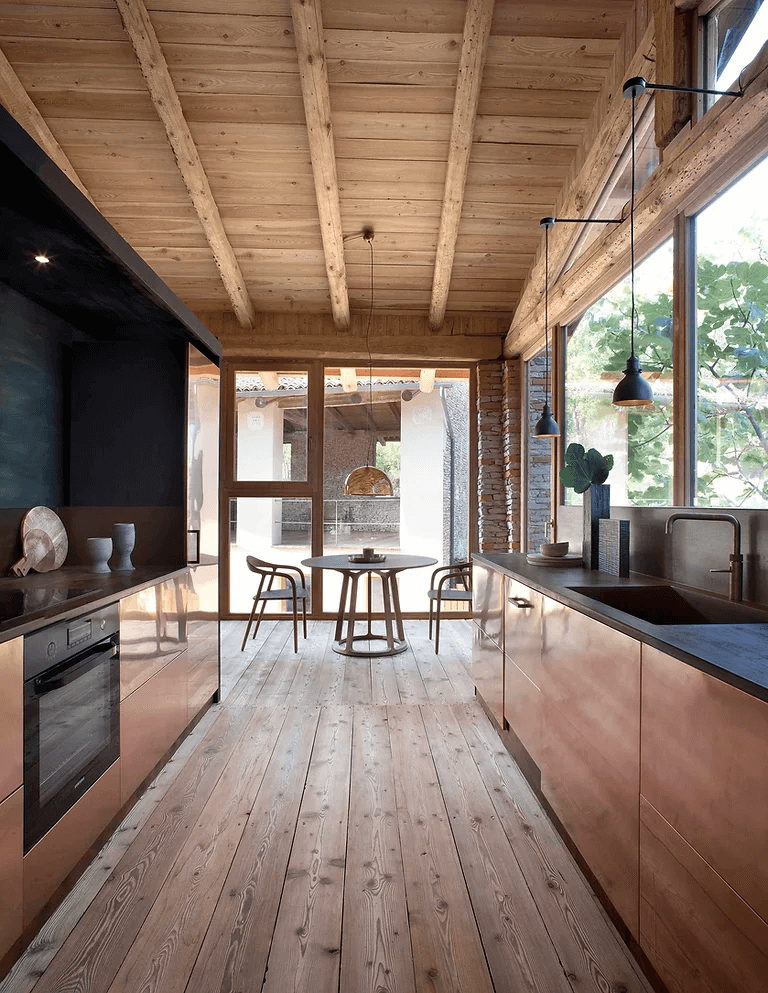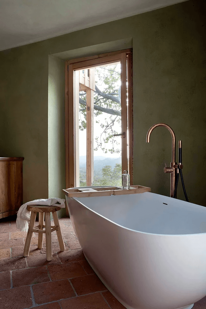 Wnętrze zdominowane jest przez ciepłe odcienie cocciopesto i limonki, a drewniane podłogi zostały pokryte pastelowymi, odzyskanymi płytkami z terakoty, co dodaje posiadłości rustykalnego, ale nowoczesnego charakteru.