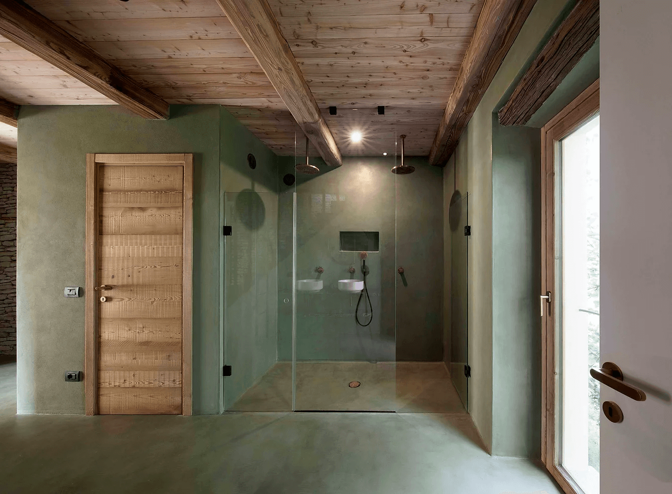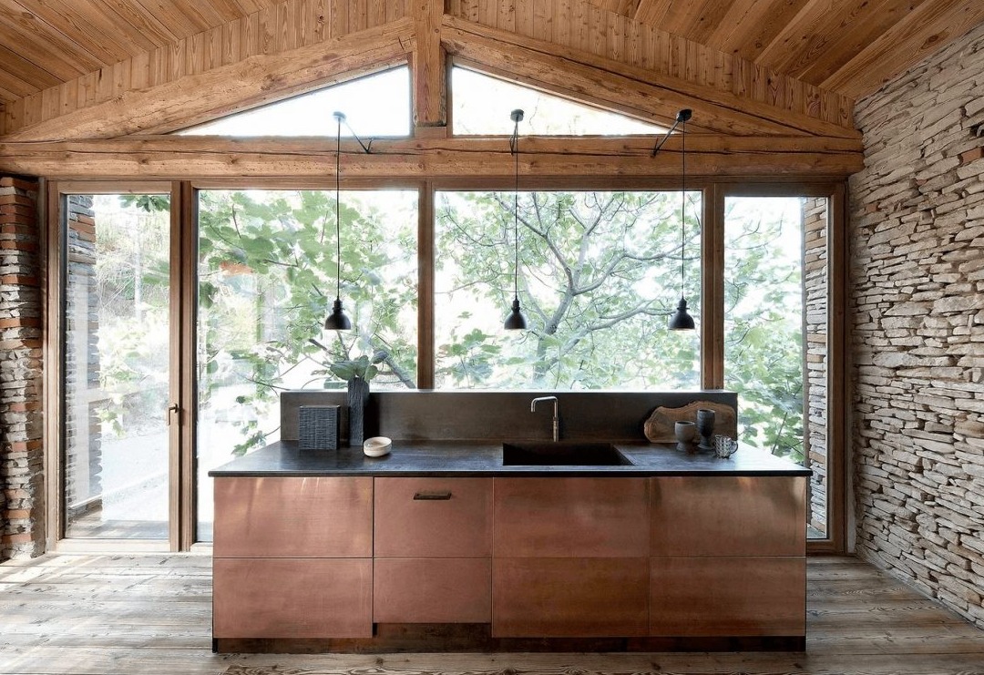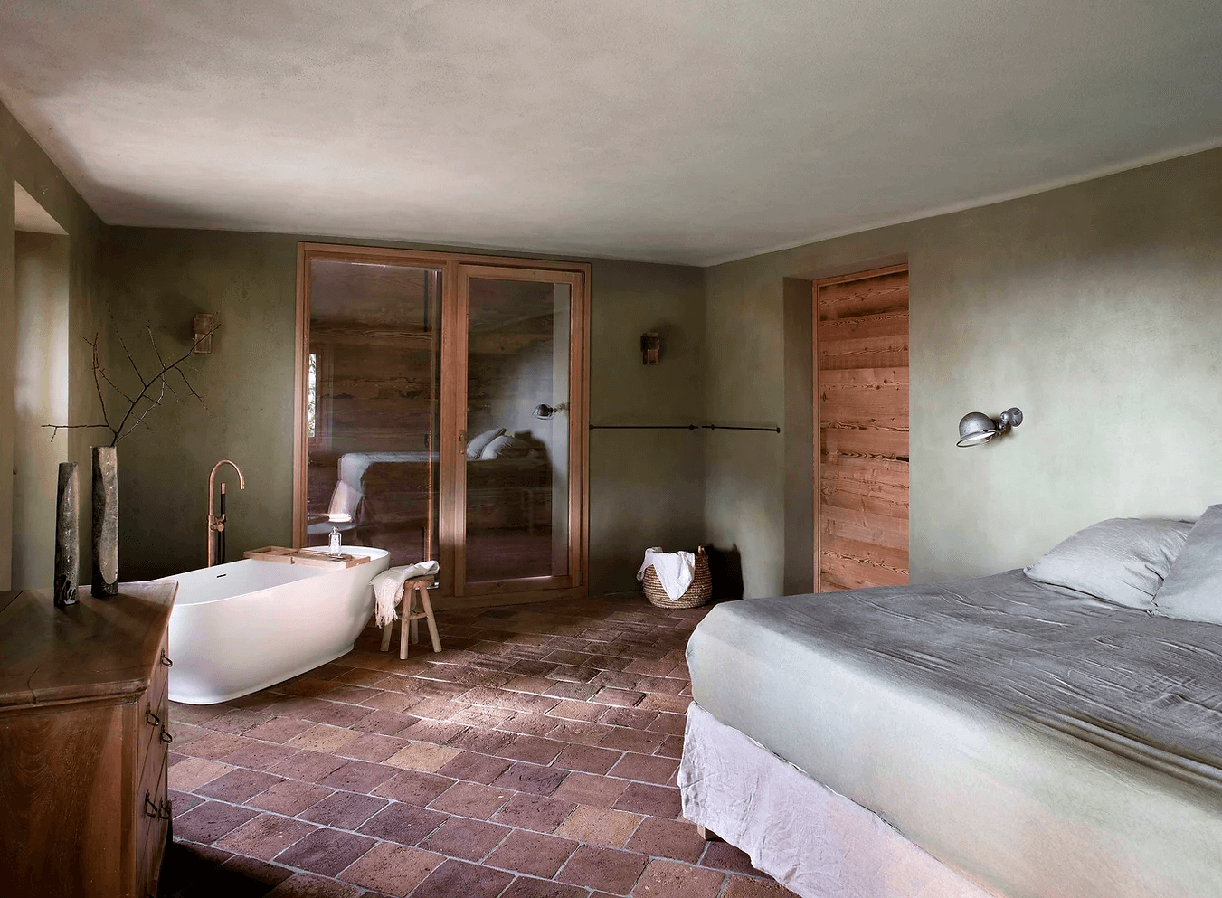 Wnętrze zdominowane jest przez ciepłe odcienie cocciopesto i limonki, a drewniane podłogi zostały pokryte pastelowymi, odzyskanymi płytkami z terakoty, co dodaje posiadłości rustykalnego, ale nowoczesnego charakteru.