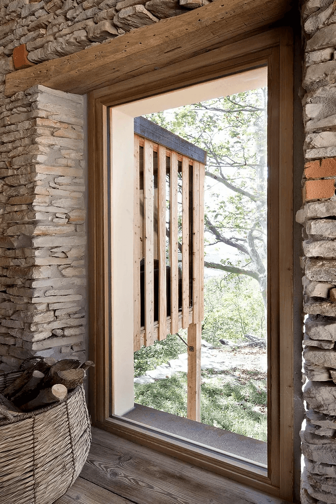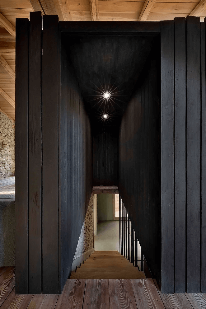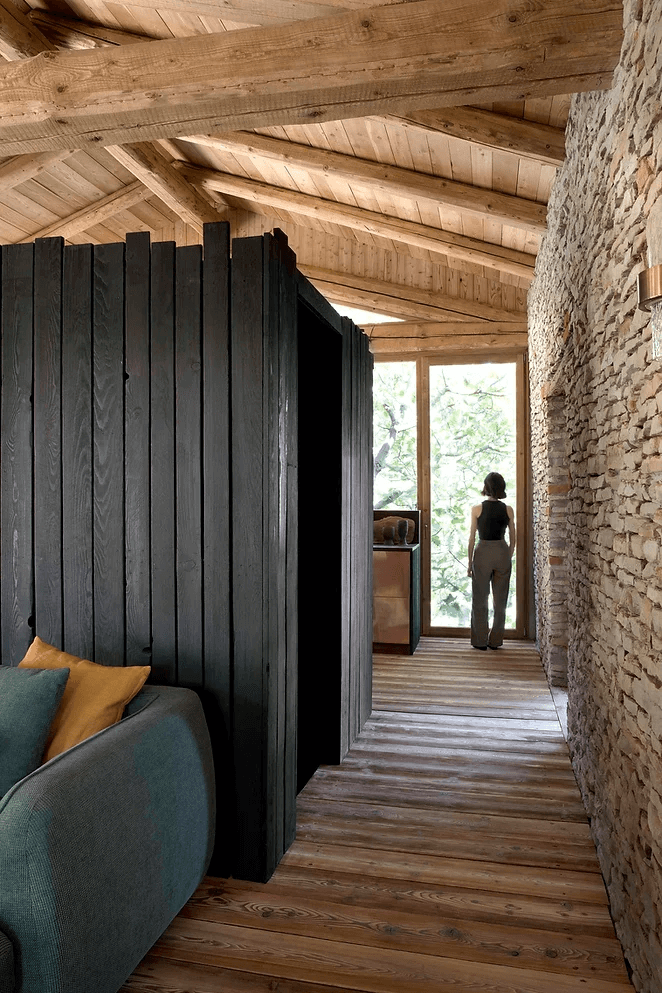 W Cascina_B można podziwiać wyjątkowe połączenie wiejskiego uroku Alta Langa z innowacyjnymi rozwiązaniami architektonicznymi. W ramach renowacji, Studio Officina82 starannie połączyło stodołę z domem głównym, wprowadzając nowoczesne elementy, które zachowały ducha tradycji. Kamienne mury zostały precyzyjnie odrestaurowane, a dach z drewna przeszlifowany, by nadać mu świeży wygląd. Nowa drewniana dobudowa pełni funkcję ogrodu zimowego, który łączy się z przestrzenią dzienną, tworząc niezwykłą przestrzeń. Domek na drzewie zlokalizowany wśród platanów to dodatkowy akcent, który wpisuje się w naturalny krajobraz.