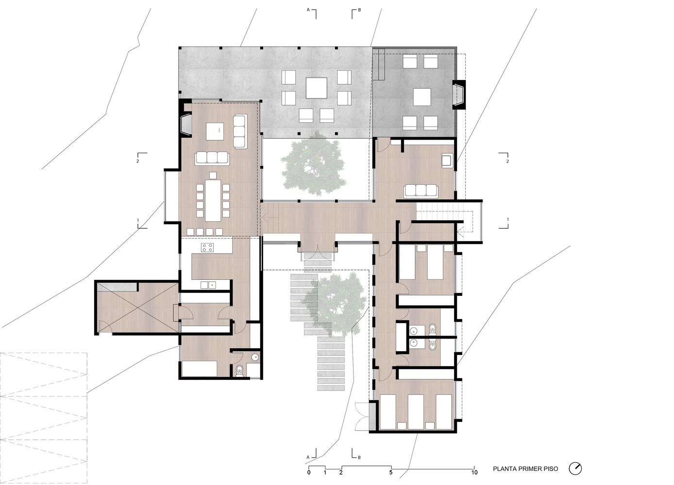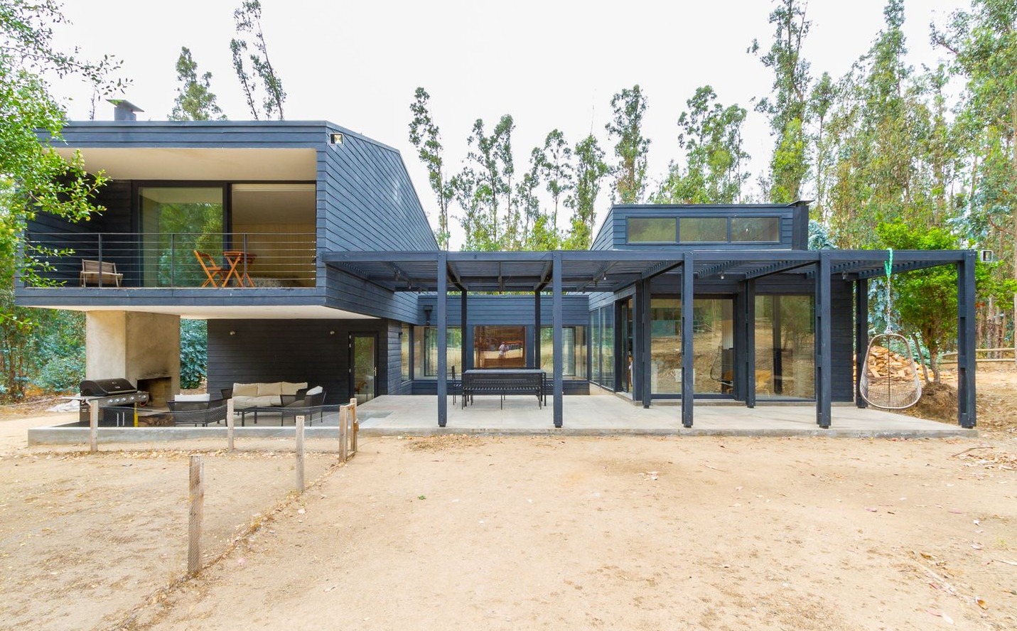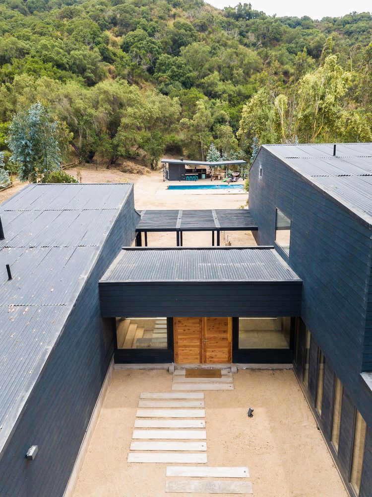 Dwie bryły z sypialniami ustawiono równolegle i połączono przeszklonym korytarzem oraz tarasem, dzięki czemu dom przyjął kształt litery „H”. Pomiędzy nimi powstały dwa patia: jedno tworzy kameralne wejście, drugie pełni funkcję świetlnej przestrzeni otwartej na zbocze i zewnętrzny kominek. W projekt wkomponowano istniejące drzewa, które pomagają regulować nasłonecznienie i budować atmosferę wnętrz. Uzupełnieniem założenia jest lekki pawilon z grillem, odsunięty od głównej bryły domu, wyznaczający granicę pomiędzy uporządkowaną architekturą a dziką, nienaruszoną przyrodą Chile.
