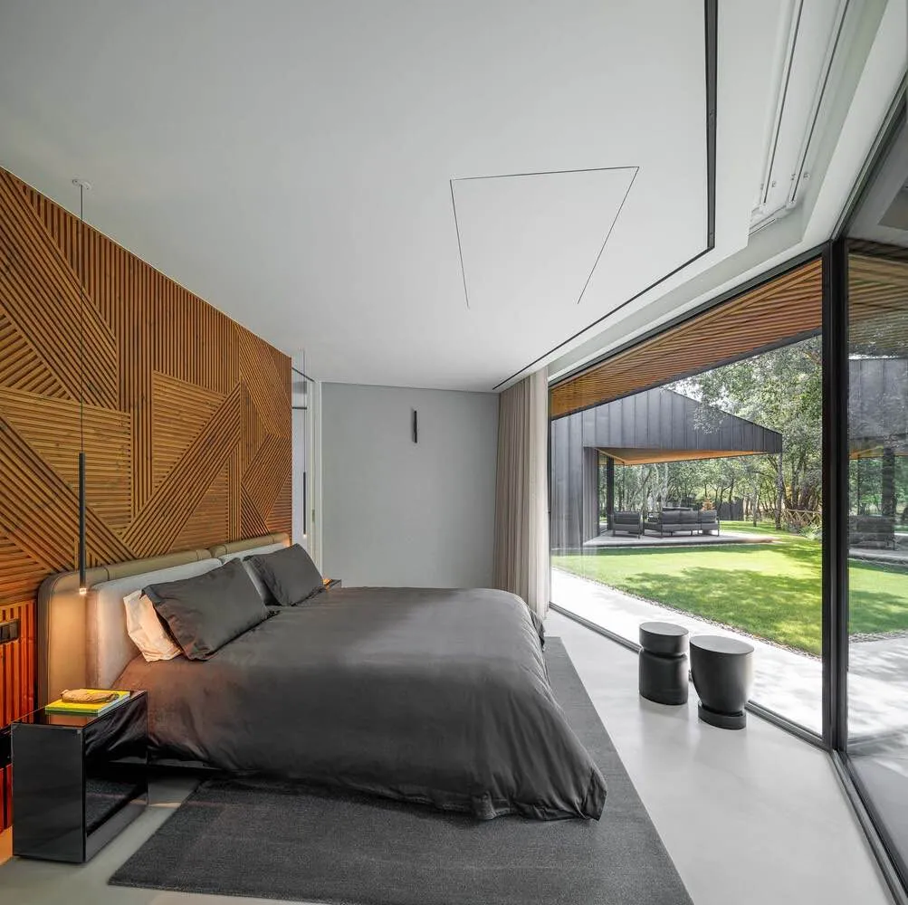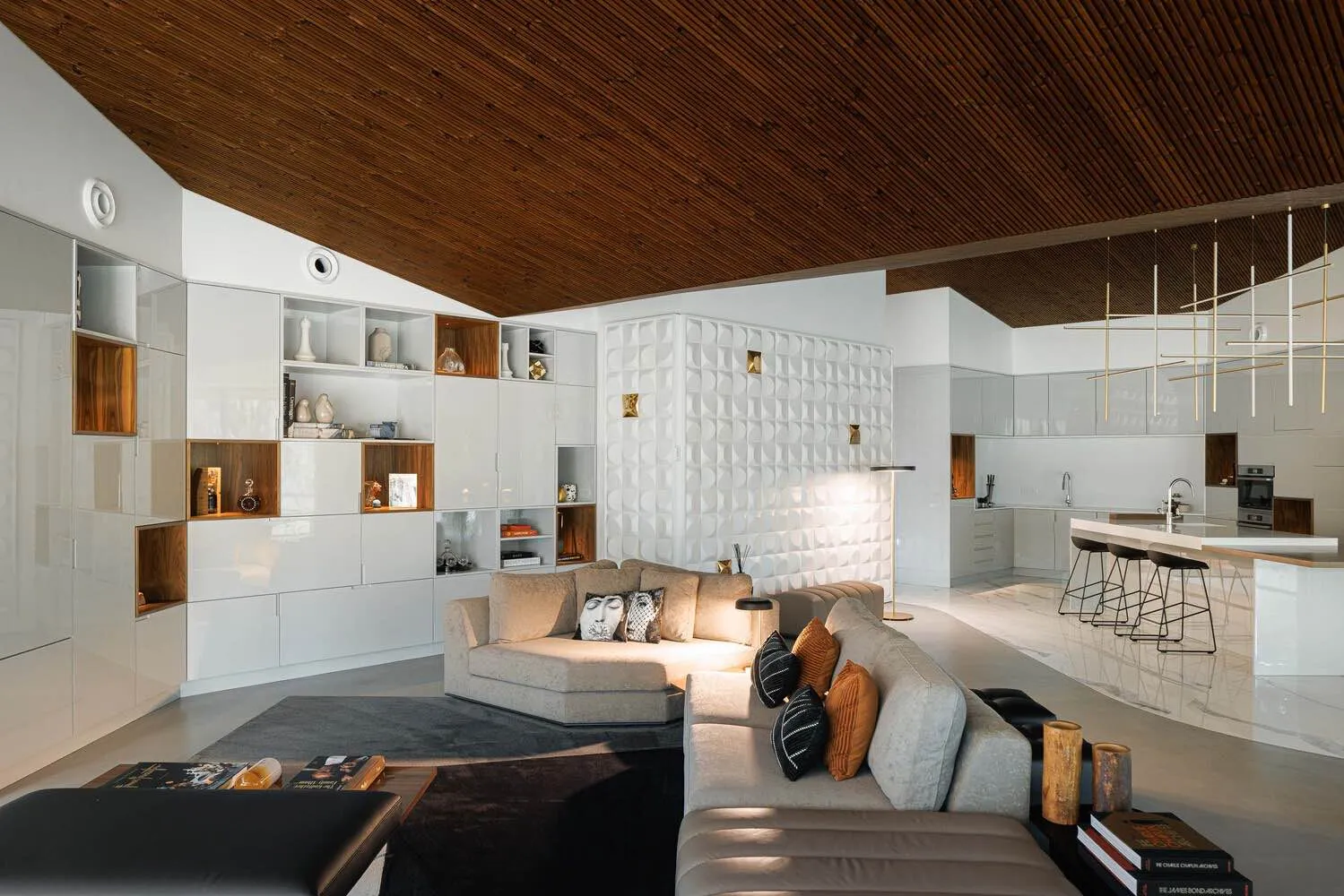 Wnętrza CC House utrzymano w spokojnej, neutralnej tonacji, która sprzyja wyciszeniu i kontemplacji. Drewno odgrywa kluczową rolę w kształtowaniu atmosfery pomieszczeń, nadając im ciepło i naturalność. Przestrzenie mieszkalne otwierają się na otoczenie poprzez duże przeszklenia, dzięki czemu granica pomiędzy wnętrzem a krajobrazem ulega zatarciu, a natura staje się stałym elementem codziennego życia.