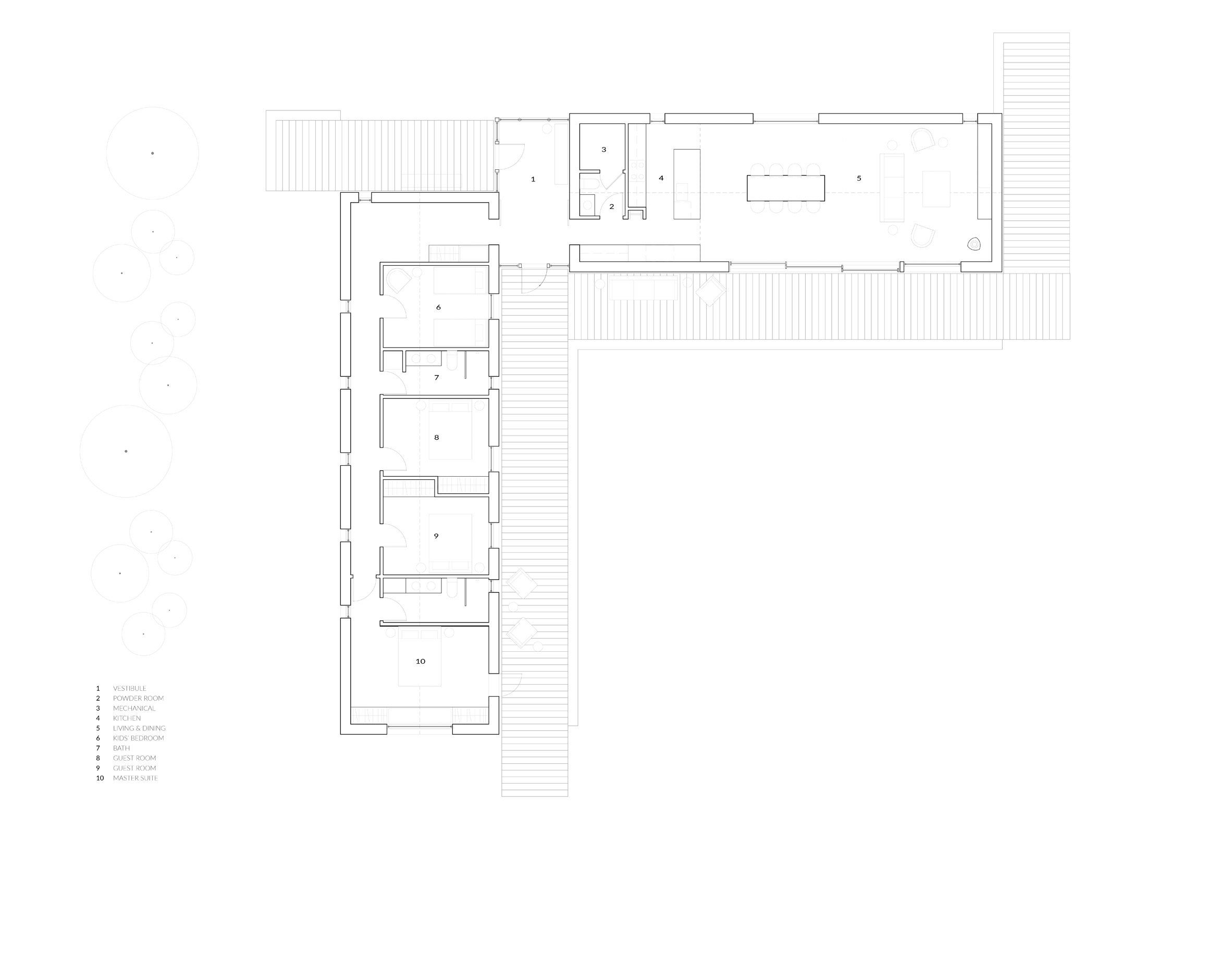 W jednym skrzydle zaplanowano strefę prywatną – dwie sypialnie z łazienkami. Drugie skrzydło przeznaczono na część wspólną: otwartą kuchnię połączoną z jadalnią i salonem. Przestrzenie te płynnie łączą się z tarasami i ogrodem dzięki dużym przeszkleniom i drzwiom przesuwnym, które zapewniają naturalną wentylację i piękne widoki na jezioro.