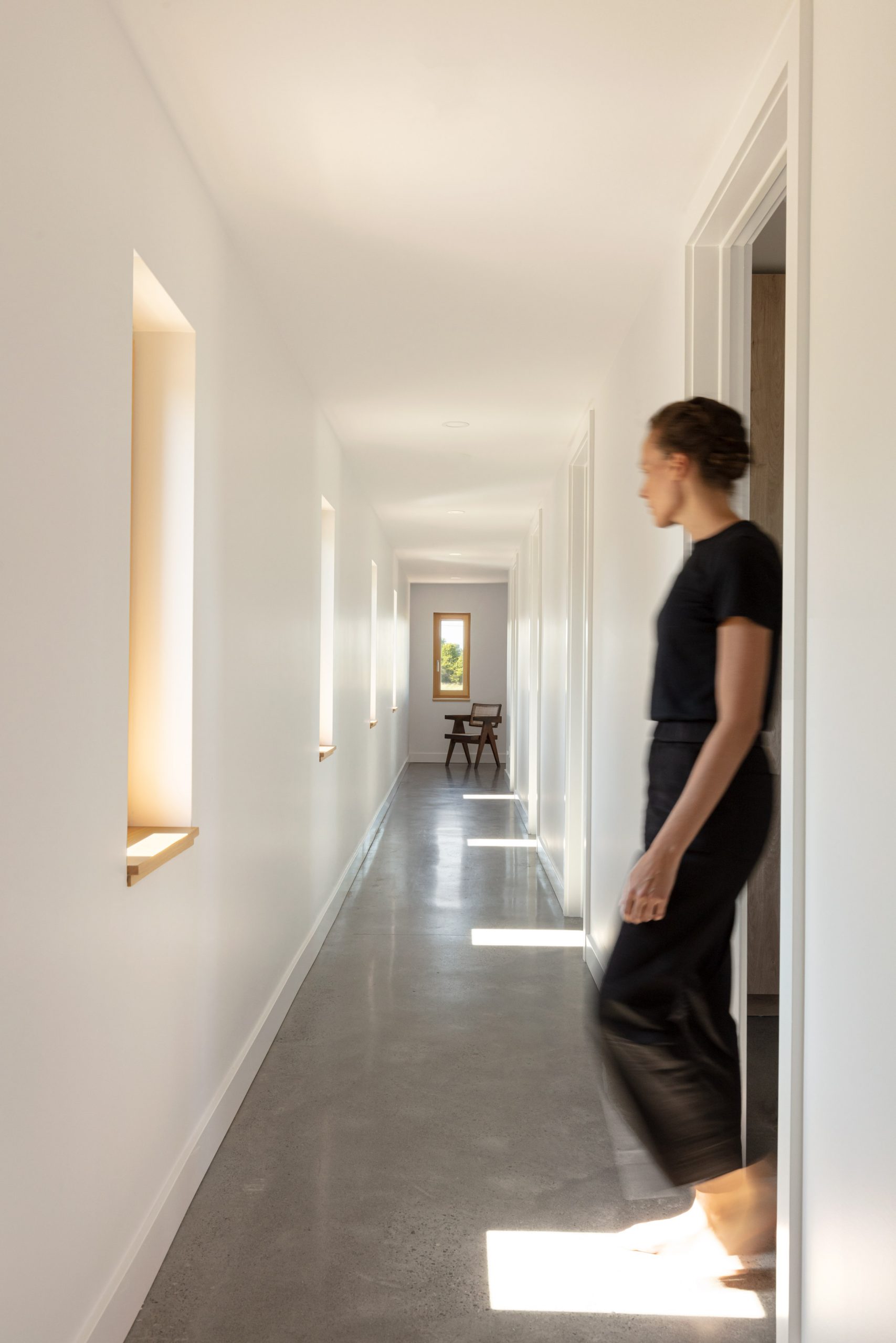 W przeciwieństwie do ciemnej, drewnianej fasady, wnętrza Ell House utrzymano w jasnej, naturalnej kolorystyce. Pojawiają się tu białe meble w zabudowie, sufity z bielonej sosny oraz detale z jasnego dębu, co nadaje przestrzeniom lekkości i ciepła. Dzięki dużym przeszkleniom wnętrza wypełnia światło dzienne, a każdy pokój ma bezpośrednie połączenie z krajobrazem.