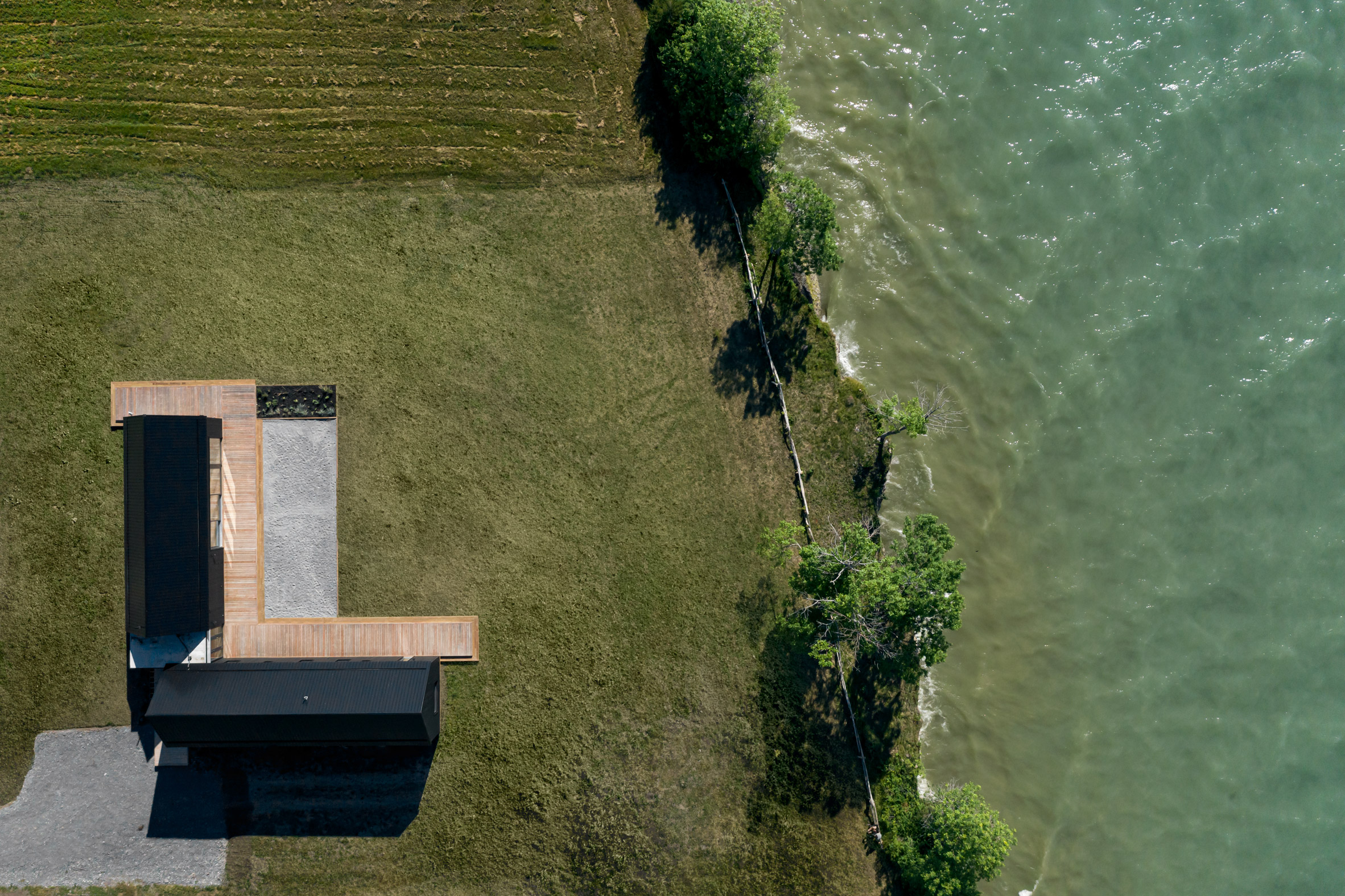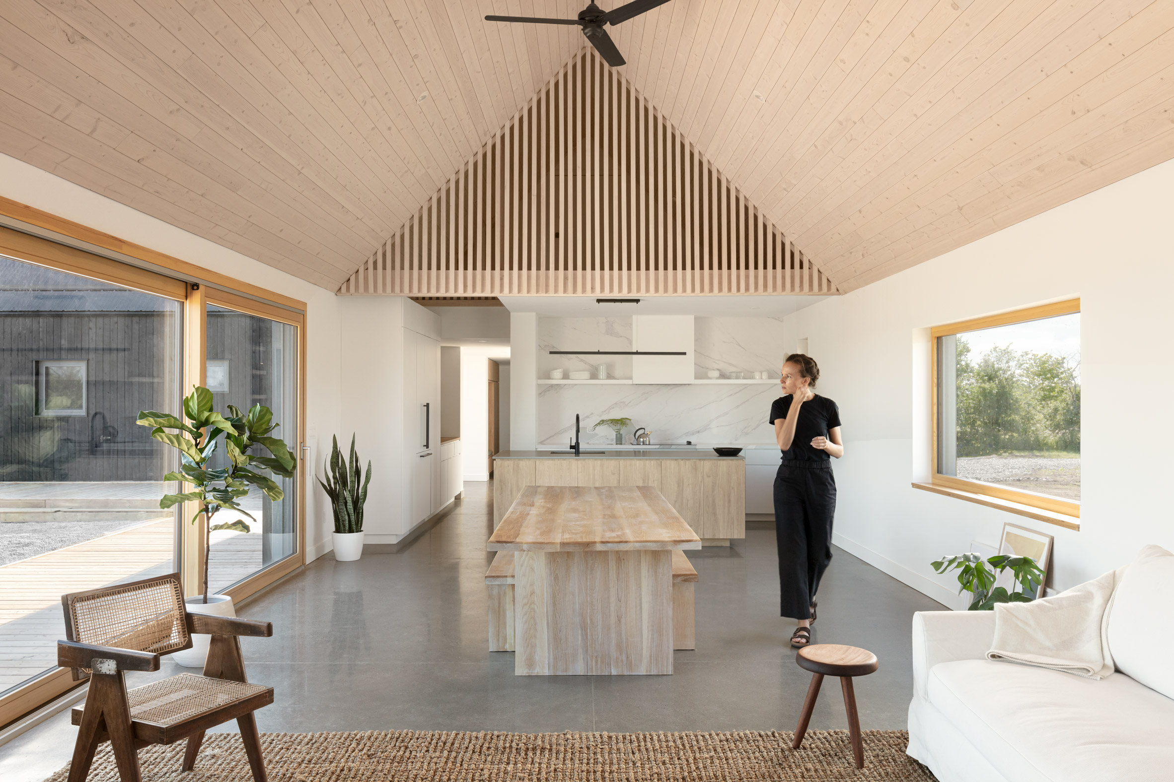 Dom składa się z dwóch skrzydeł połączonych przeszklonym, jasnym łącznikiem. Rozwiązanie to przypomina tradycyjne dobudówki charakterystyczne dla wiejskich domostw Kanady, a jednocześnie odpowiada na lokalne warunki klimatyczne. Jedno skrzydło osłania drugie przed południowo-zachodnimi wiatrami, tworząc spokojną przestrzeń mieszkalną oraz kameralny dziedziniec z tarasem otwierającym się na jezioro.