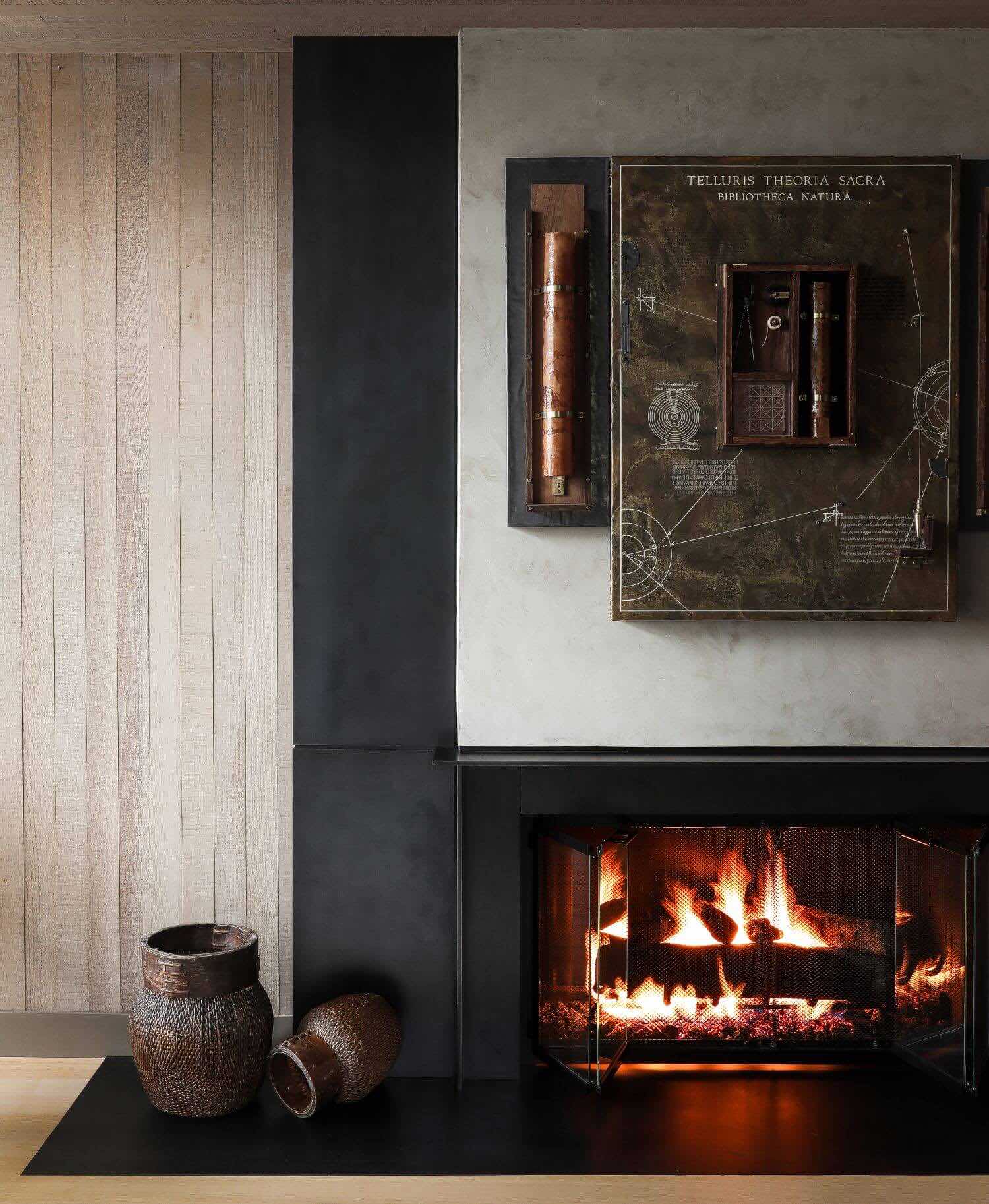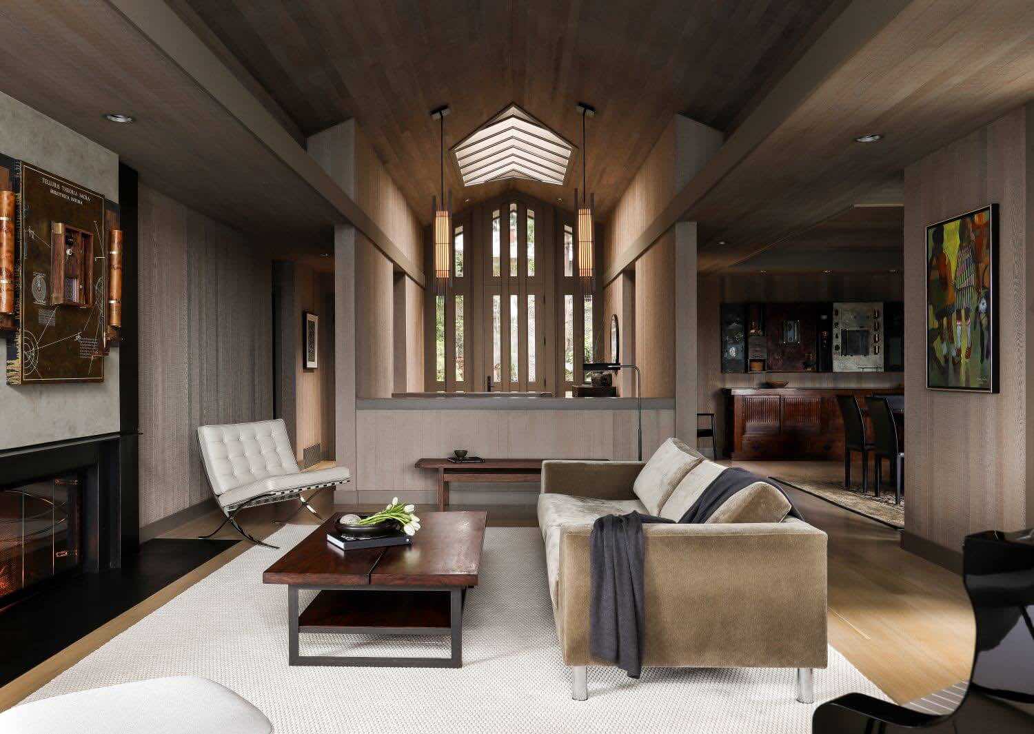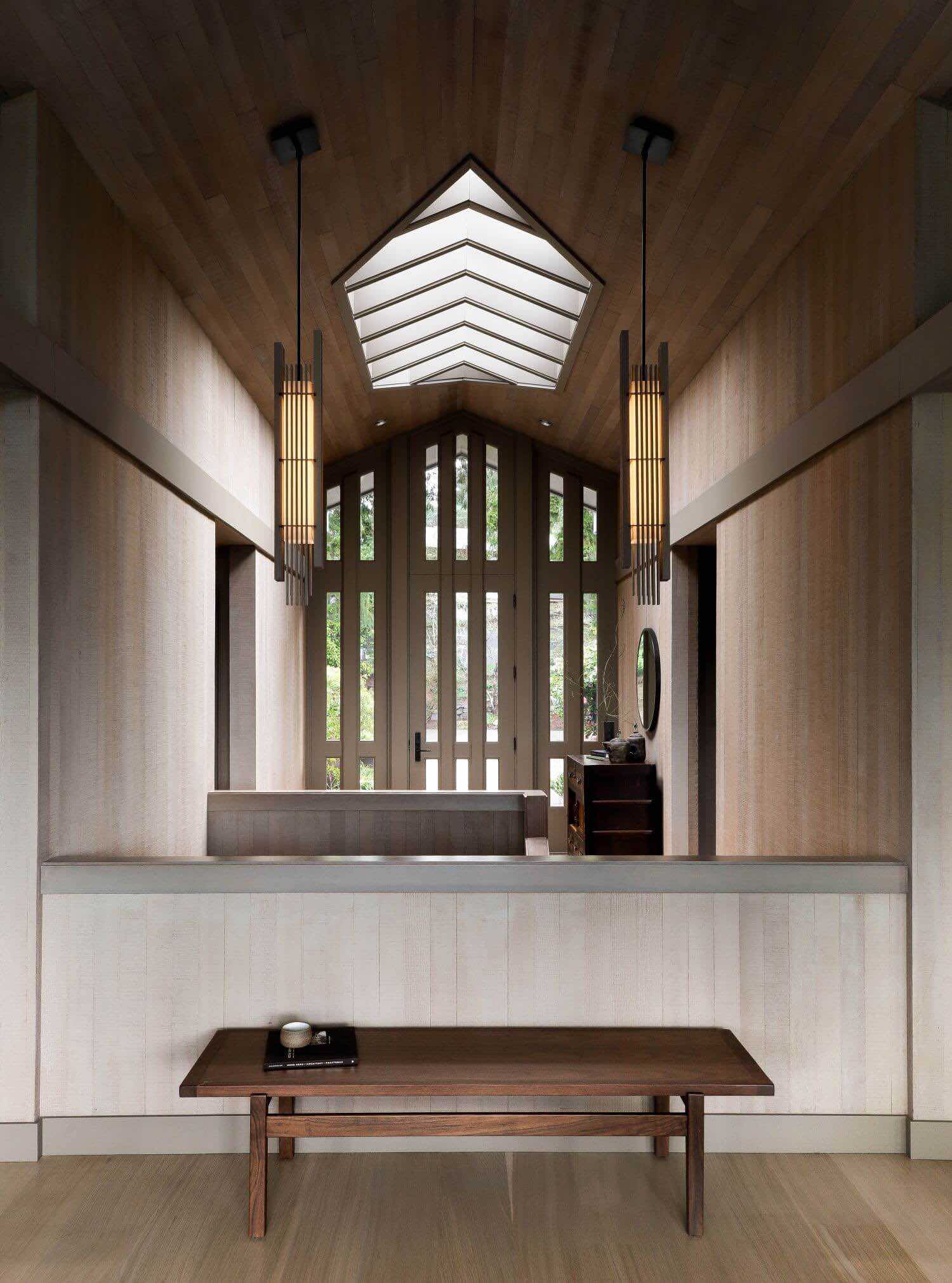 Wysokie, sklepione foyer z okładzinami cedrowymi wyznacza centralną oś domu i pozostaje najbardziej zachowaną częścią pierwotnej struktury. Nowe oświetlenie LED zostało skalibrowane tak, aby podkreślać rysunek drewna i równoważyć jego ciężar. W jadalni i salonie wymieniono podłogi na dąb biały o nieregularnym rysunku słojów, a kominek zyskał minimalistyczne wykończenie ze stali i masy Milestone.