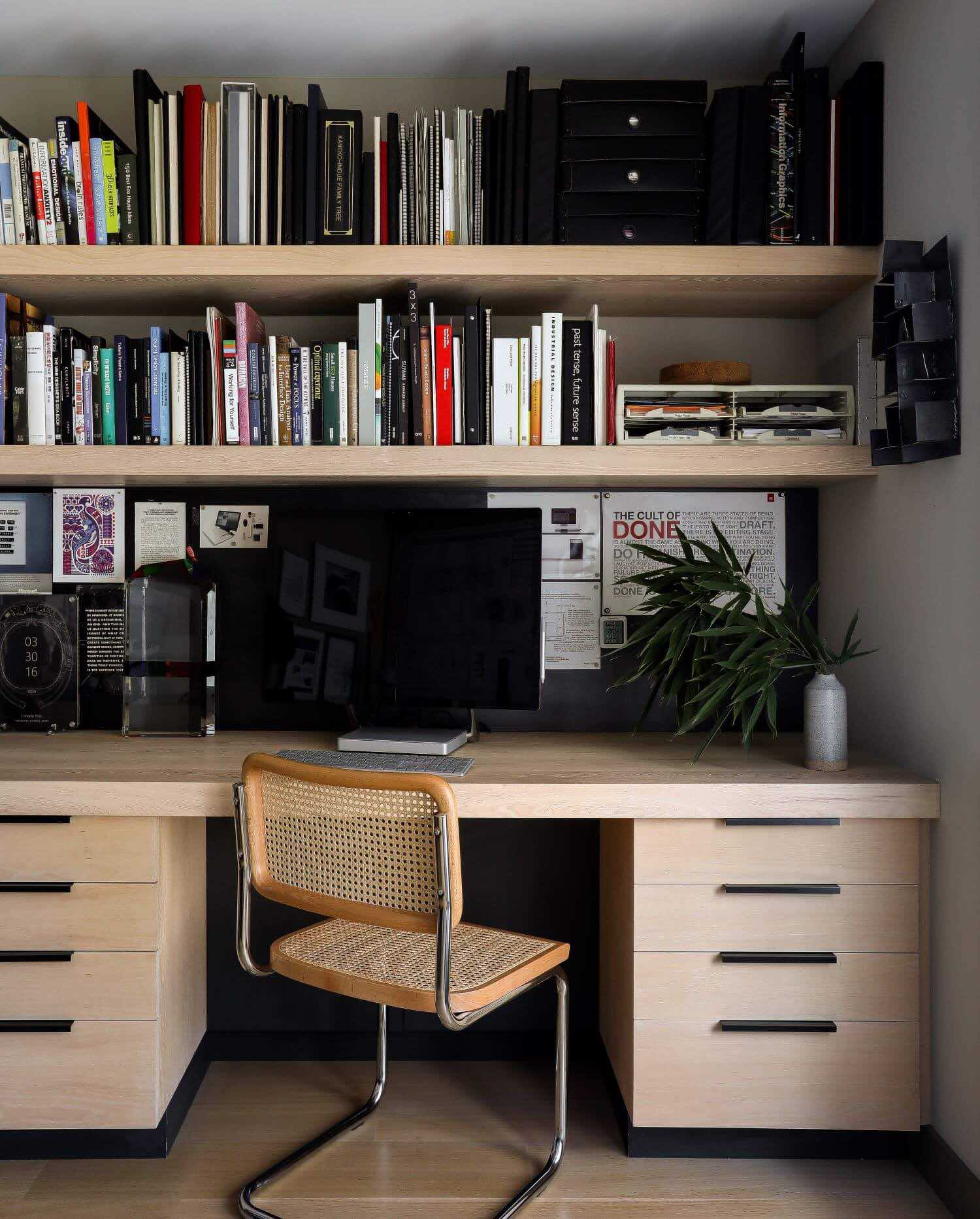 Dom odpowiada również na współczesne potrzeby pracy zdalnej. Gabinet został wyposażony w biurko z drewna jesionowego, stalową tablicę i panel z białej porcelany, który umożliwia szkicowanie i przypinanie projektów. W łazience dla gości zastosowano przemyślane rozwiązania – kompaktowe urządzenia, ścienne baterie i otwarte półki optycznie powiększają przestrzeń, a wykończenia z Milestone wprowadzają atmosferę spokoju i prostoty.