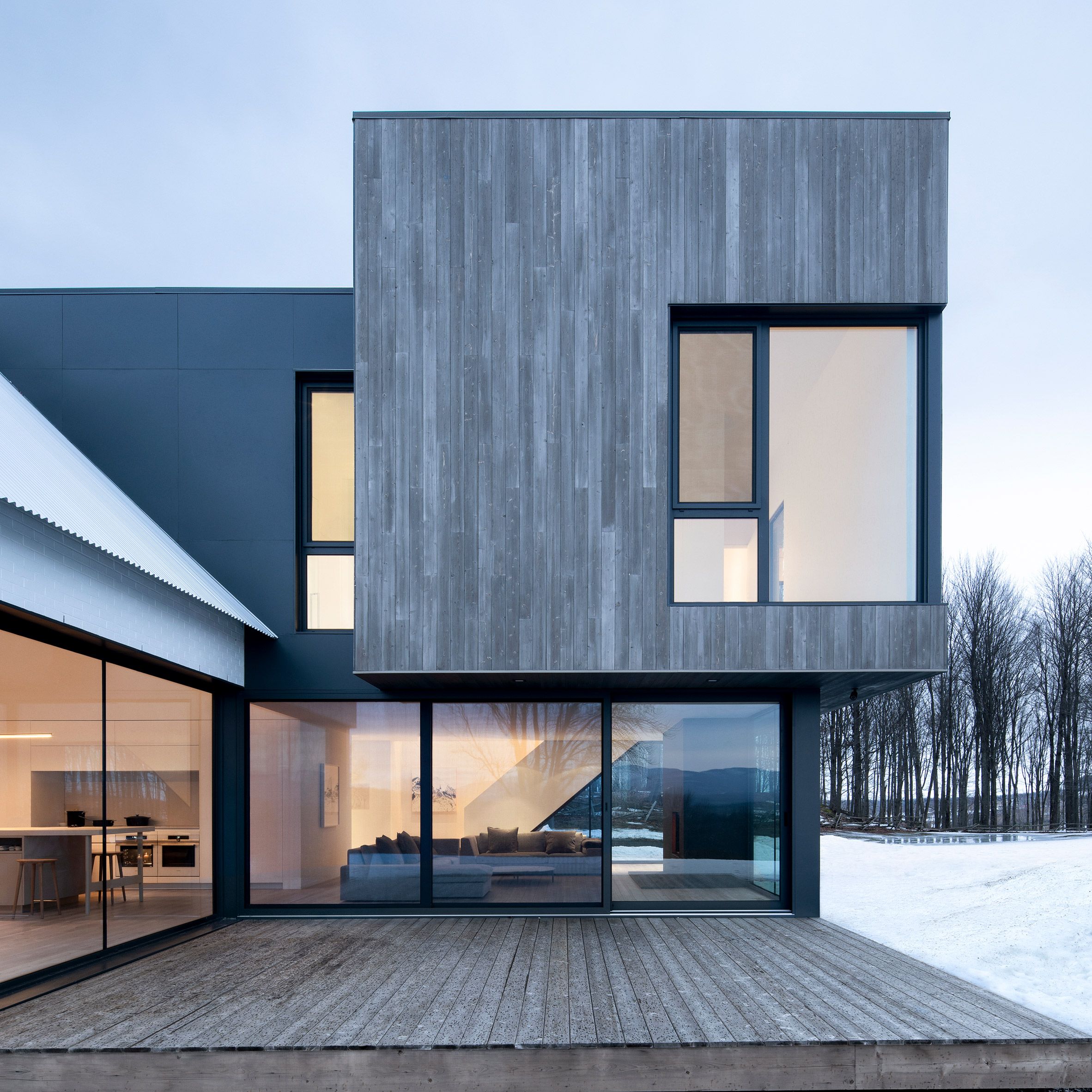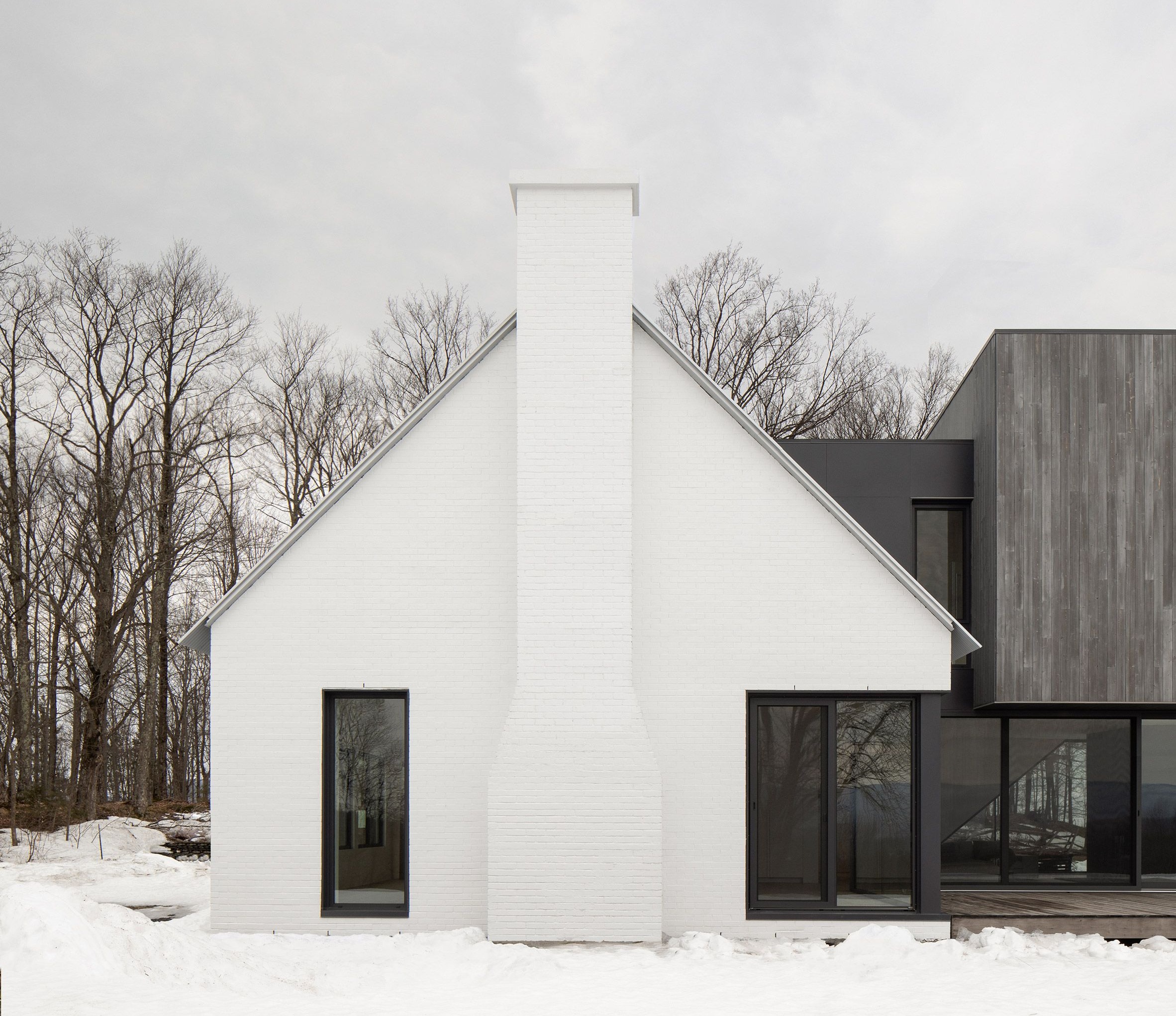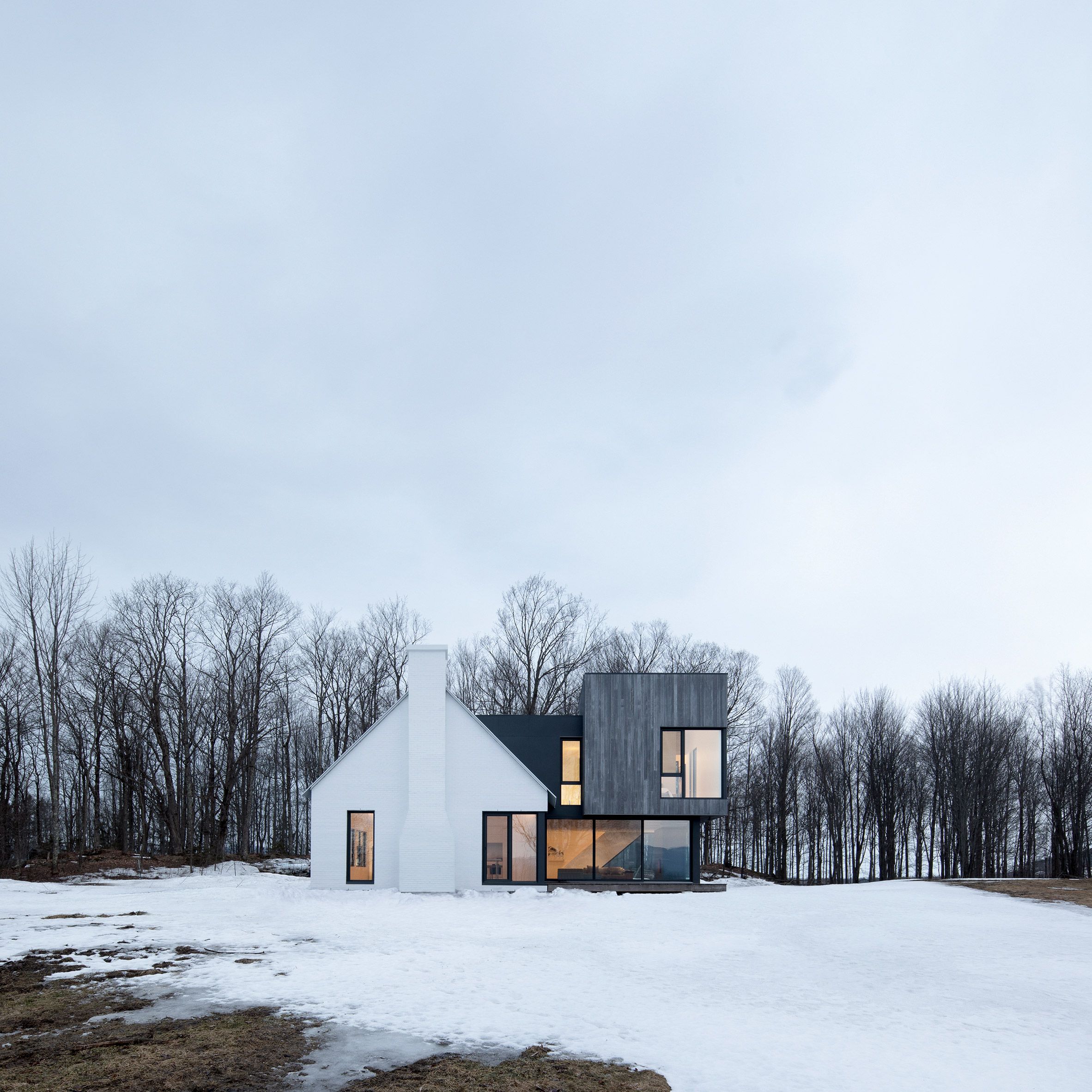 Studio Thomas Balaban Architect z Montrealu przekształciło klasyczny, wiejski dom z dwuspadowym dachem w całkowicie biały budynek, który kontrastuje z nową przybudówką obitą surowym drewnem cedrowym. Projekt rezydencji Knowlton, położonej w malowniczych rejonach Quebecu w Kanadzie, powstał z myślą o przekształceniu dotychczasowego domku weekendowego w przestronny, całoroczny dom. Architekci zaprojektowali dwupoziomową przybudówkę w miejscu dawnej dobudówki, podnosząc budynek, co pozwoliło uzyskać więcej przestrzeni i lepsze widoki bez ingerencji w zbocze terenu.