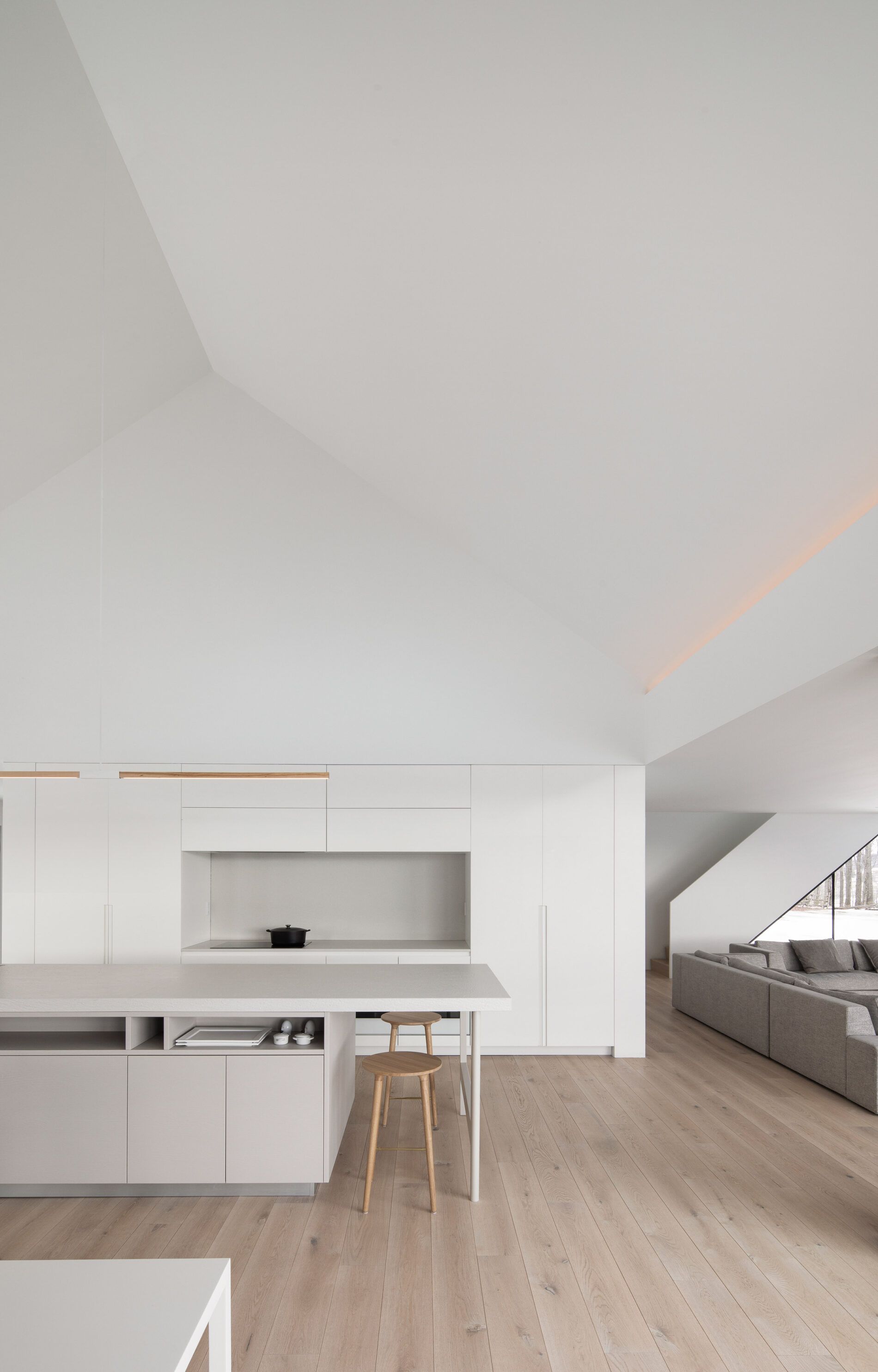 Wnętrza rezydencji Knowlton mają minimalistyczny charakter, z jasnymi podłogami, białymi ścianami i meblami inspirowanymi skandynawskim stylem. Odsłonięty dach w części starego domu potęguje wrażenie przestronności, a prostota materiałów i monochromatyczna paleta barw subtelnie podkreślają geometryczne kształty pomieszczeń. Trzy sypialnie z łazienkami oraz dodatkowe pomieszczenie telewizyjne na wyższym poziomie zapewniają wygodę całej rodziny, a otwarta kuchnia, jadalnia i salon w przybudówce tworzą spójną, komfortową przestrzeń mieszkalną.