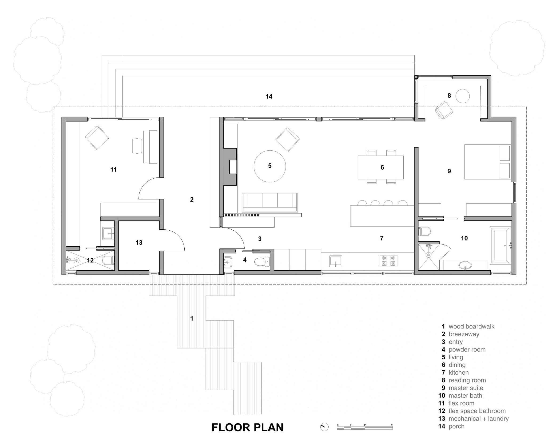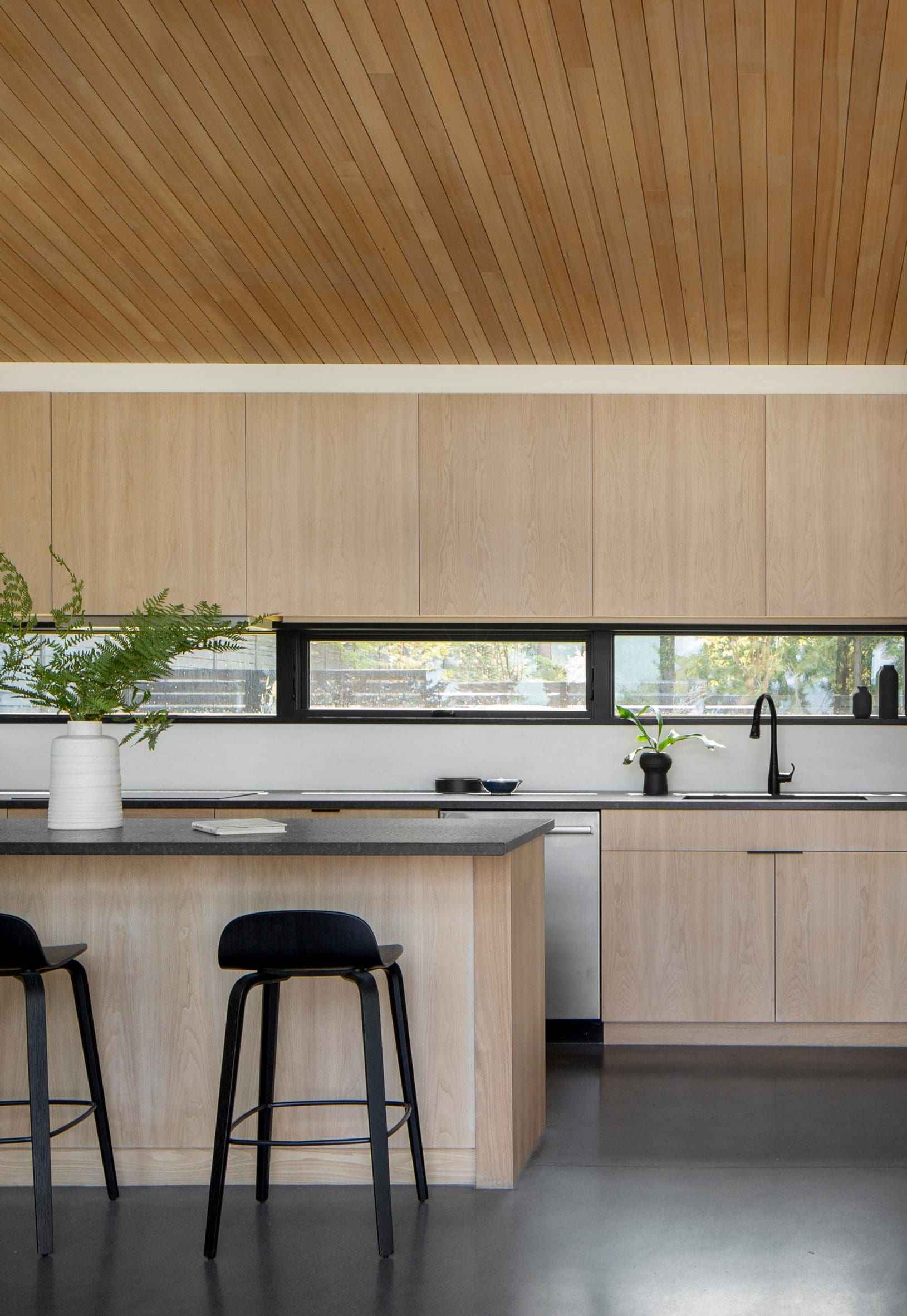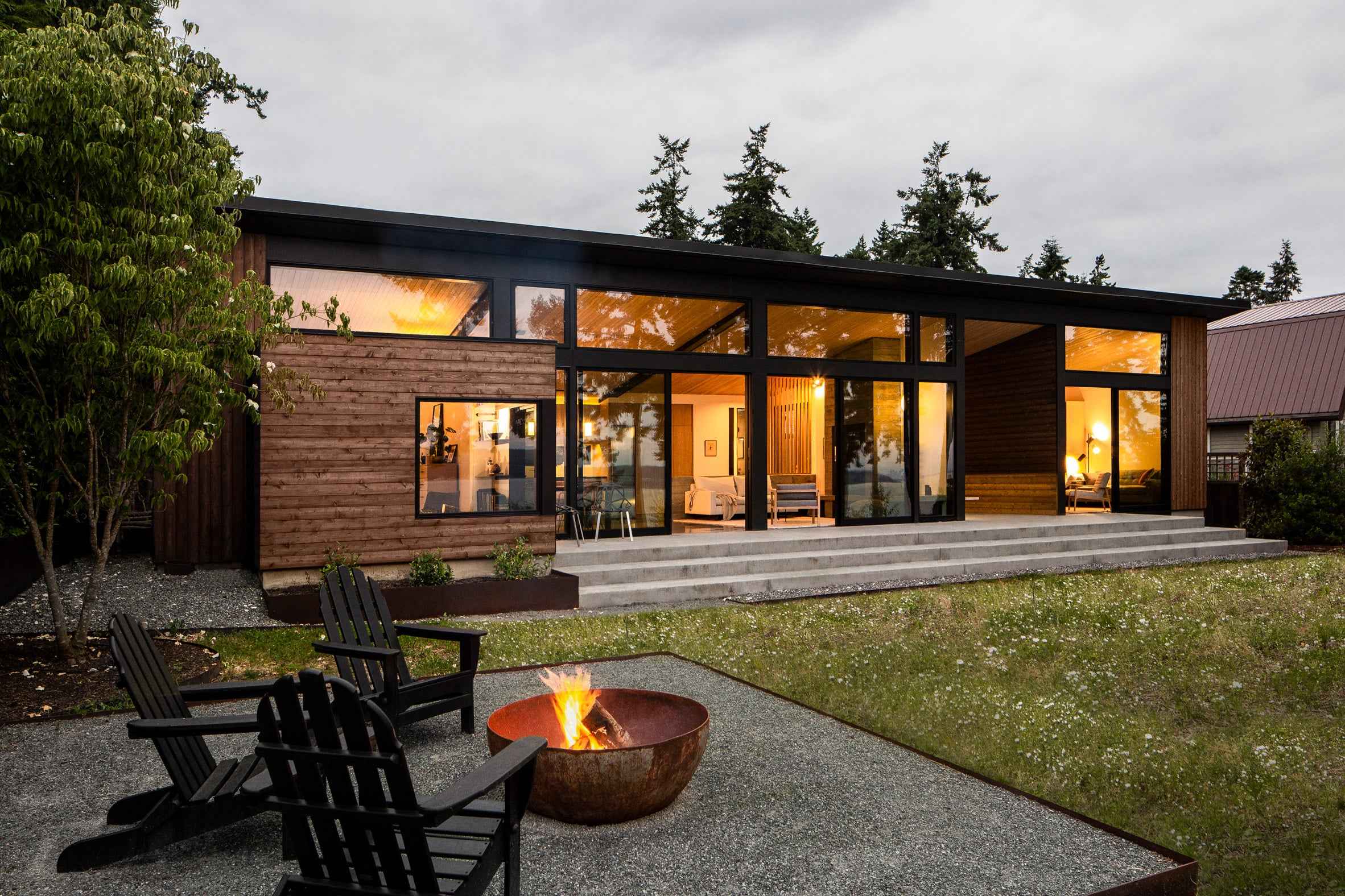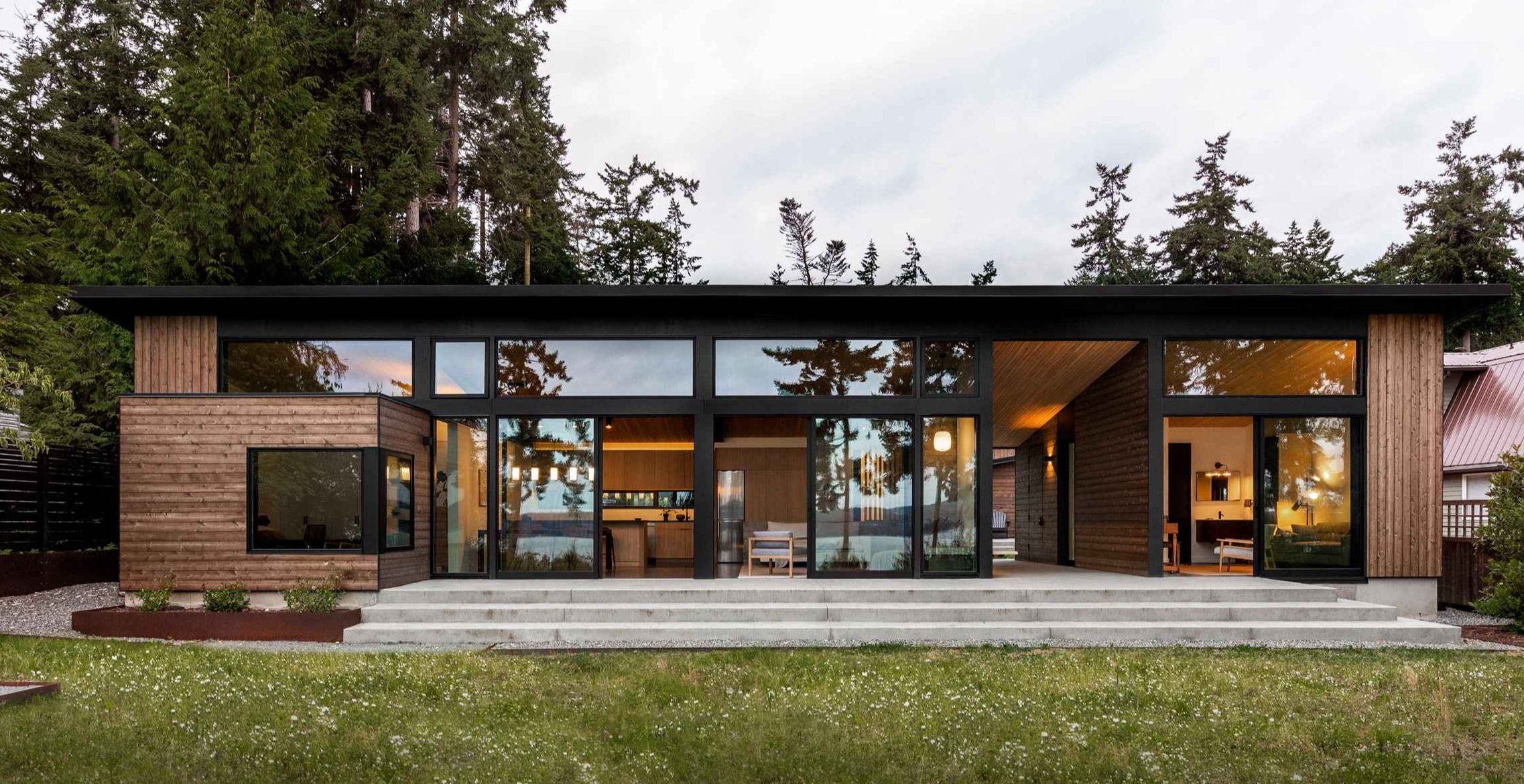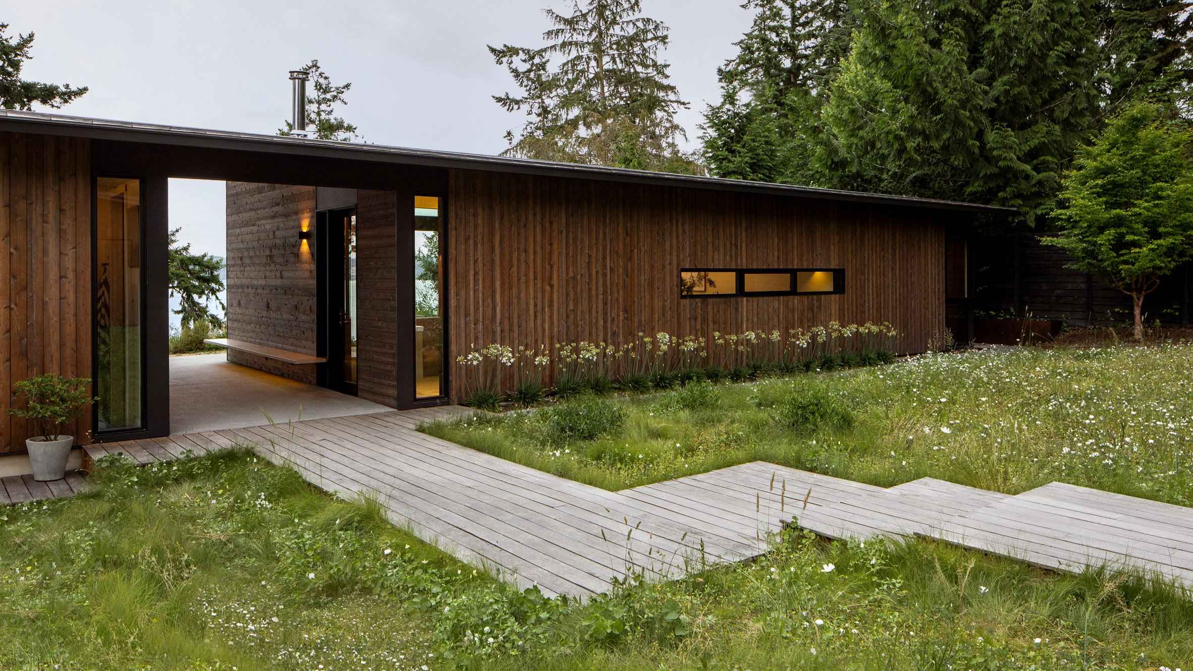 Whidbey Dogtrot to wyjątkowy projekt autorstwa SHED Architecture and Design, który powstał dla pary planującej przejście na emeryturę. Ta kompaktowa nowoczesna stodoła została zaprojektowana z myślą o funkcjonalności, prostocie i bliskości natury. Dom znajduje się na wyspie Whidbey, położonej na północ od Seattle, i góruje nad urwiskiem z panoramicznym widokiem na Puget Sound. Forma budynku czerpie inspirację z tradycyjnego amerykańskiego stylu dogtrot, z dwiema prostokątnymi bryłami oddzielonymi zadaszonym przejściem, które pełni zarówno funkcję wejścia, jak i przestrzeni półzewnętrznej.