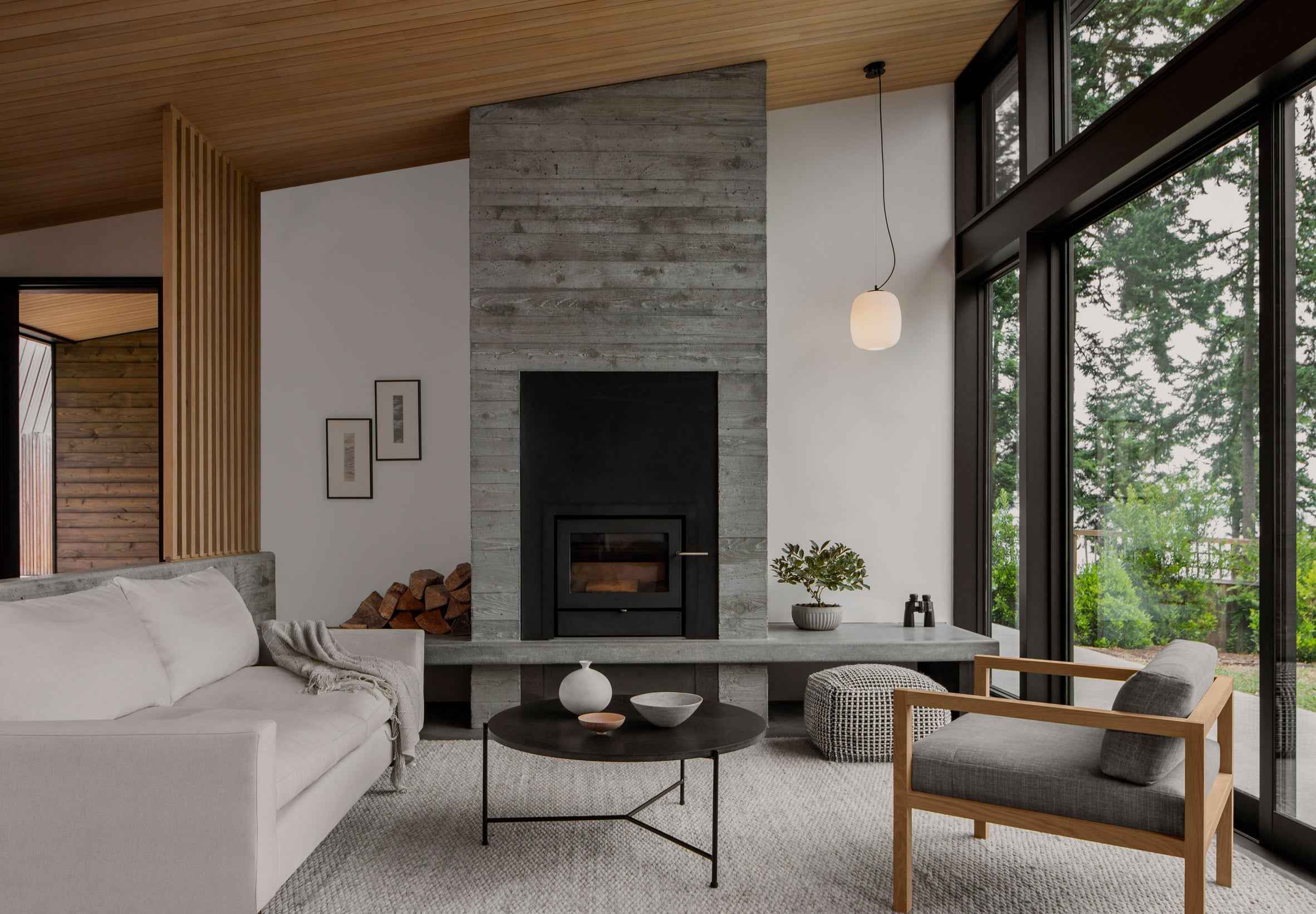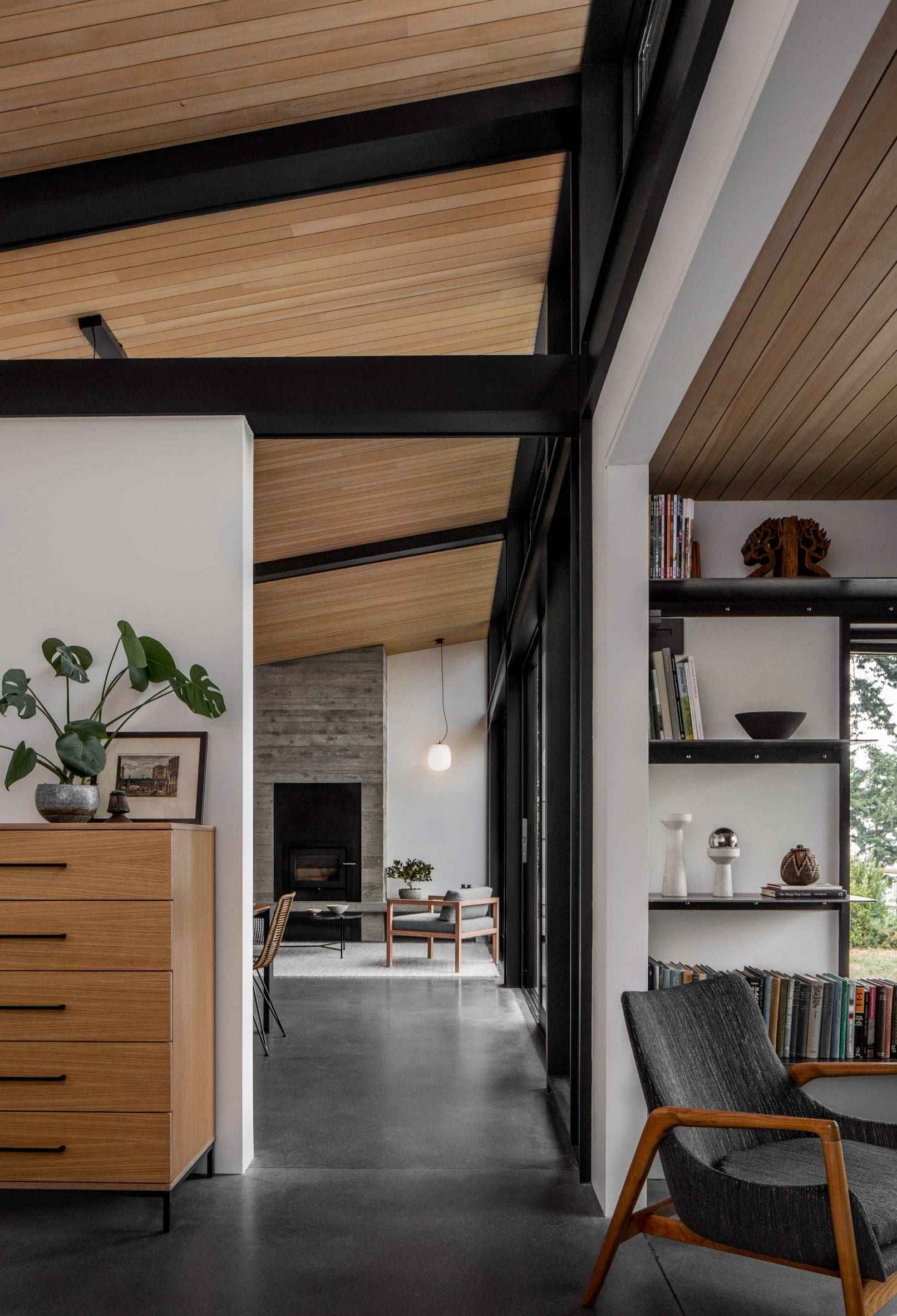 Wnętrze domu zostało utrzymane w spokojnej, neutralnej palecie kolorystycznej, z jasnymi meblami z drewna, kremowymi ścianami i betonową podłogą. Zastosowano ogrzewanie wodne, co dodatkowo podkreśla komfort użytkowania. Architekci podkreślają, że całość została precyzyjnie zaprojektowana, aby w pełni wykorzystać dostępną powierzchnię użytkową i wpisać się w naturalny kontekst wybrzeża Pacyfiku. Whidbey Dogtrot to przykład na to, że nowoczesna stodoła może być nie tylko estetyczna, ale też wyjątkowo funkcjonalna – stanowiąc idealne miejsce do życia blisko natury.