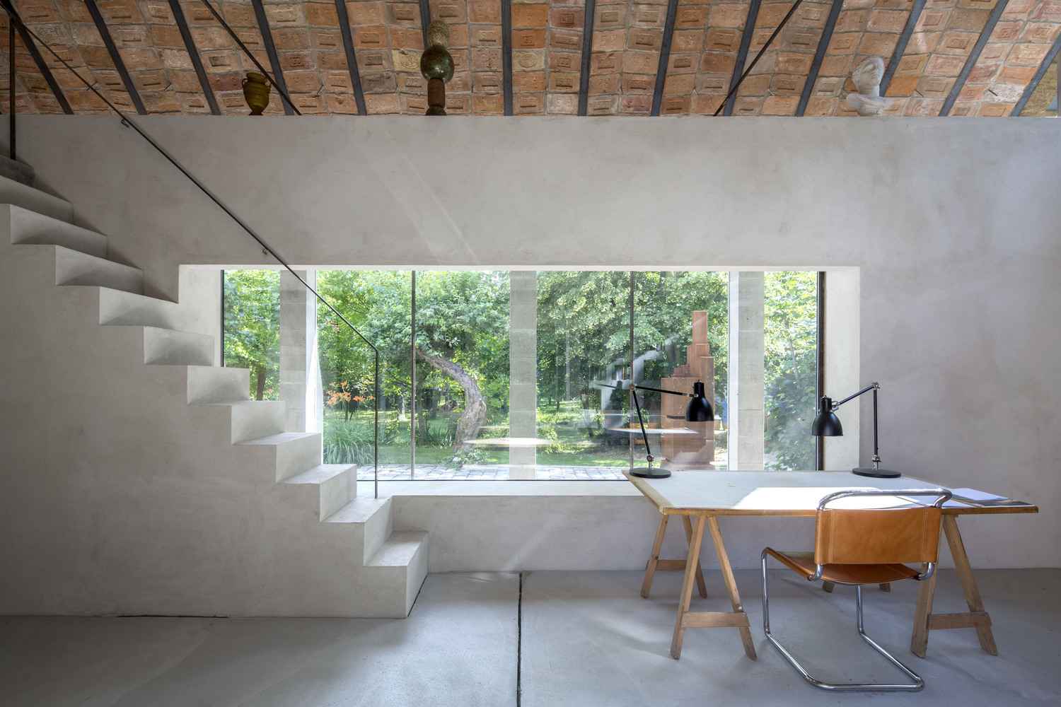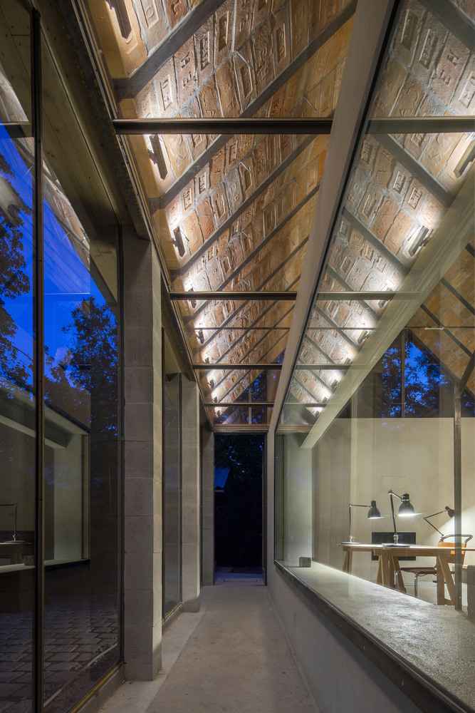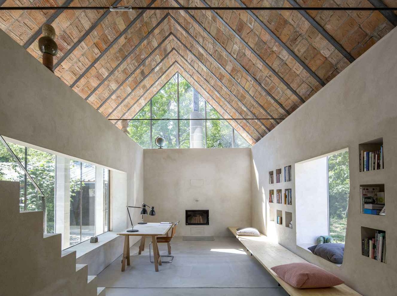 Wyjątkową wartością projektu jest masywna więźba dachowa wykonana z ręcznie formowanych cegieł o różnym pochodzeniu – ponad 2/3 powstało w lokalnej cegielni, a reszta pochodzi z nieistniejących zakładów regionu, tworząc mozaikowy efekt. Ściany z pustaków ceglanych wykończono jedynie tynkiem wapiennym, zachowując surowy charakter materiałów. Wnętrze dopełniają betonowe podłogi, prefabrykowane kolumny portyku, stalowe belki i widoczne profile konstrukcyjne, dzięki czemu budynek sprawia wrażenie celowo „niedokończonego”. Takie rozwiązania podnoszą parametry cieplne domu, a przeszklony portyk działa jak bufor termiczny, co czyni projekt szczególnym hołdem dla historii lokalnego rzemiosła cegielniczego i świadomego wykorzystania materiałów.