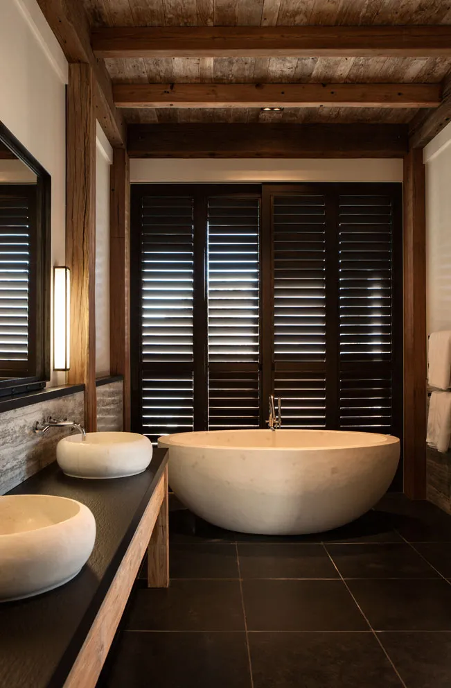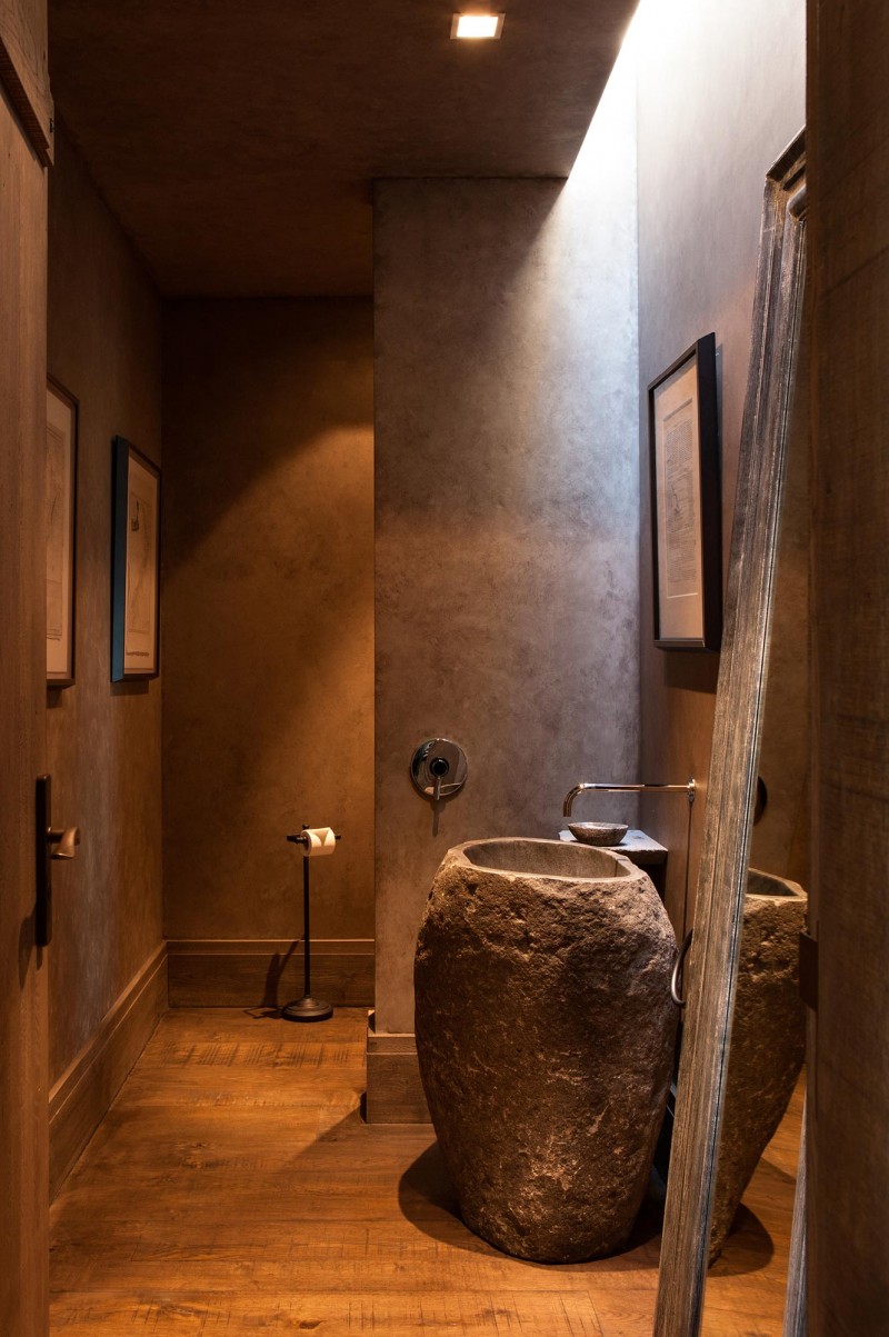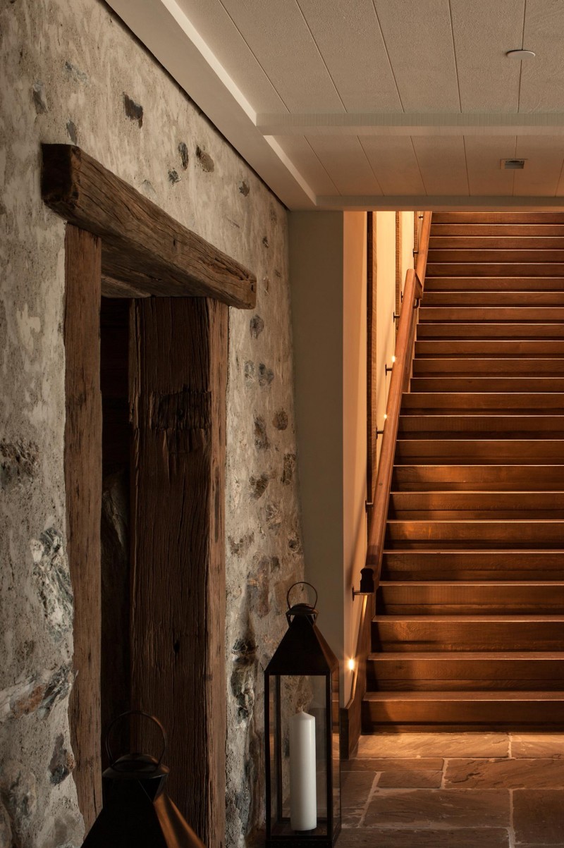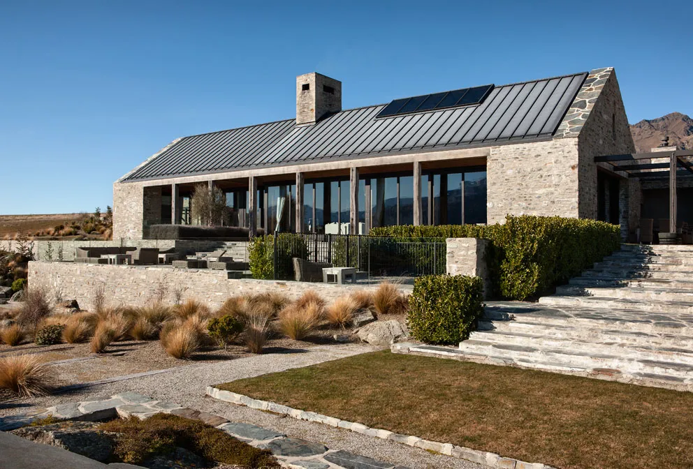 Wokół domu rozciąga się zamknięty, kamienny dziedziniec, który tworzy atmosferę ciszy i spokoju w kontraście do monumentalnej skali otaczającej przyrody. Takie rozwiązanie architektoniczne daje mieszkańcom poczucie intymności i schronienia, zanim przekroczą próg budynku. Projekt czerpie inspirację z tradycyjnych form zabudowy szczytowej charakterystycznych dla regionu Wyspy Południowej. Surowe, geometryczne bryły uzupełnia seria monumentalnych ścian z lokalnego kamienia. Roślinność została poprowadzona aż po dachy, tworząc efektowne, zielone dachy, które stapiają się z naturalnym krajobrazem.