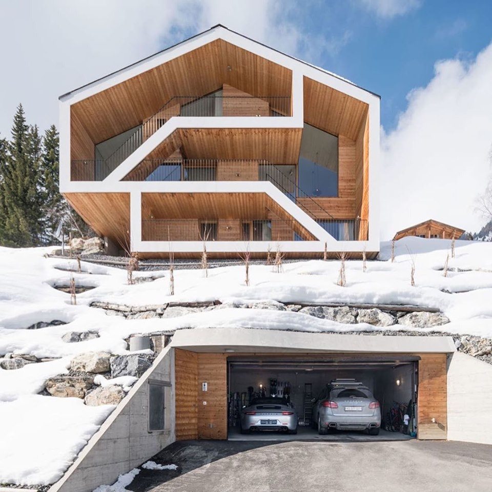 Układ wnętrz został starannie zaplanowany. Garaż przeniesiono z tyłu budynku do bardziej dostępnej części działki, a dzięki wydrążonemu w skale korytarzowi z windą możliwe jest połączenie garażu ze wszystkimi trzema kondygnacjami domu. Na najniższym poziomie znajduje się apartament gościnny, środkowa część to przestrzeń dzienna z otwartym układem, a na górze ulokowano prywatne pomieszczenia właściciela. Każdy poziom ma wyjście na przestronny taras o szerokości 3 metrów, z których roztaczają się spektakularne widoki na masyw Dent Blanche oraz legendarne szczyty Alp Szwajcarskich: Matterhorn, Dufourspitze i Weisshorn. Efektem pracy SeARCH jest luksusowy dom górski, który harmonijnie łączy tradycję i nowoczesność.
