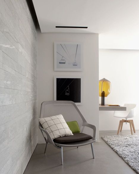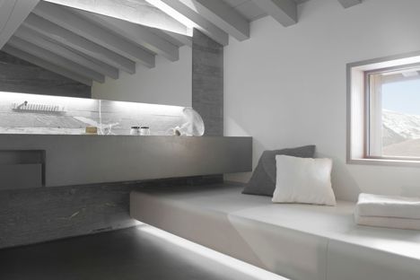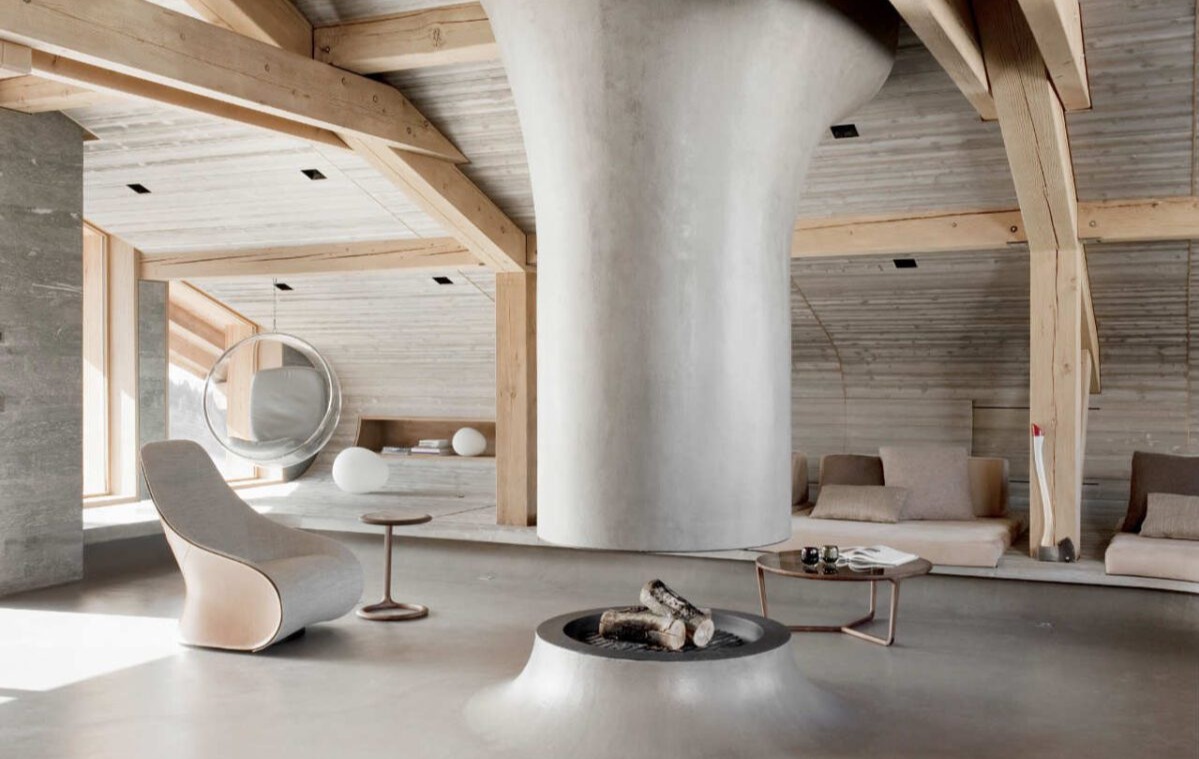 Minimalistyczne wnętrza, wykonane z naturalnego kamienia, drewna i polerowanego betonu, tworzą ciepłą, przestronną atmosferę. Centralnym punktem jest wyjątkowy kominek, który przyciąga wzrok i dodaje wnętrzu artystycznego charakteru. Duże okna zapewniają spektakularne widoki na Alpy Francuskie i wprowadzają do wnętrz dużo naturalnego światła.