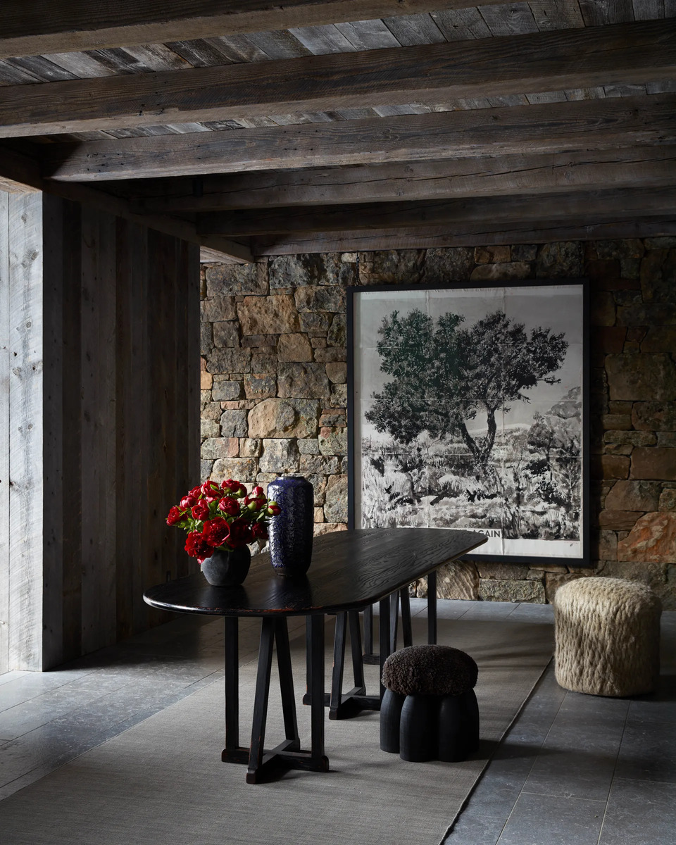 Prostota, będąca priorytetem zarówno w kwestii zdrowia i dobrego samopoczucia, jak i architektury, znalazła swoje odzwierciedlenie w tym wyjątkowym projekcie. Nowoczesna stodoła w pełni oddaje ten minimalizm, łącząc dwuspadowe formy z naturalną paletą materiałów. Mech z Montany oraz drewno z odzyskanych stodół nadają domowi charakterystyczny wygląd, doskonale wkomponowując go w otaczający krajobraz. „Nie każdemu klientowi podoba się pokryty porostami kamień i drewno z odzysku” – mówi Matthews. „Ale ponieważ w tym przypadku tak było, połączenie domu z krajobrazem jest czymś naprawdę wyjątkowym”.