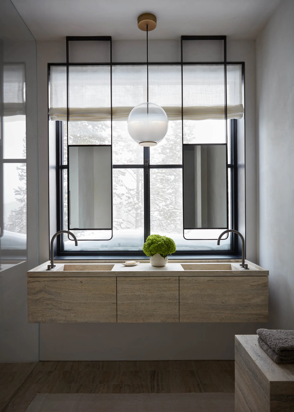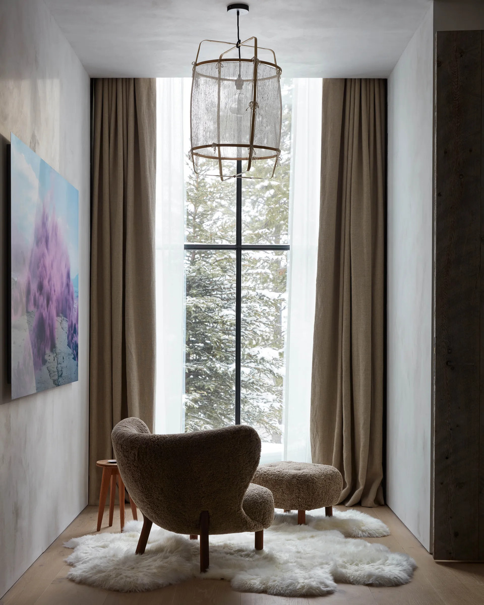 Olivia Williams zadbała o stworzenie wnętrza, które łączy elegancję z ciepłem. Jej projekt wyróżnia się delikatnie zakrzywionymi formami, które szanują otaczające widoki. Główna przestrzeń do rozmów w salonie została wyposażona w luksusowe, współczesne meble. Jednak prawdziwą atrakcją jest ogromne okno o wysokości 6,5 metra, które otwiera widok na południowy horyzont. „Kiedy masz wspaniałe widoki na naturę, wnętrza nie muszą być skomplikowane” – mówi Williams. Przez dom przebiega nić błękitu, która wprowadza subtelny kontrast do kojącego wystroju, opartego na naturalnych materiałach i kolorach inspirowanych górskim krajobrazem.