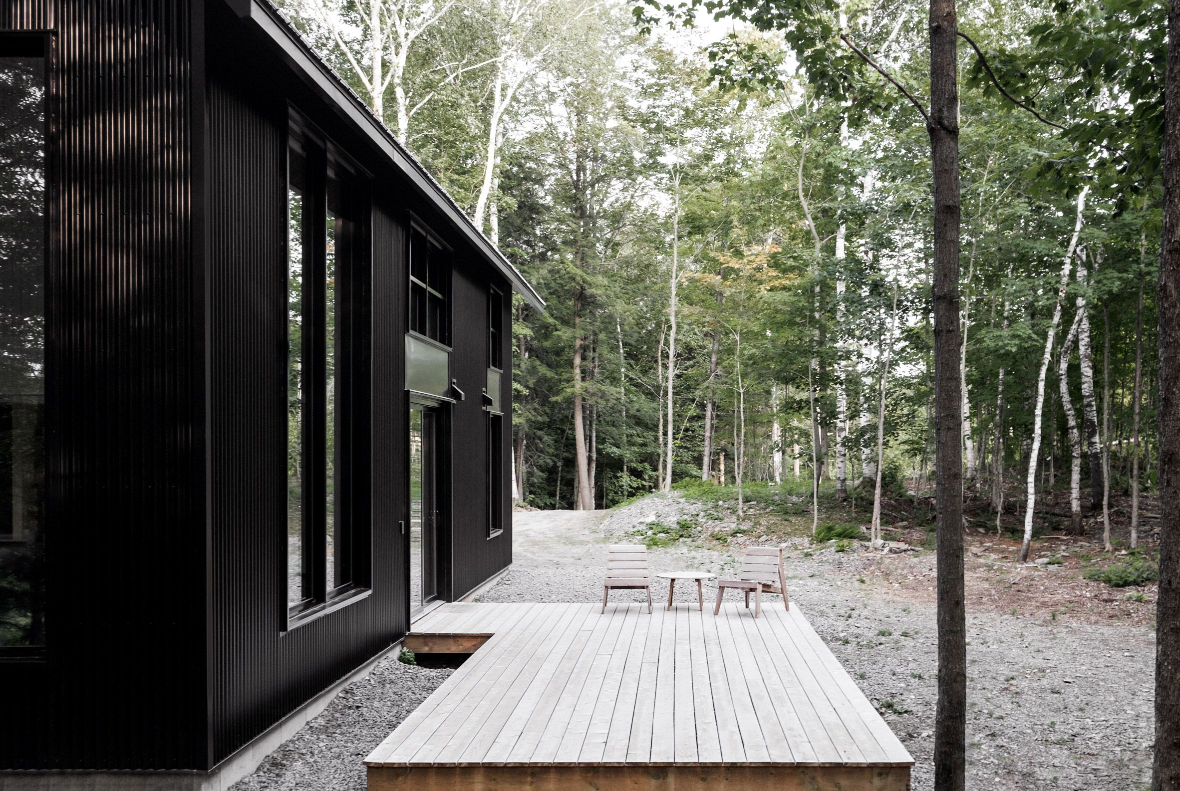 Głęboko w gęstych lasach prowincji Quebec, w górzystym regionie Austin przy granicy z amerykańskim Vermont, studio Appareil Architecture zaprojektowało wyjątkowy kompleks o nazwie Chalet Grand-Pic. W skład realizacji wchodzą dwa budynki: czarna nowoczesna stodoła pełniąca funkcję głównego domu oraz mniejsza leśna chata. Obie bryły połączone są tarasem z cedrowego drewna, wzniesionym lekko nad ziemią, który służy zarówno jako ścieżka, jak i miejsce spotkań towarzyskich. Elewacje budynków pokryto błyszczącą, czarną blachą falistą, a dachy wykończono stalą w kolorze ciemnej szarości, co tworzy nowoczesny, ale subtelnie rustykalny klimat, harmonizujący z naturalnym otoczeniem.