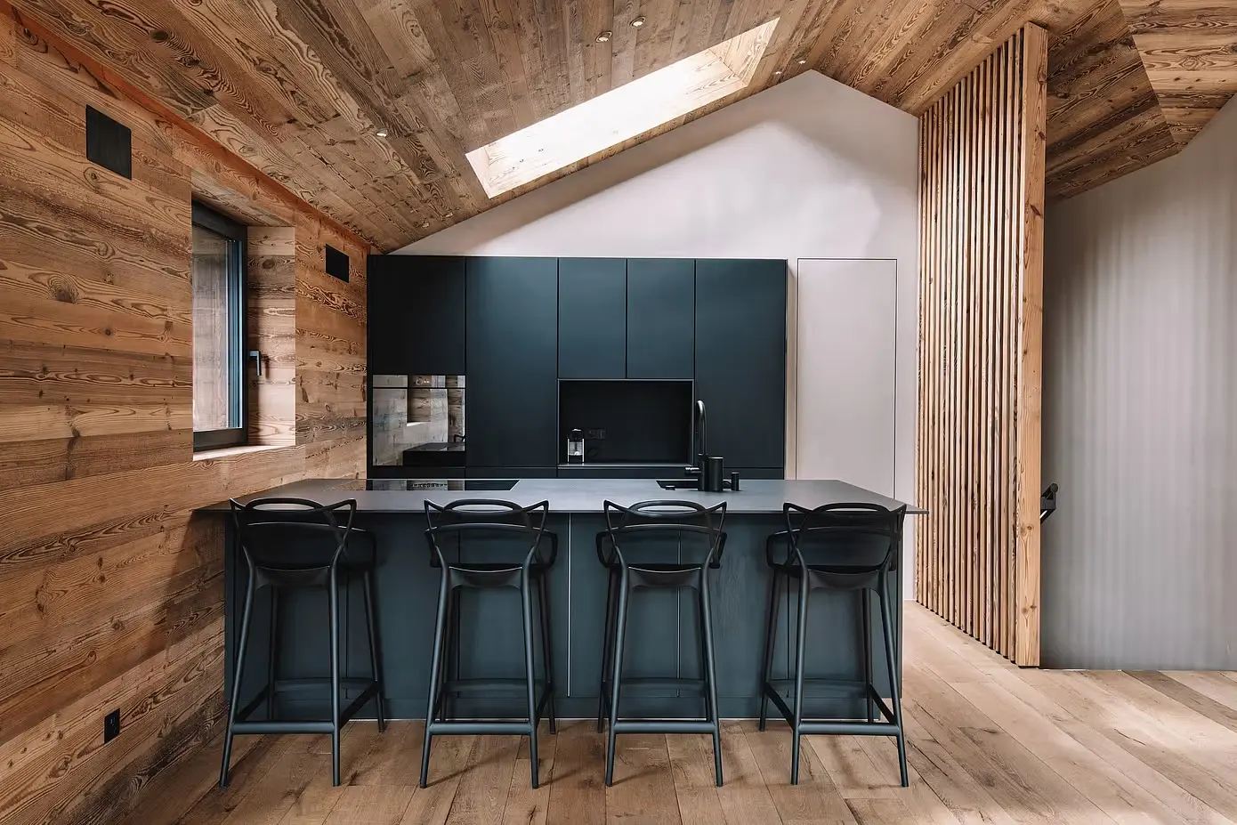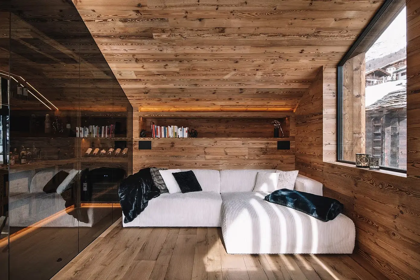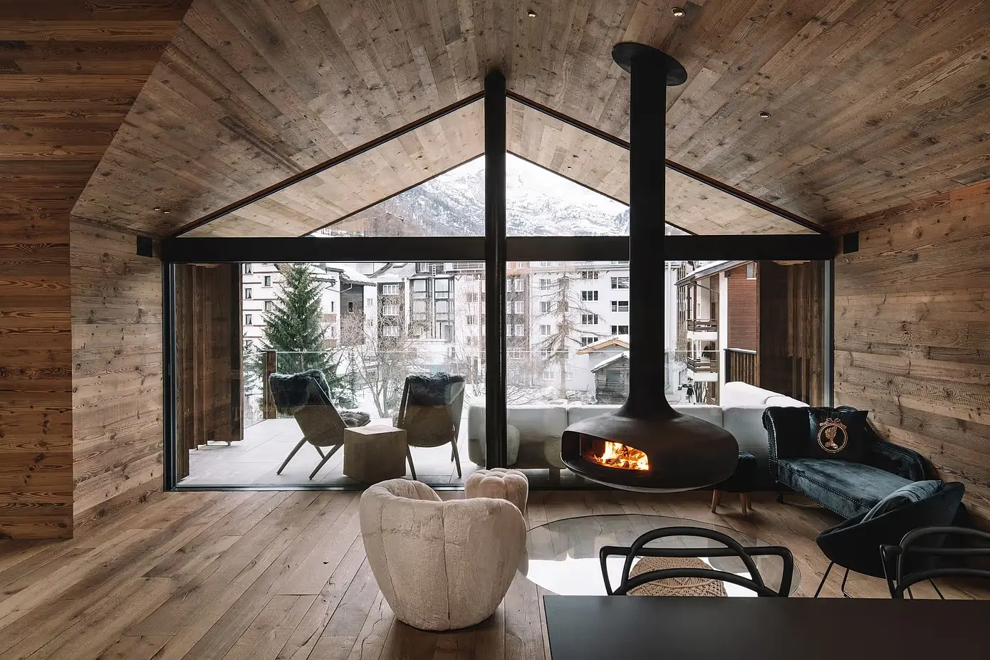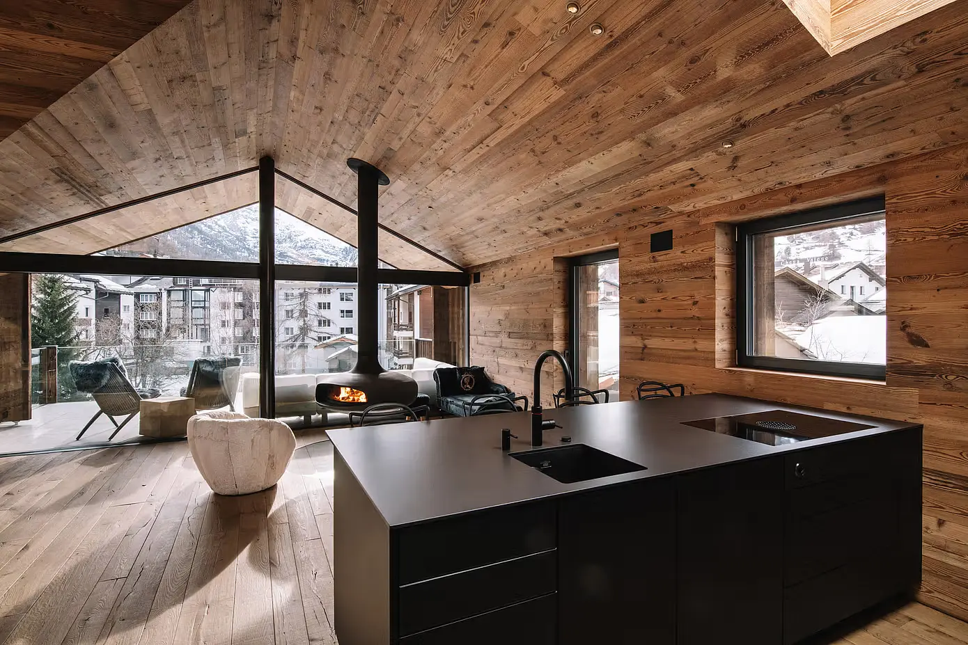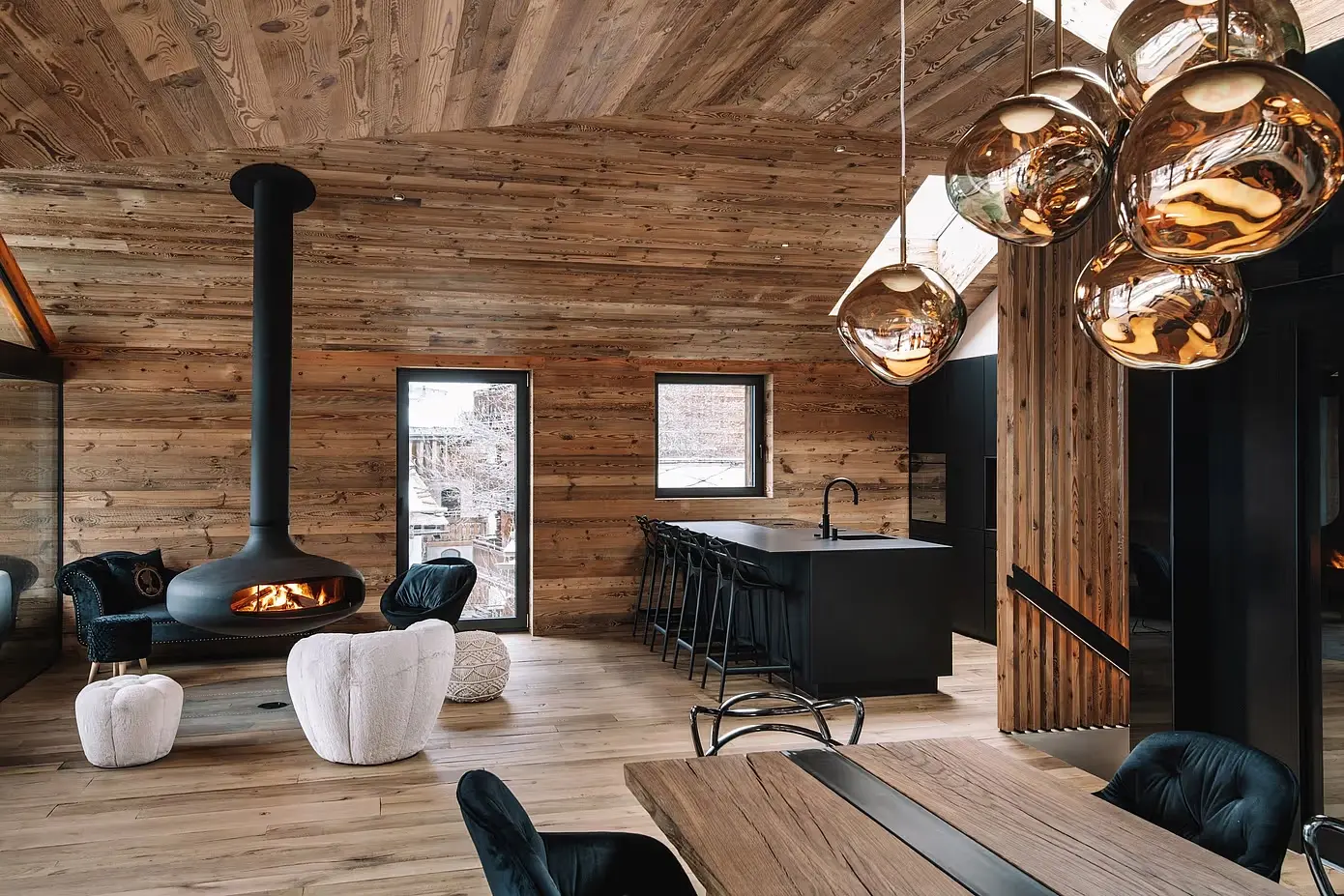 Chalet Nirvana to nowy standard w projektowaniu domów alpejskich w Zermatt w Szwajcarii. Domek ten harmonizuje rustykalną elegancję ze współczesnym luksusem, zaczynając od salonu. Postarzane drewno i eleganckie czarne wykończenia kuchni płynnie się ze sobą łączą, zakotwiczone przez efektowny podwieszany kominek. Ta funkcja nie tylko dodaje ciepła, ale także służy jako punkt centralny, zachęcając do relaksu i wspólnych spotkań.