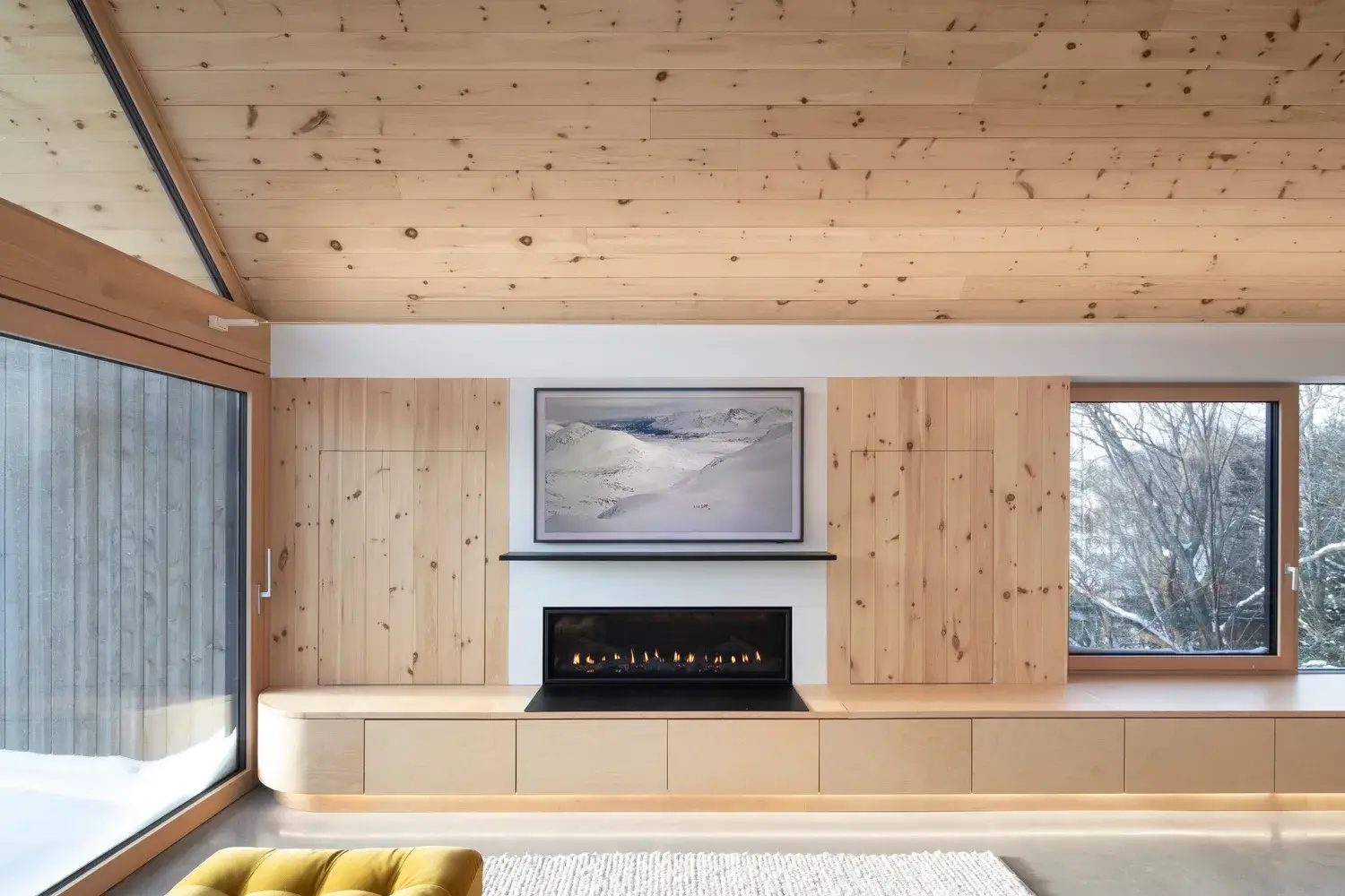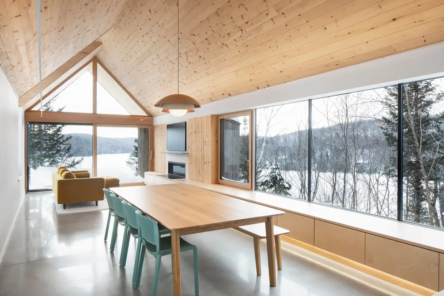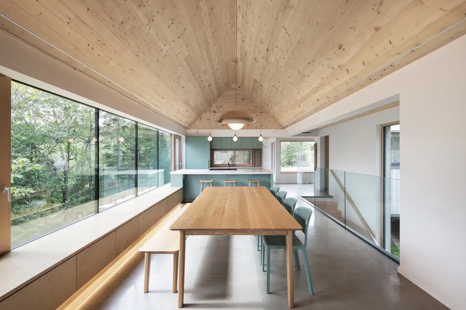 W całym wnętrzu domu lekkie materiały i minimalistyczne detale tworzą wrażenie przestronności. Białe ściany, betonowe podłogi i jasne drewno tworzą we wnętrzu jasną i przestronną atmosferę. Główne przestrzenie mieszkalne znajdują się na górnym poziomie, który jest w dużej mierze otwarty i zalany światłem dziennym. Skośny, wyłożony drewnem sufit nawiązuje do kształtu dachu na zewnątrz i przyciąga wzrok dramatycznym widokiem na jego końcu. Długi pas przeszkleń zapewnia panoramiczny widok na wodę. Niestandardowe wbudowane siedzenia ze sklejki biegną pod oknem, tworząc miejsca, w których można podziwiać krajobraz.