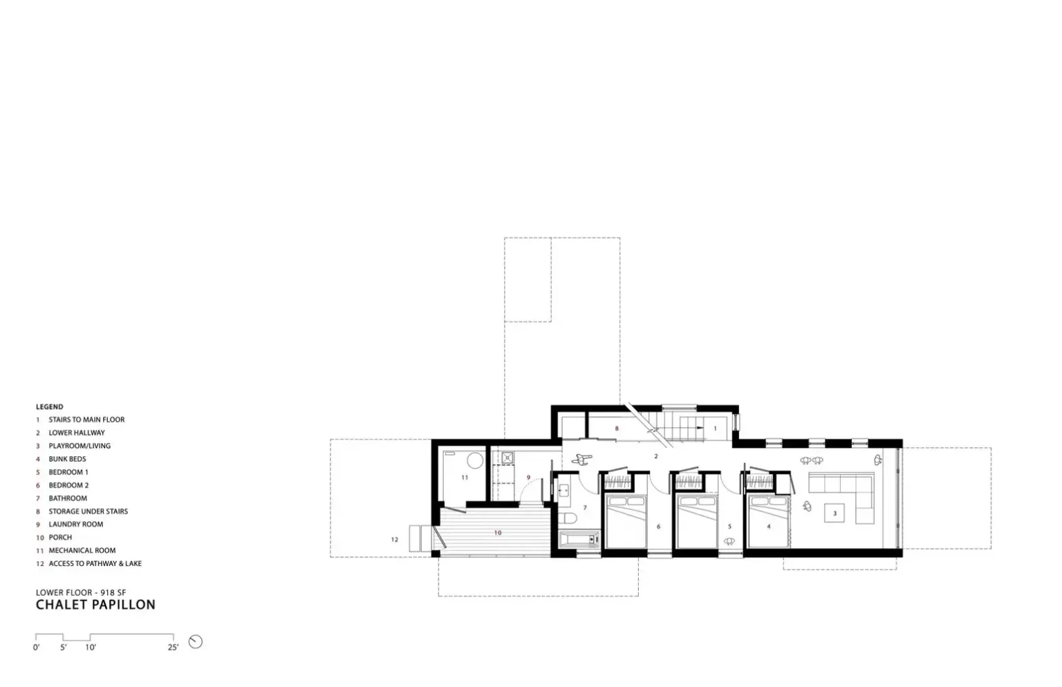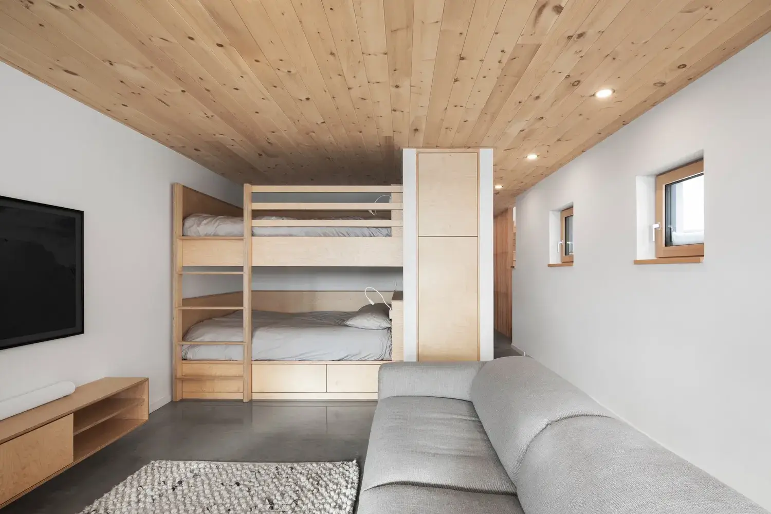 Na przeciwległej elewacji północnej starannie rozmieszczono wysokie okna panoramiczne, tak aby kadrowały widok na drzewa i wprowadzały dodatkowe światło dzienne. W nocy para delikatnie cienkich elementów oświetleniowych równomiernie oświetla drewniany sufit w salonie, tworząc ciepłą i zachęcającą atmosferę. Główna sypialnia jest również schowana z tyłu tej głównej bryły. Na parterze znajdują się trzy piętrowe sypialnie, łazienka, pomieszczenie pomocnicze i dodatkowy przytulny salon. Każda z kompaktowych sypialni, starannie ułożona w rzędzie, ma duże okno i garderobę, do której można wejść z korytarza. Przy takiej konfiguracji w domku może nocować 12 osób.