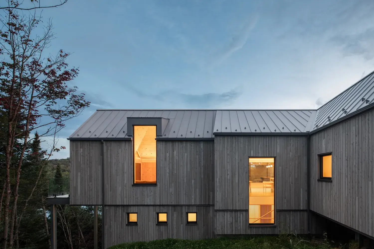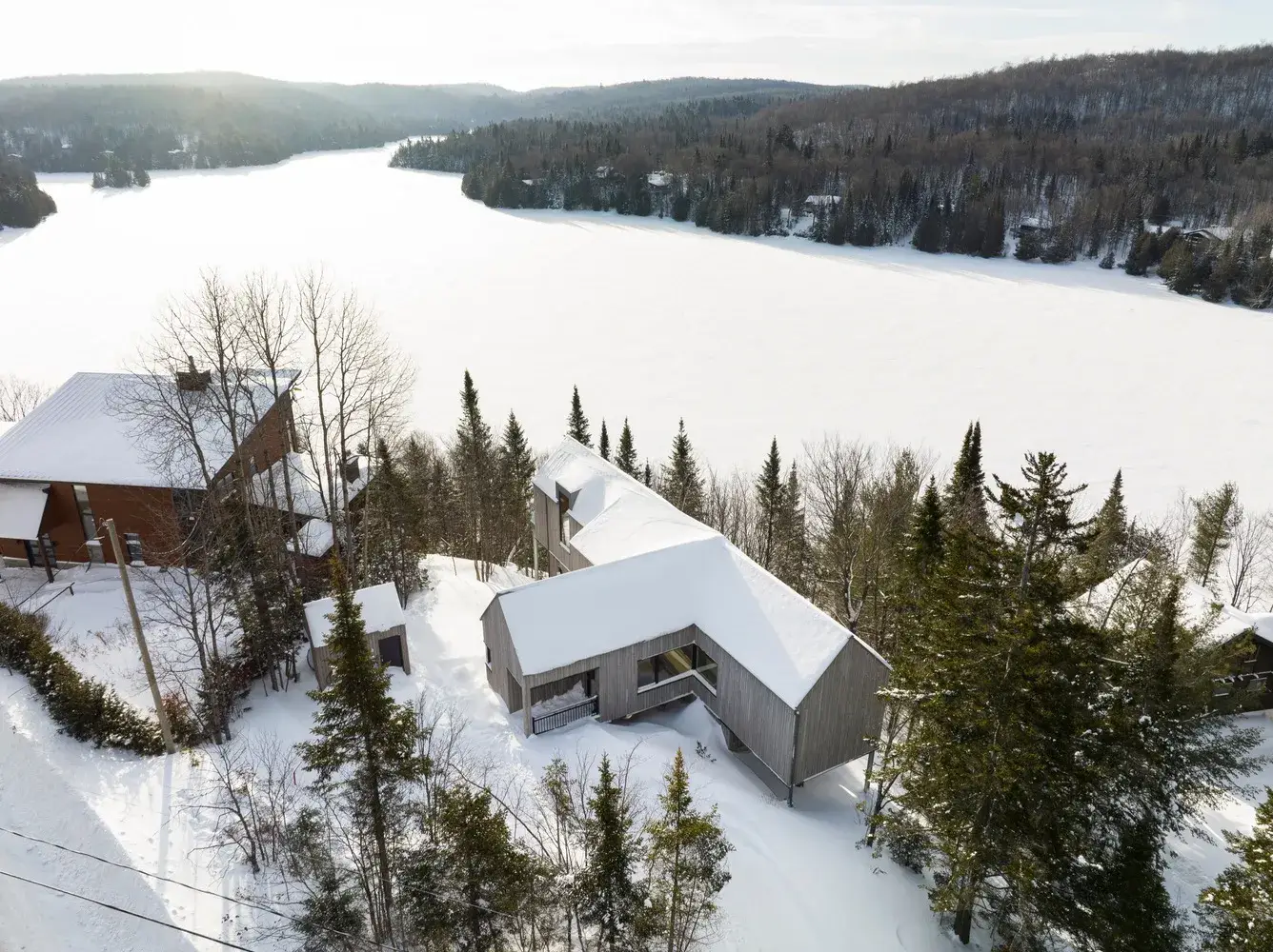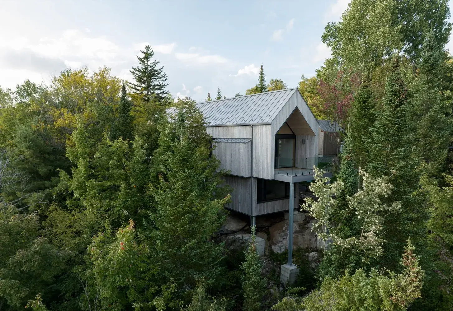 Powstały dwukondygnacyjny dom w górach składa się z długiej bryły i przylegającej do niej prostopadłej bary wejściowej prowadzącej od strony parkingu. Taki układ umożliwia widok na jezioro z dwóch wzniesień. Wschodni kraniec wystaje spomiędzy drzew jako dramatyczny balkon wzniesiony ponad 25 metrów nad wodą. Wybrano okładzinę cedrową, aby pasowała do szarych odcieni kory drzewa. Metalowy dach na rąbek stojący stanowi kontynuację tej palety kolorów, zapewniając jednolity wygląd. Rezultatem jest dom stanowiący jedność z otoczeniem.