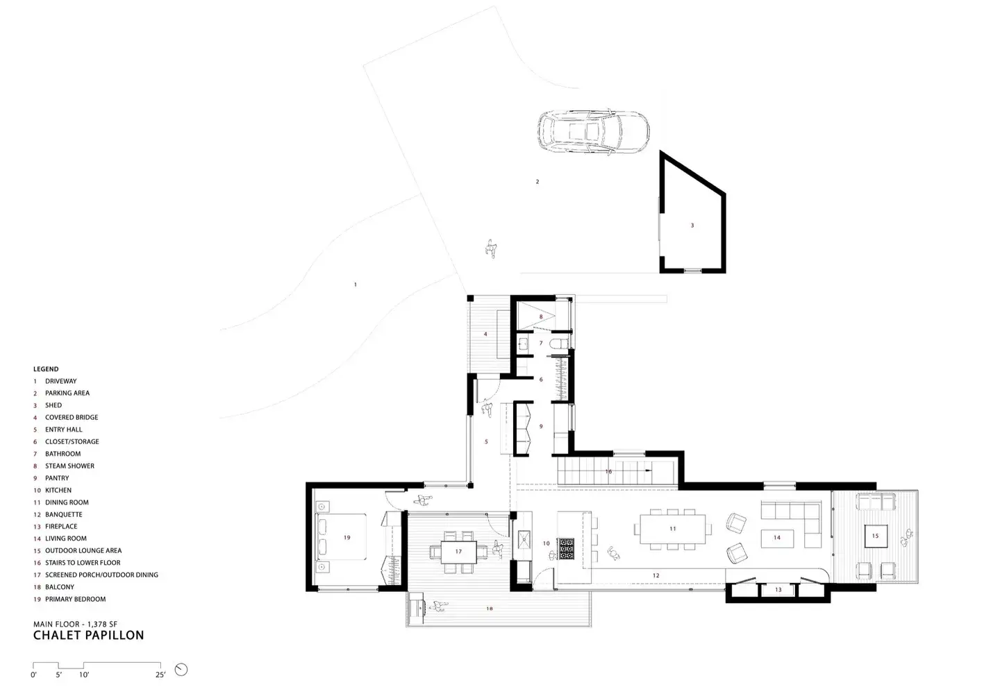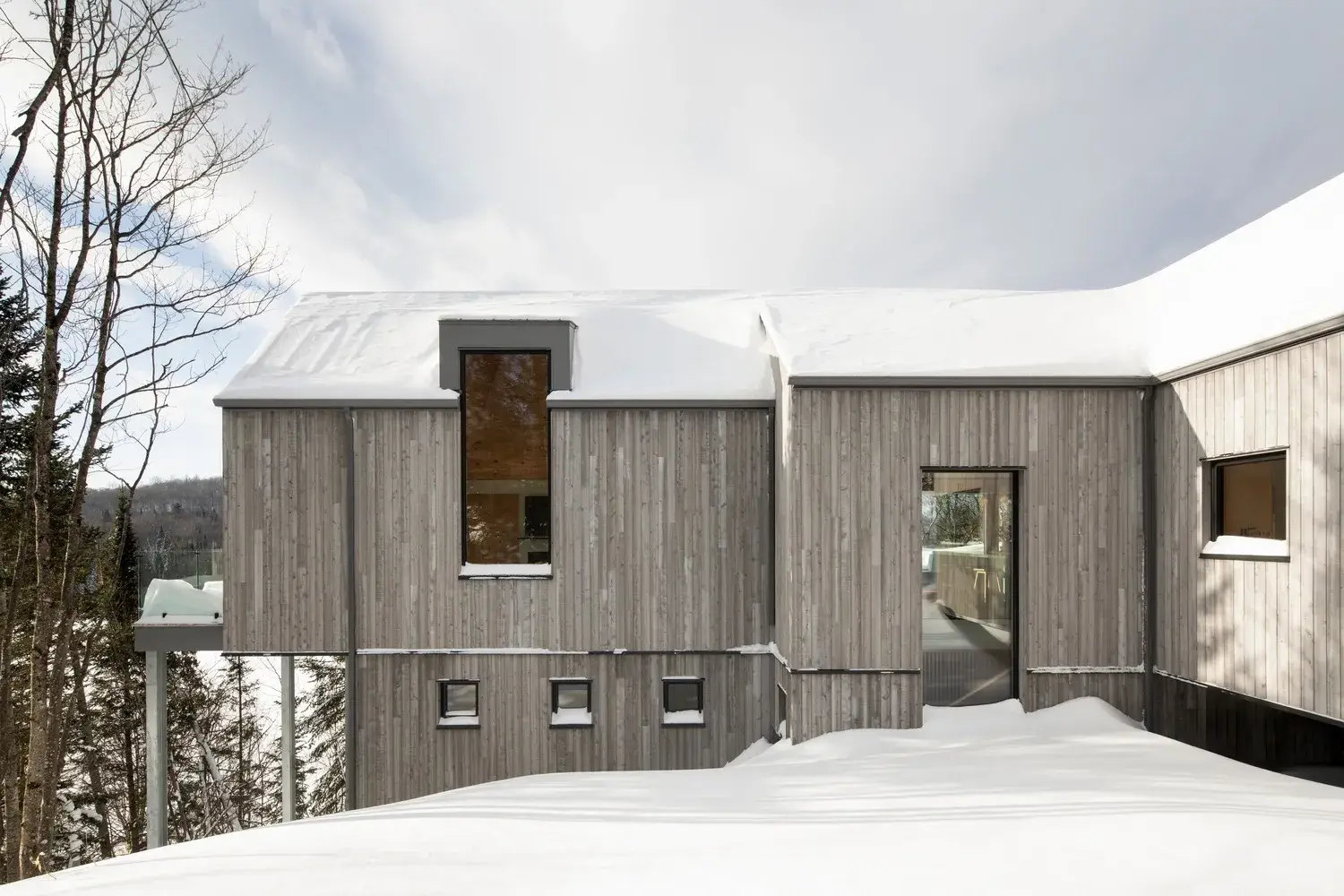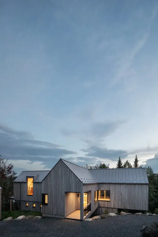 Powstały dwukondygnacyjny dom w górach składa się z długiej bryły i przylegającej do niej prostopadłej bary wejściowej prowadzącej od strony parkingu. Taki układ umożliwia widok na jezioro z dwóch wzniesień. Wschodni kraniec wystaje spomiędzy drzew jako dramatyczny balkon wzniesiony ponad 25 metrów nad wodą. Wybrano okładzinę cedrową, aby pasowała do szarych odcieni kory drzewa. Metalowy dach na rąbek stojący stanowi kontynuację tej palety kolorów, zapewniając jednolity wygląd. Rezultatem jest dom stanowiący jedność z otoczeniem.