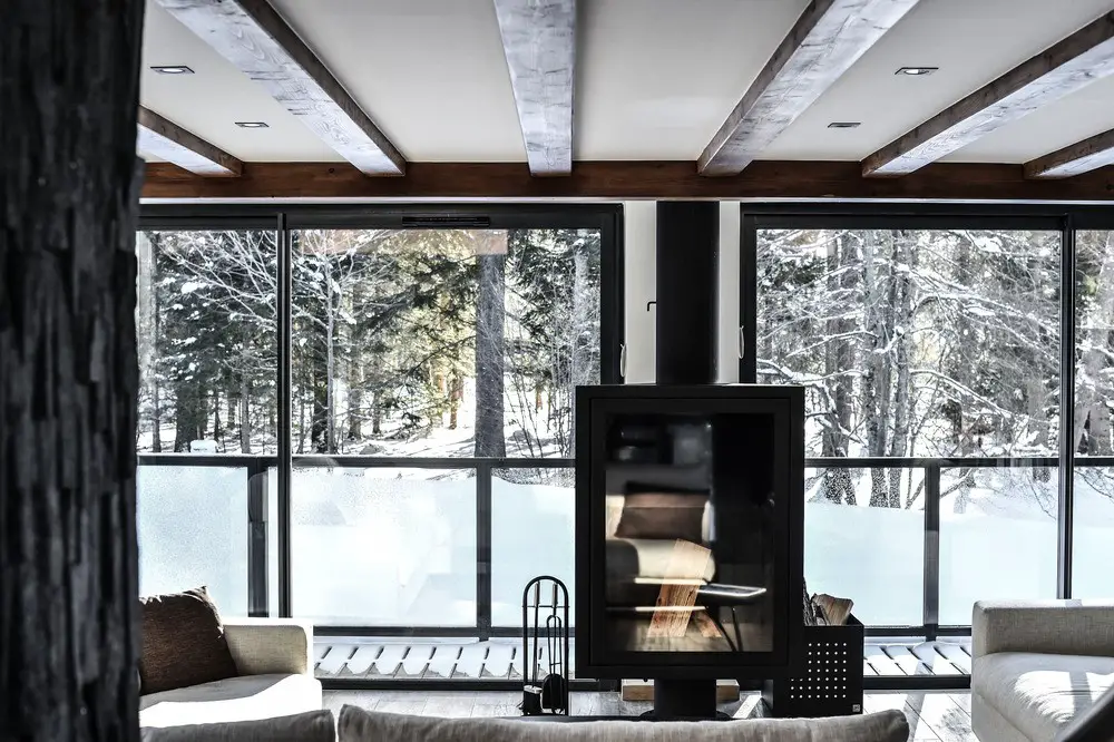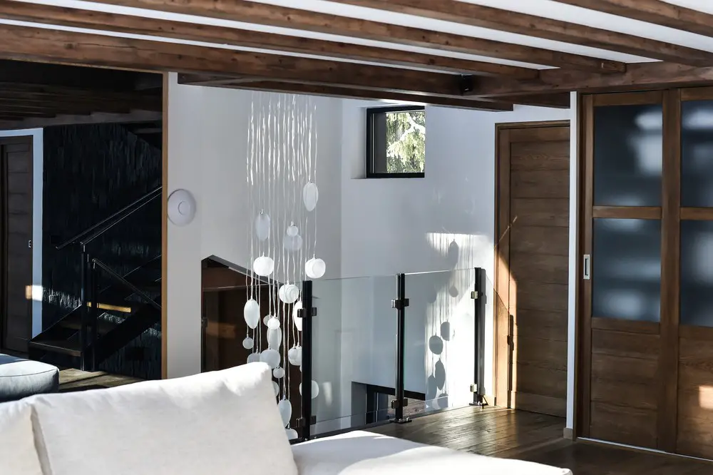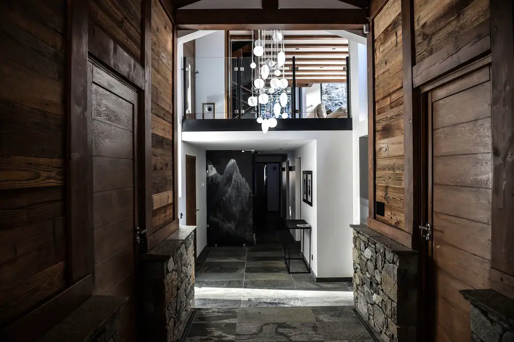 Antresola, która jest zawieszona nad częścią wypoczynkową, jest przykładem rozwiązania, które zostało wprowadzone, by spełnić jedno z oczekiwań właściciela – bez robienia tego kosztem widoku na góry Aiguilles de Chamonix. Z tego samego powodu architekci zaplanowali też projekt tak, by górskie szczyty były widoczne także z kuchni, a nawet z basenu, który znajduje się w piwnicy. Zgodnie z takim założeniem jedna ze ścian w kuchni to szklany panel, a nad basenem wstawiono okno, które również zapewnia spektakularną scenerię. Kamienna podmurówka łączy stare i nowe elementy.