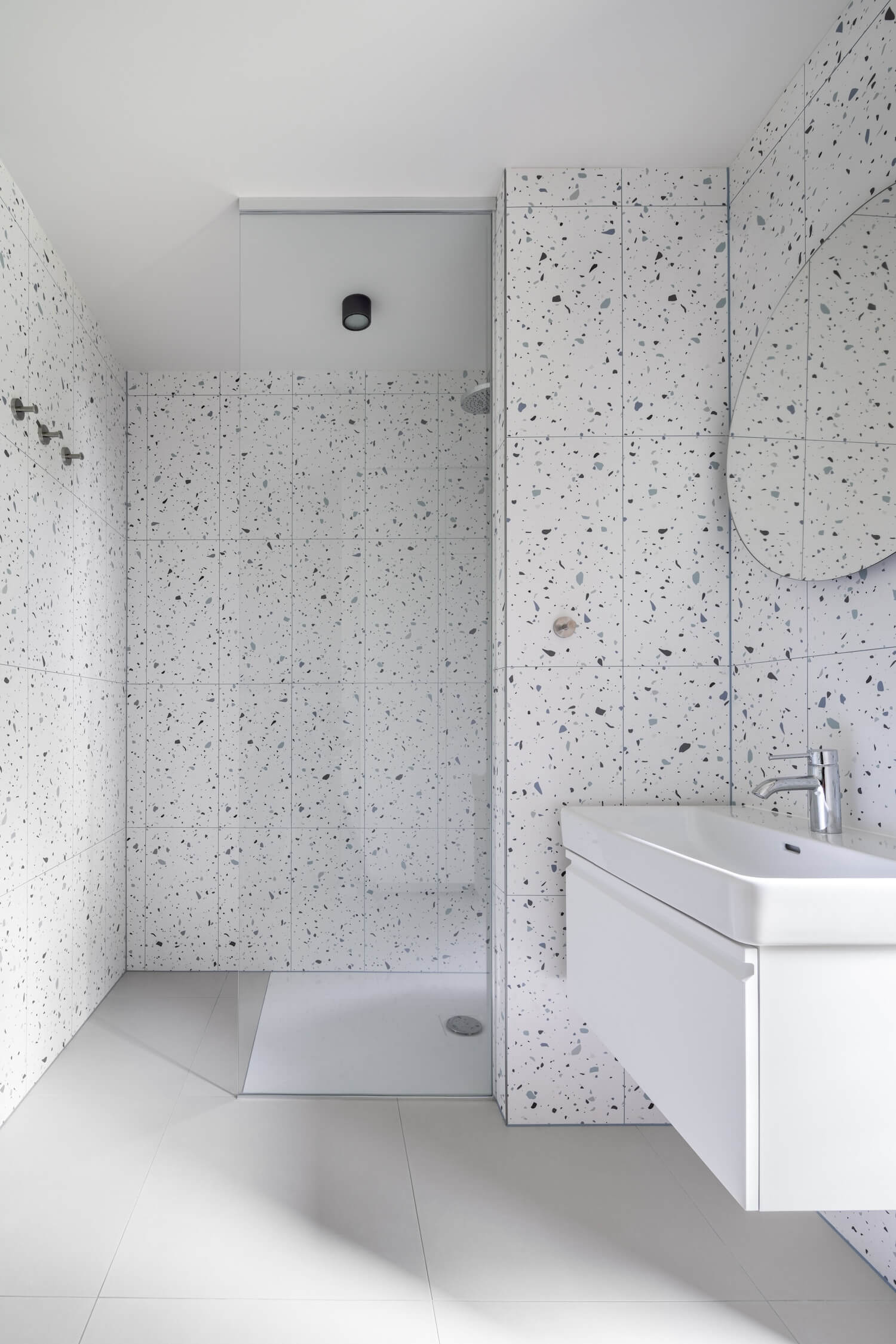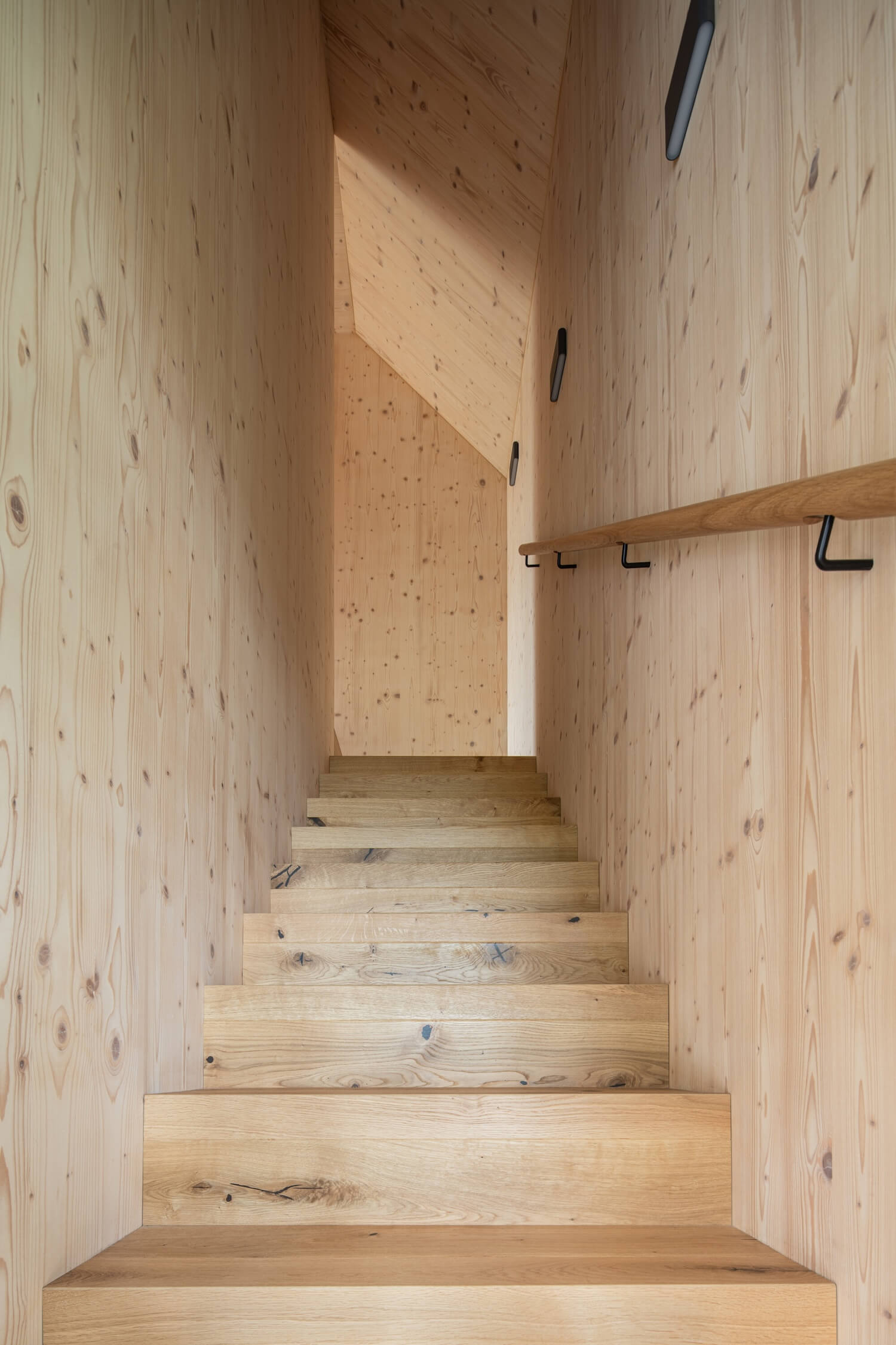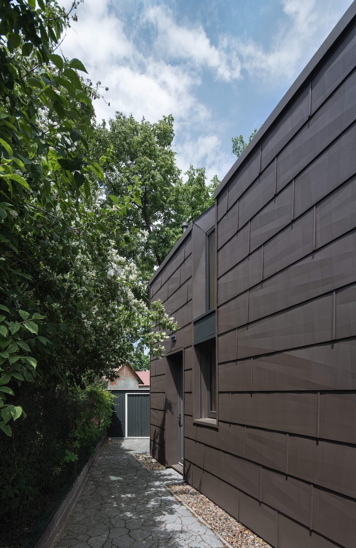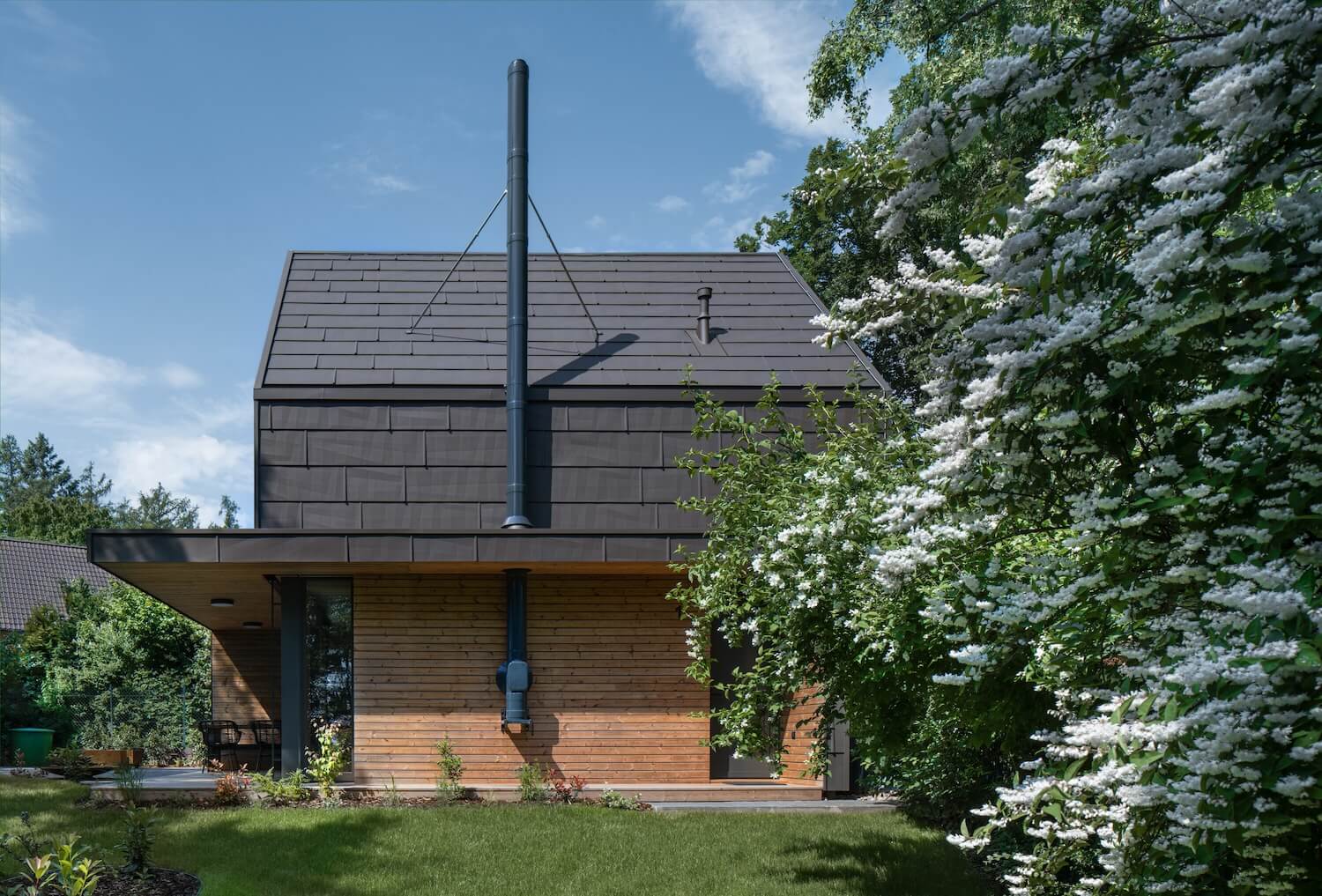 Ze względu na lokalne przepisy, które ograniczały maksymalną powierzchnię zabudowy i wysokość obiektu, projektanci postanowili zastosować archetypową formę kabiny – prostą, ale jednocześnie wyrazistą. Tak powstała bryła, która przypomina szyszkę, pokryta ciemnym, aluminiowym gontem, subtelnie nawiązującym do faktury i koloru otaczających ją drzew. To rozwiązanie nie tylko doskonale wpisuje się w kontekst naturalny, ale również zapewnia łatwość konserwacji, trwałość i odporność na warunki atmosferyczne – kluczowe aspekty przy projektowaniu domów letniskowych w stylu nowoczesnej stodoły.