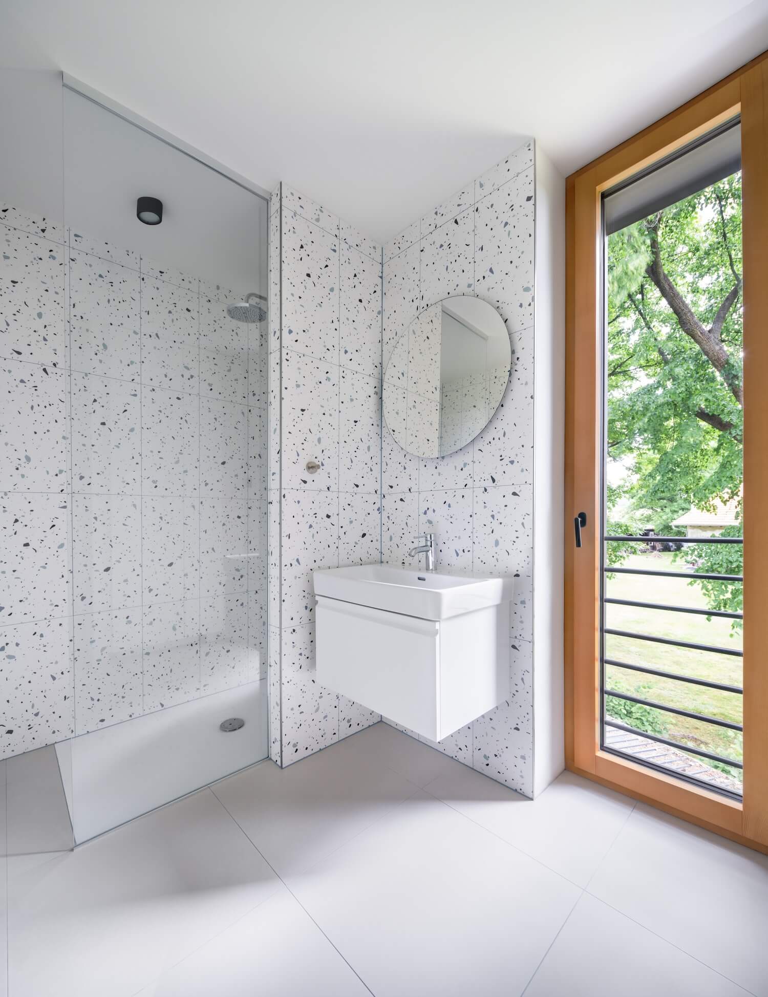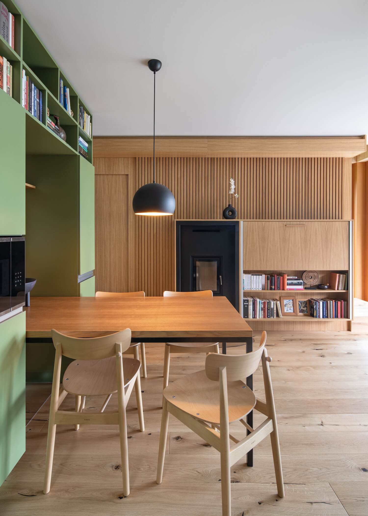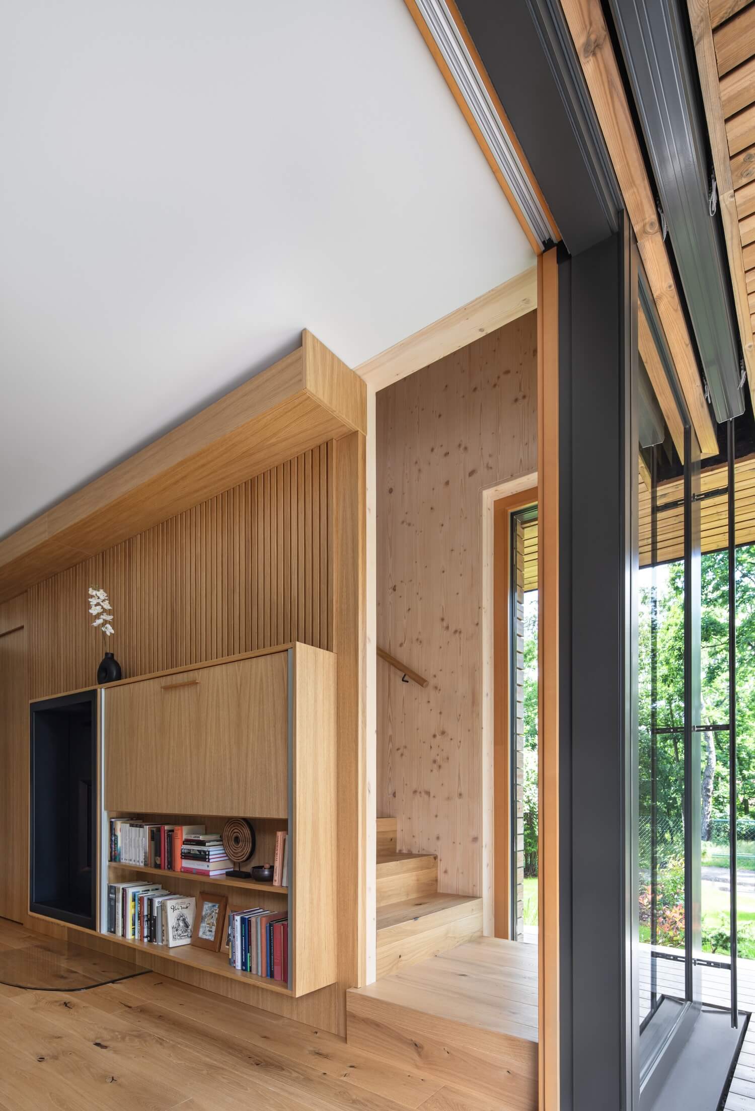 Szacunek do natury wyraża się również w przemyślanym układzie funkcjonalnym. Duże szklane powierzchnie przesuwne łączą wnętrze z zewnętrzem, otwierając salon na leśne otoczenie i wpuszczając do środka mnóstwo naturalnego światła. To szczególnie ważne dla właścicielki, która w domku oddaje się swojej pasji – malarstwu. Przestrzeń dzienna została zaprojektowana tak, by wspierać kreatywność, zapewniać ciszę i odpowiednie warunki do twórczej pracy.