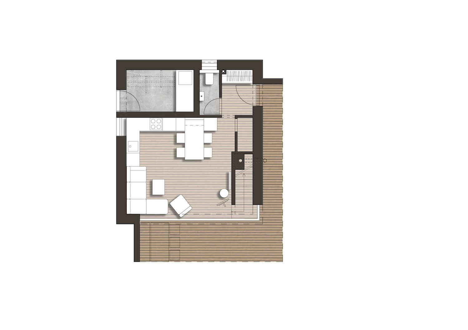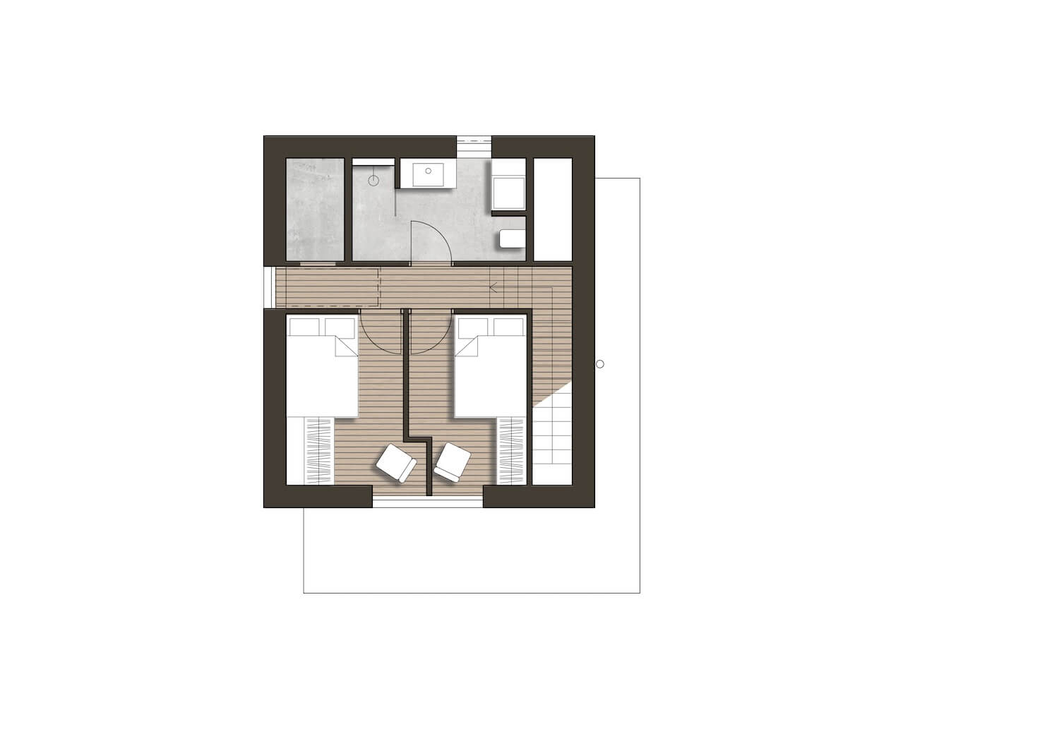 Mimo niewielkiego metrażu, domek oferuje wszystko, czego potrzeba do komfortowego wypoczynku – od przytulnych zakątków, przez funkcjonalne rozwiązania, aż po nowoczesne, trwałe materiały. Projekt to połączenie współczesnej architektury, praktycznego podejścia do przestrzeni i głębokiego szacunku do otaczającej przyrody.