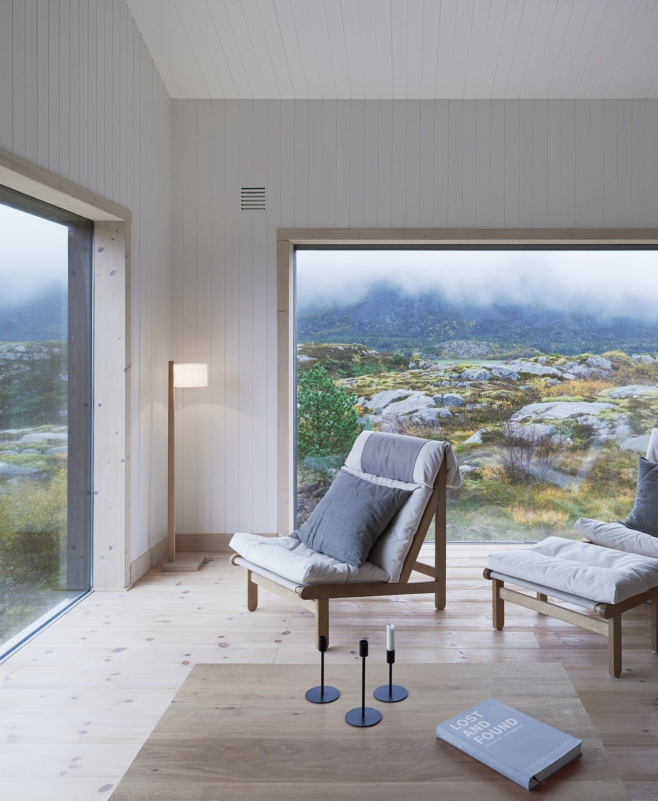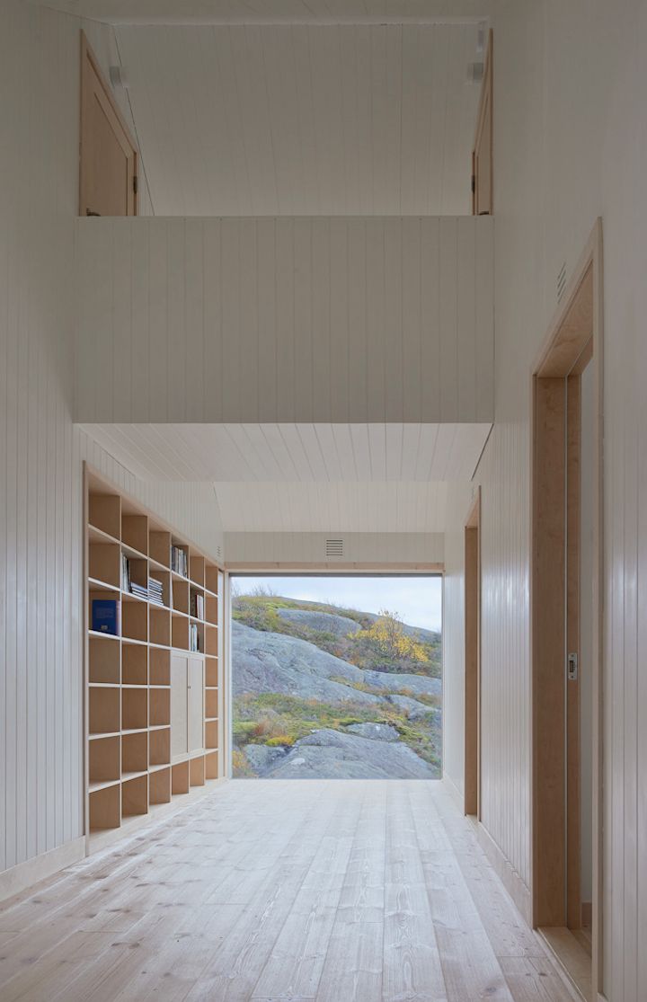 Dom, który wyraźnie wyrasta z otaczającego go krajobrazu, został wbudowany w granitowe ramię skalne, które wpisuje się w nierówną okolicę. By nie zakłócać głównego widoku na morze, wejście do domu poprowadzono przez wąski, naturalny jar, gęsto zarośnięty powykręcanymi krzewami i wysypany piaskiem z pobliskiego wybrzeża. Krajobraz wokół pozostaje wciąż dziewiczy i dziki. Duże okna wychodzą w trzech kierunkach, z których każdy może pochwalić się wyjątkowymi, choć różnymi widokami. Okna są proste i zarazem mocne w wykończeniu, a białe szkło pozwala przeobrazić je w niczym niezakłóconą ramę dla oceanu, łańcuchów górskich, czy położonych za nimi skał. Dom zorganizowany jest na dwóch poziomach, przystosowując się do terenu. Jego plan jest kompaktowy, zapewniając sporą przestrzeń na ograniczonej powierzchni. Wyższy poziom składa się z mniejszych sypialni i pokoi rodzinnych, a poziom niższy to duża otwarta przestrzeń w stylu galerii, otaczająca kamienne palenisko. Budynek został wykończony deską sosnową pomalowaną farbą na bazie oleju lnianego, z listwami brzozowymi i framugami – wnętrze zachowuje subtelny charakter przy jakości ręcznego wykonania – podkreślając namacalną jakość i atrakcyjną powłokę, która powstaje wraz z upływem czasu.